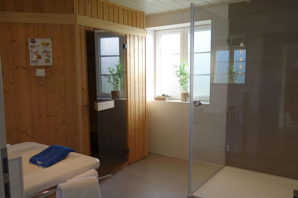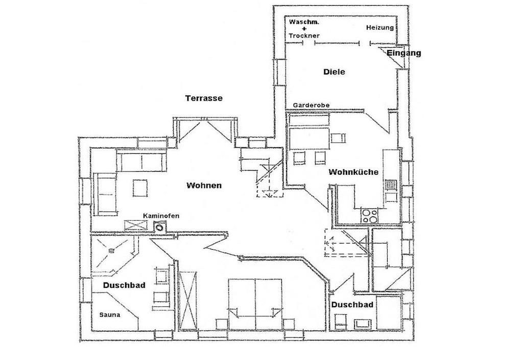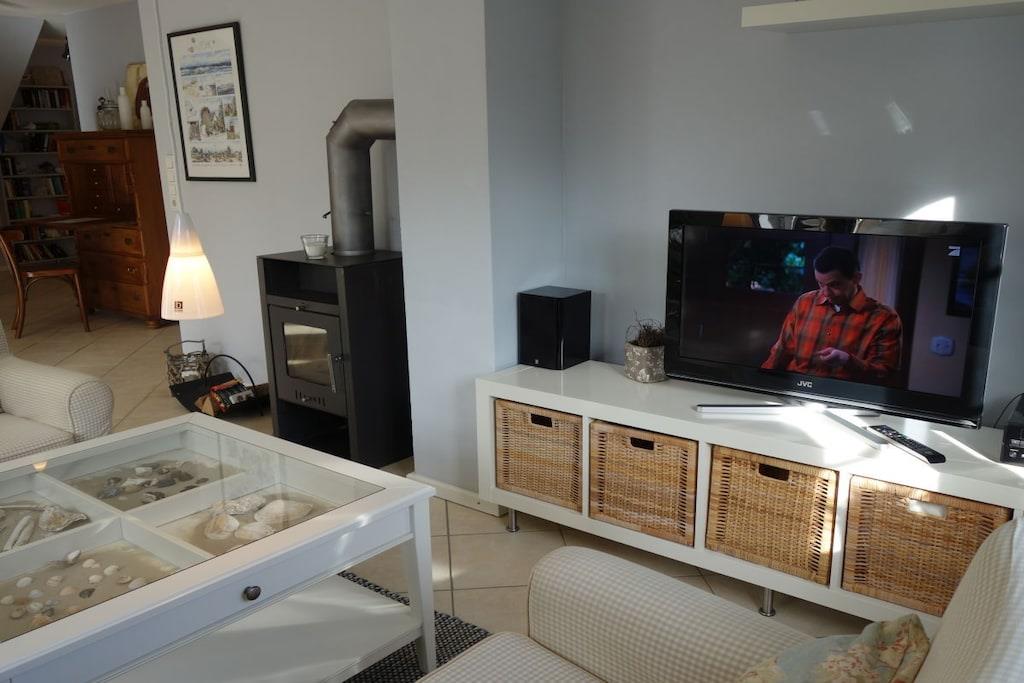 Ground floor: (hallway(Mirror, Wardrobe Coatrack, heating), Living room(Armchair, TV, stove, heating), Kitchen(hob, cooker, oven, fridge, heating), bedroom(Bed Linen, Wardrobe, double bed, TV, TV, heating), bathroom(Mirror, toilet, sauna, shower, washbasin, heating), bathroom(Mirror, toilet, shower, washbasin), heating(Vacuum Cleaner, tumble dryer, washing machine, ironing board, iron, drying cabinet)) On the 1st floor: (hallway, bedroom(Bed Linen, Wardrobe, double bed), bedroom(Bed Linen, Wardrobe, single bed, single bed)) Hot Water, Internet access, Internet access, heating, terrace(Sun Umbrella, Beach, garden furniture, sun loungers), garden(Beach, Lawn, garden furniture, sun loungers), parking