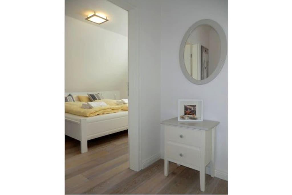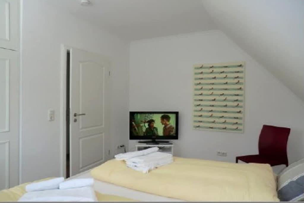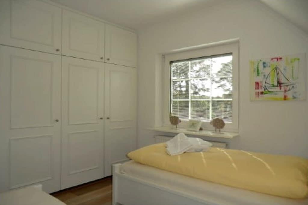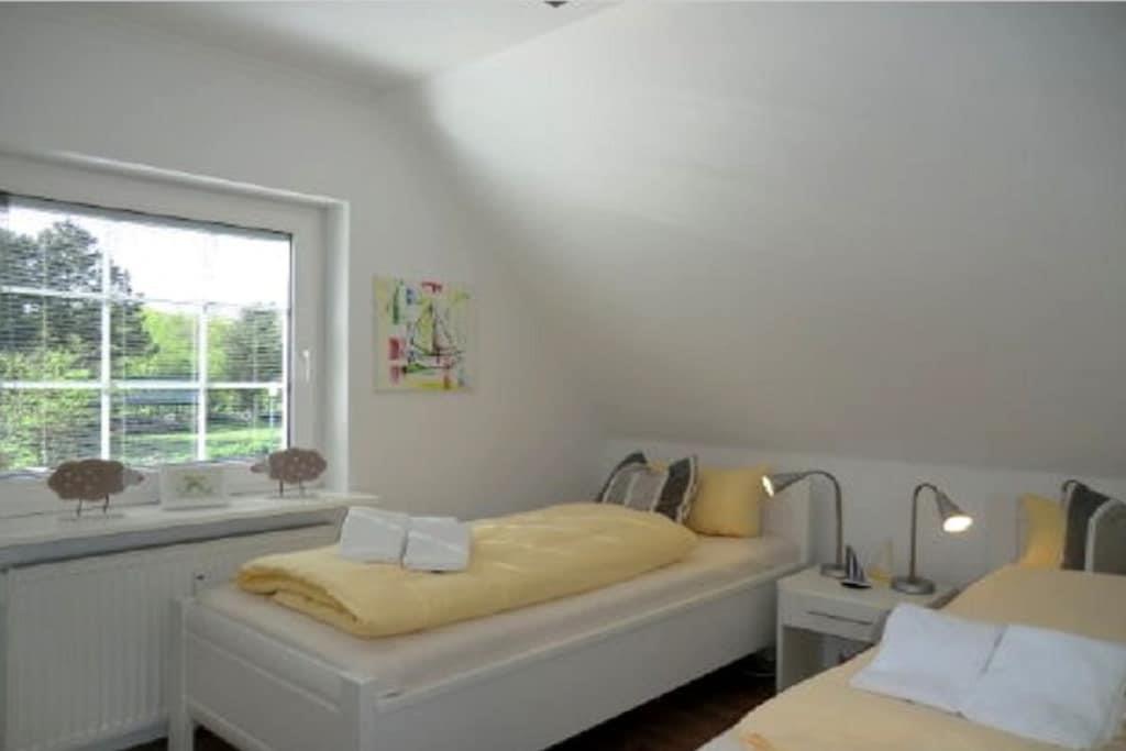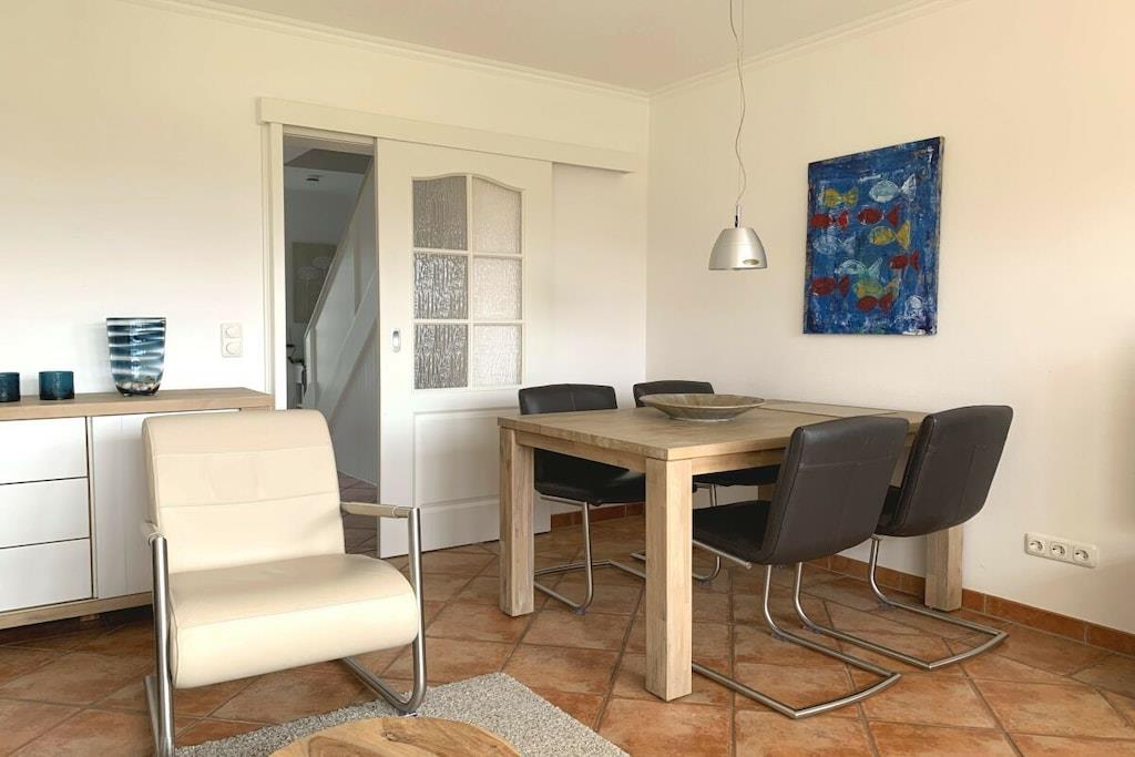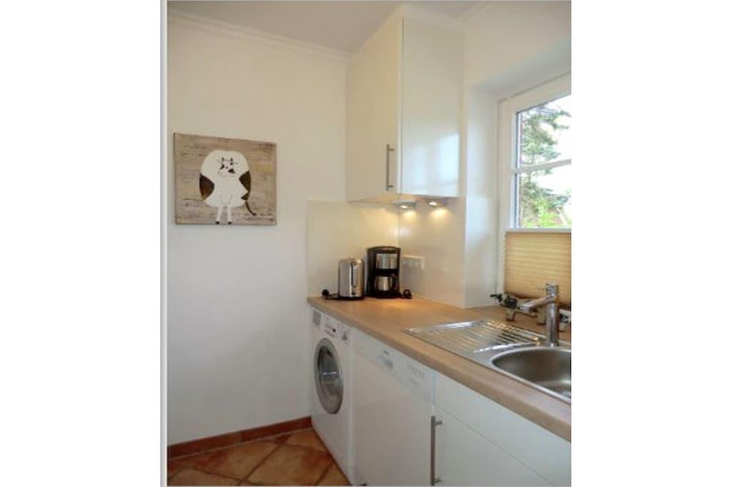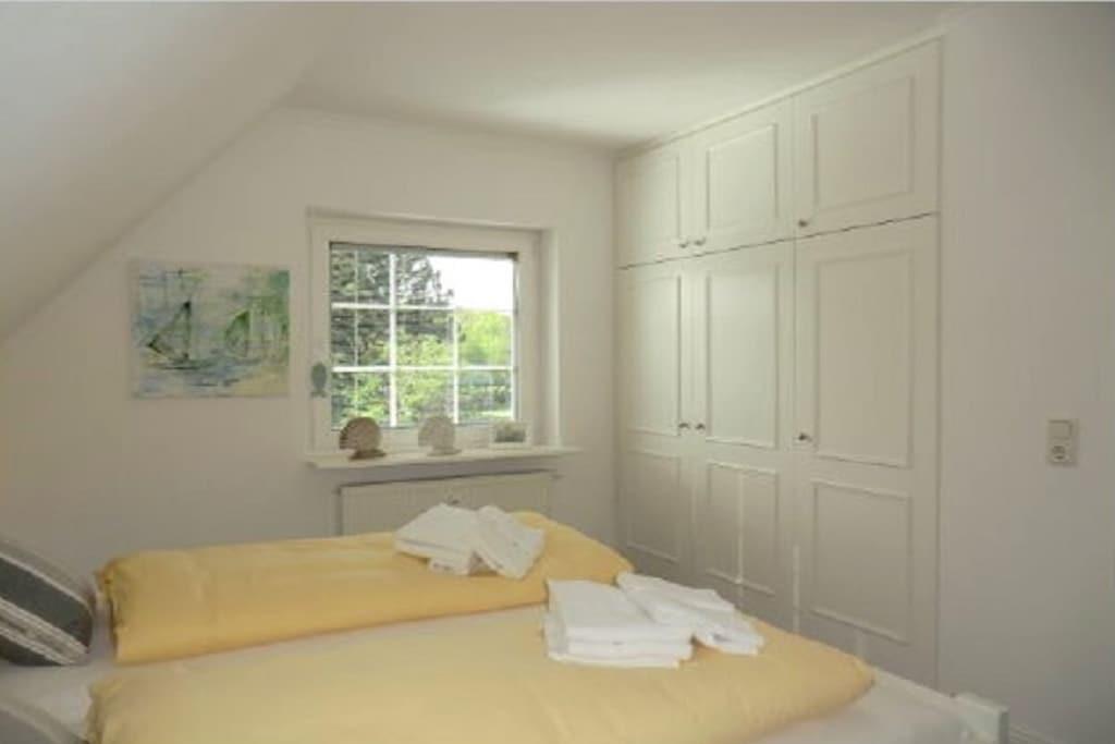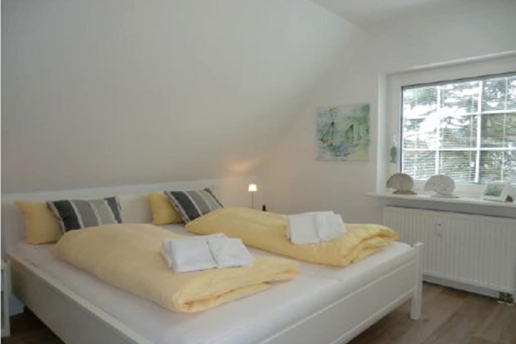 Located in an exceptionally close location between Nieblum and Wyk, this exclusive thatched-roof end-of-terrace house sits on a spacious plot in a quiet cul-de-sac. A golf course, considered one of the most beautiful in Germany, is in the immediate vicinity. Layout: Ground floor: Entrance hall with stairs to the upper floor, kitchen, shower room/WC with window, living/dining room with flat-screen TV and access to the sunny south-facing terrace. Upper floor: Bedroom with double bed and another flat-screen TV, bedroom with two single beds.