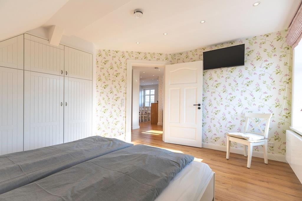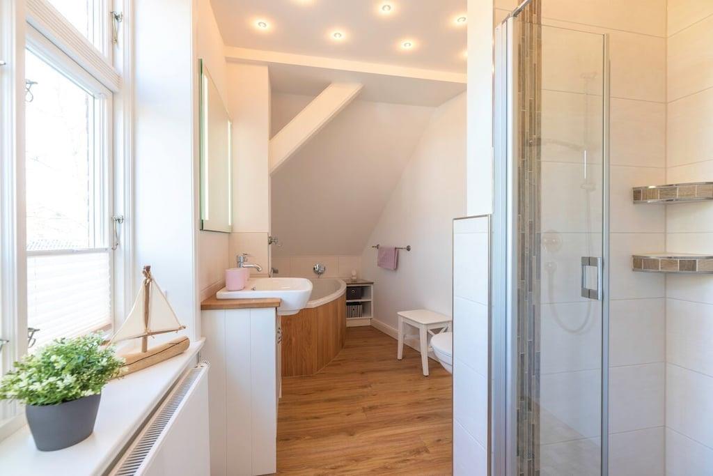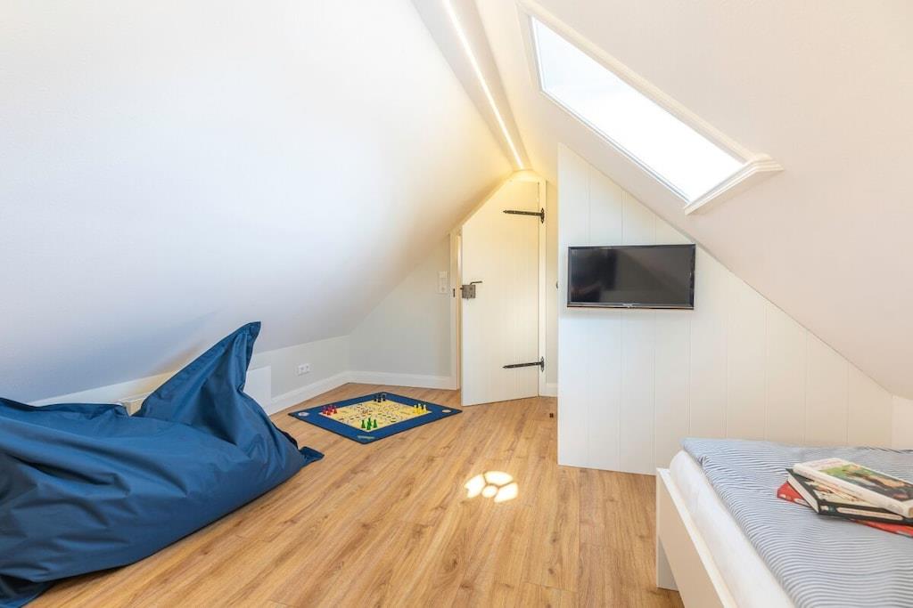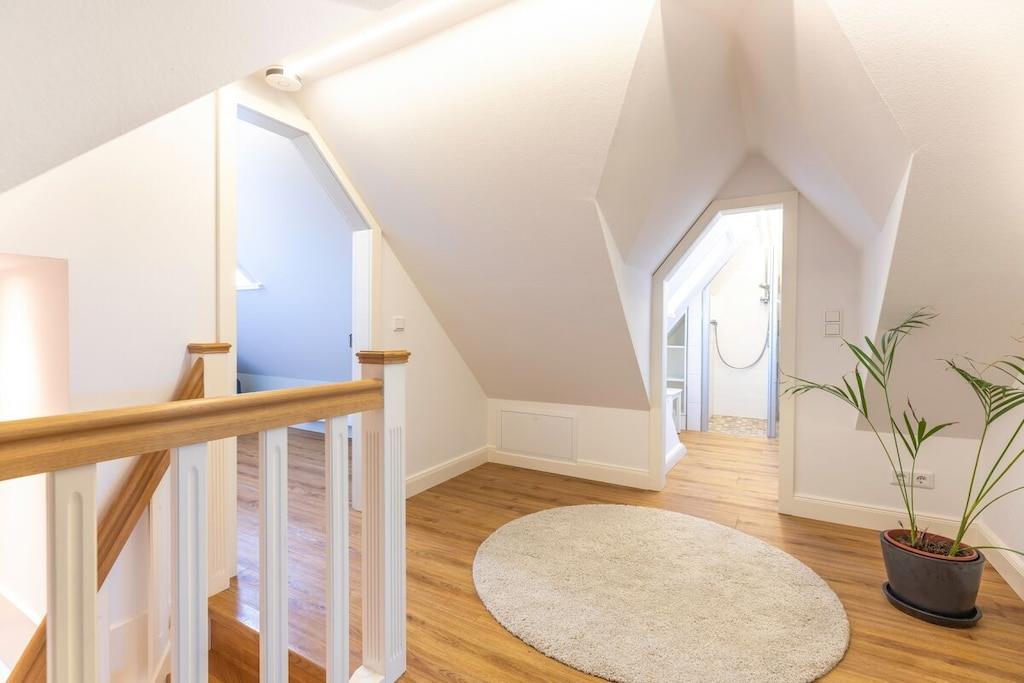 Private side entrance with cloakroom, storage room with washer-dryer, and stairs to the upper floor. Upper floor: Hallway with additional cloakroom, bedroom with double bed, bathroom with shower and bathtub/WC, spacious living and dining room with flat-screen TV (additional TVs are available in the bedrooms!), open-plan and fully equipped kitchen, another bedroom with double bed, stairs to the attic. Attic: Two further bedrooms, each with a single bed, bathroom with shower, separate WC.