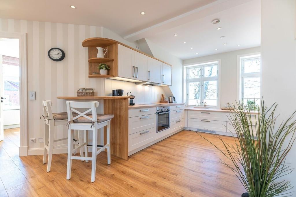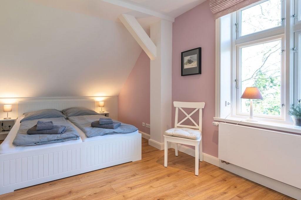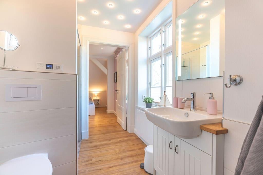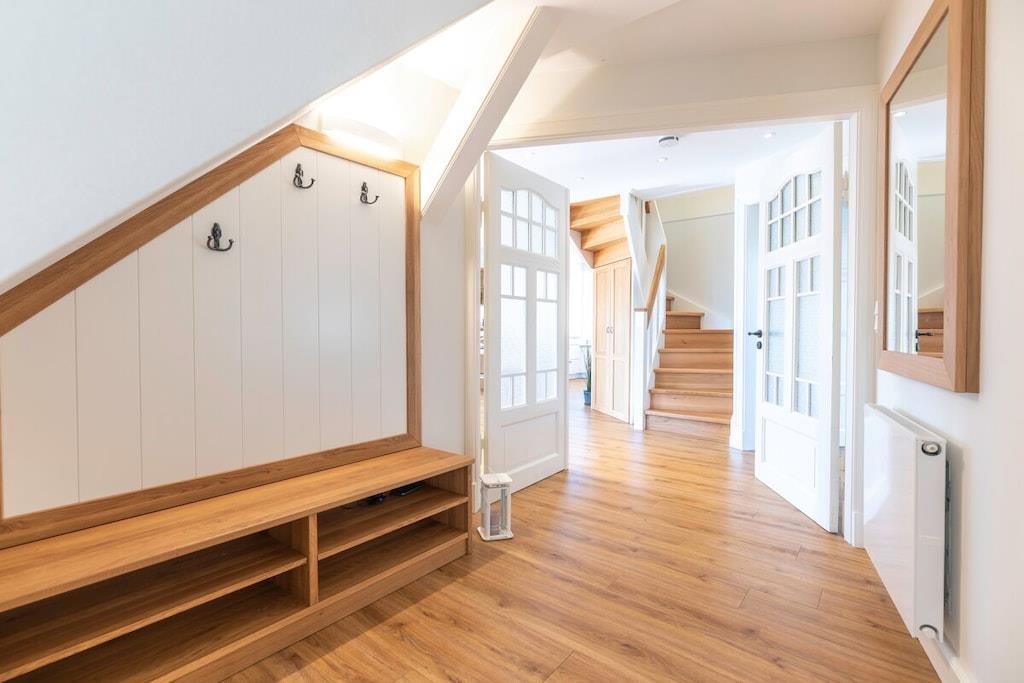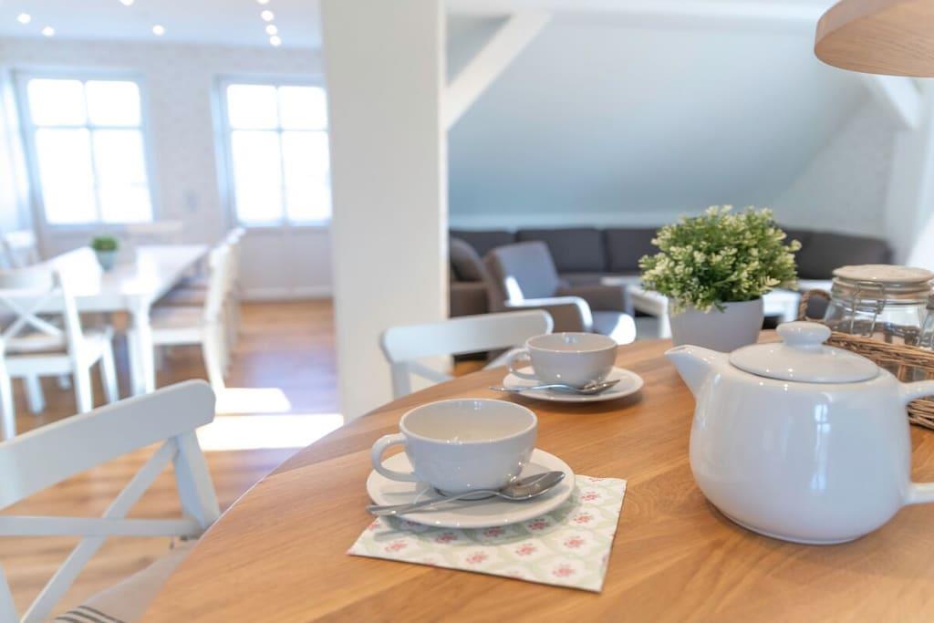 Private side entrance with cloakroom, storage room with washer-dryer, and stairs to the upper floor. Upper floor: Hallway with additional cloakroom, bedroom with double bed, bathroom with shower and bathtub/WC, spacious living and dining room with flat-screen TV (additional TVs are available in the bedrooms!), open-plan and fully equipped kitchen, another bedroom with double bed, stairs to the attic. Attic: Two further bedrooms, each with a single bed, bathroom with shower, separate WC.