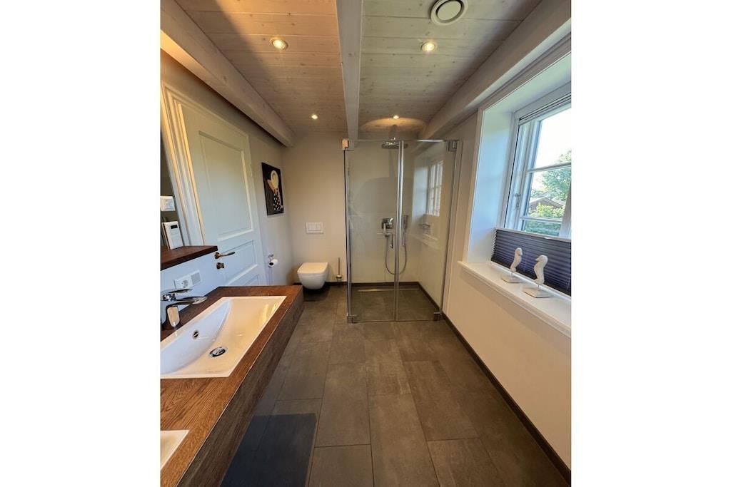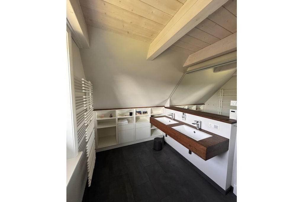 This lovingly and tastefully furnished semi-detached house features a kitchen with a dining area and adjoining living area with satellite TV and free Wi-Fi, as well as a guest toilet and entryway on the ground floor. The bedrooms, each with its own bathroom and toilet, are located on the upper floor. A washing machine and dryer are available in the basement. The apartment can accommodate a maximum of 4 people (non-smoking). Ground Floor: Entrance area with entryway, cloakroom, and guest toilet Open-plan living area with a modern kitchen, dining area, and comfortable living room Kitchen: Equipped with a ceramic hob, extractor hood, oven, and refrigerator with freezer compartment Living area with satellite TV A gas fireplace provides cozy warmth during the colder months Upper Floor: Two bedrooms with double beds (200 x 200 cm and 180 x 200 cm) Each bedroom has its own bathroom with shower and toilet Basement: Washing machine and dryer Microwave