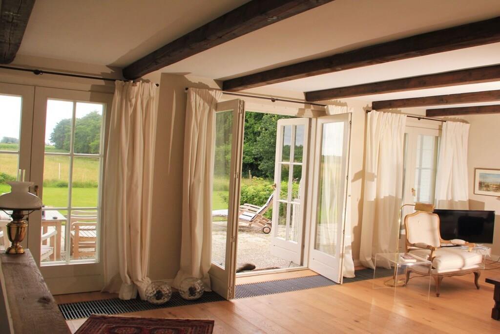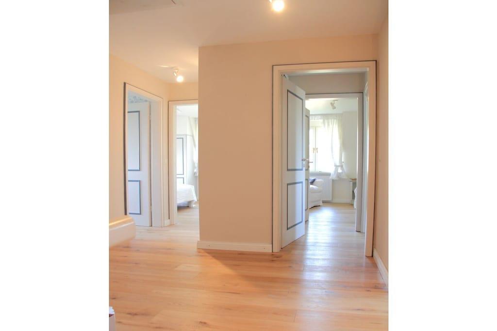 Unsere Hälfte des Ferienhauses Westerheide bietet alles, was man sich für wunderschöne Urlaubstage an der See wünscht: Sowohl den breiten Strand mit dem endlosen Wattenmeer, als auch den romantischen Ortskern von Nieblum erreichen Sie zu Fuß in nur 10 Minuten. Das Haus liegt in absolut stiller Lage mit freiem Blick über die weiten Wiesen und Felder bis zum Deich. Dazu gehören 1500 m² sonniger Südgarten, eine große Terrasse mit Teakmöbeln, sowie ein Strandkorb und fahrbare Liegen zum Faulenzen in der Natur. Innen Gemütlichkeit pur: Im Erdgeschoss finden Sie ein sonniges, nach Süd-Westen ausgerichtetes Wohnzimmer mit einem klassischen Kamin für gemütliche Lesestunden. Daneben eine geräumige Küche mit einer großen Sitzgruppe für gesellige Stunden im Kreis der Familie oder mit Freunden. Im Obergeschoss befinden sich 3 geräumige Doppelschlafzimmer, zwei davon mit weitem Blick bis zum Deich. Das Dritte Doppelschlafzimmer befindet sich in einem abgeschlossenen Bereich. Diese "Einliegerwohnung" ist mit einem eigenen Badezimmer und einem kleinen Flur vom übrigen Bereich getrennt, und wird daher gern von unseren Hausgästen genutzt. Insgesamt gibt es ein großes Vollbad mit Dusche und einer Badewanne, und zwei Bäder mit jeweils einer Dusche. Ein unbegrenzter 16 Mbit High-Speed Internetzugang ist überall im Haus verfügbar, so dass Sie auch bei ungünstigem Wetter nach Herzenslust Unterhaltung finden können.