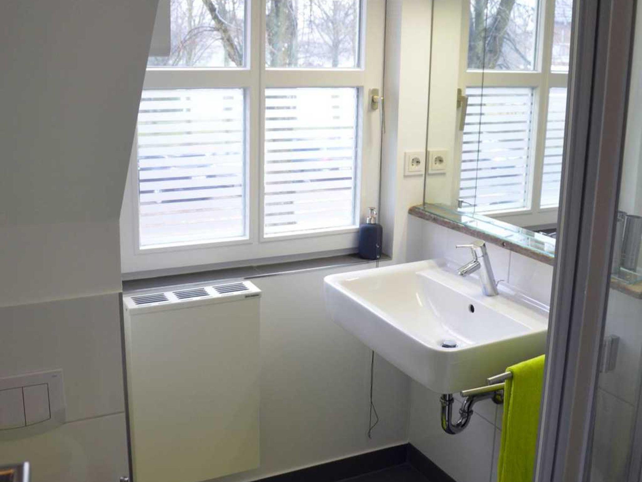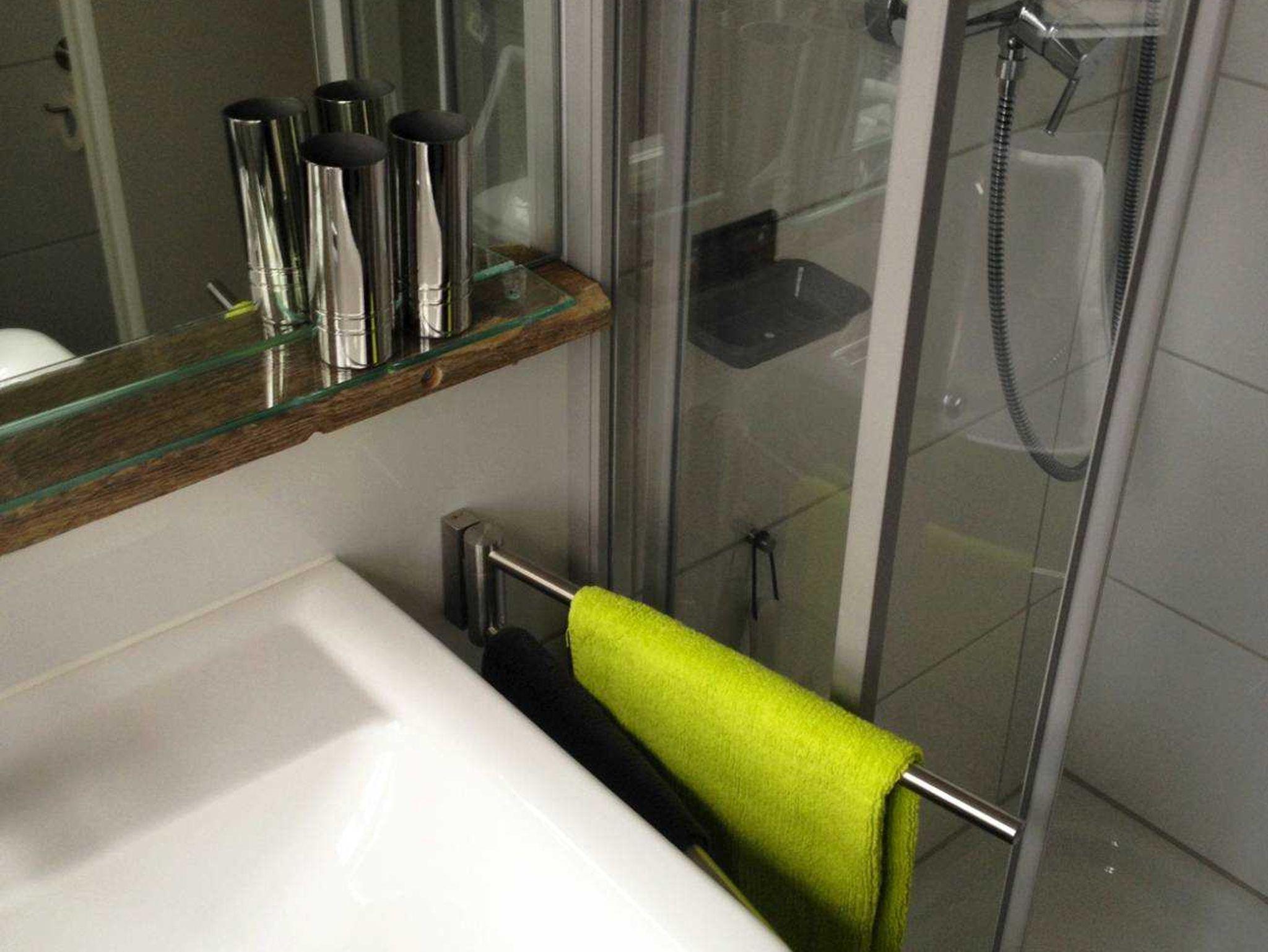 Sanitär: bodenebene Dusche, Föhn, Handtuchheizkörper, Schminkspiegel.