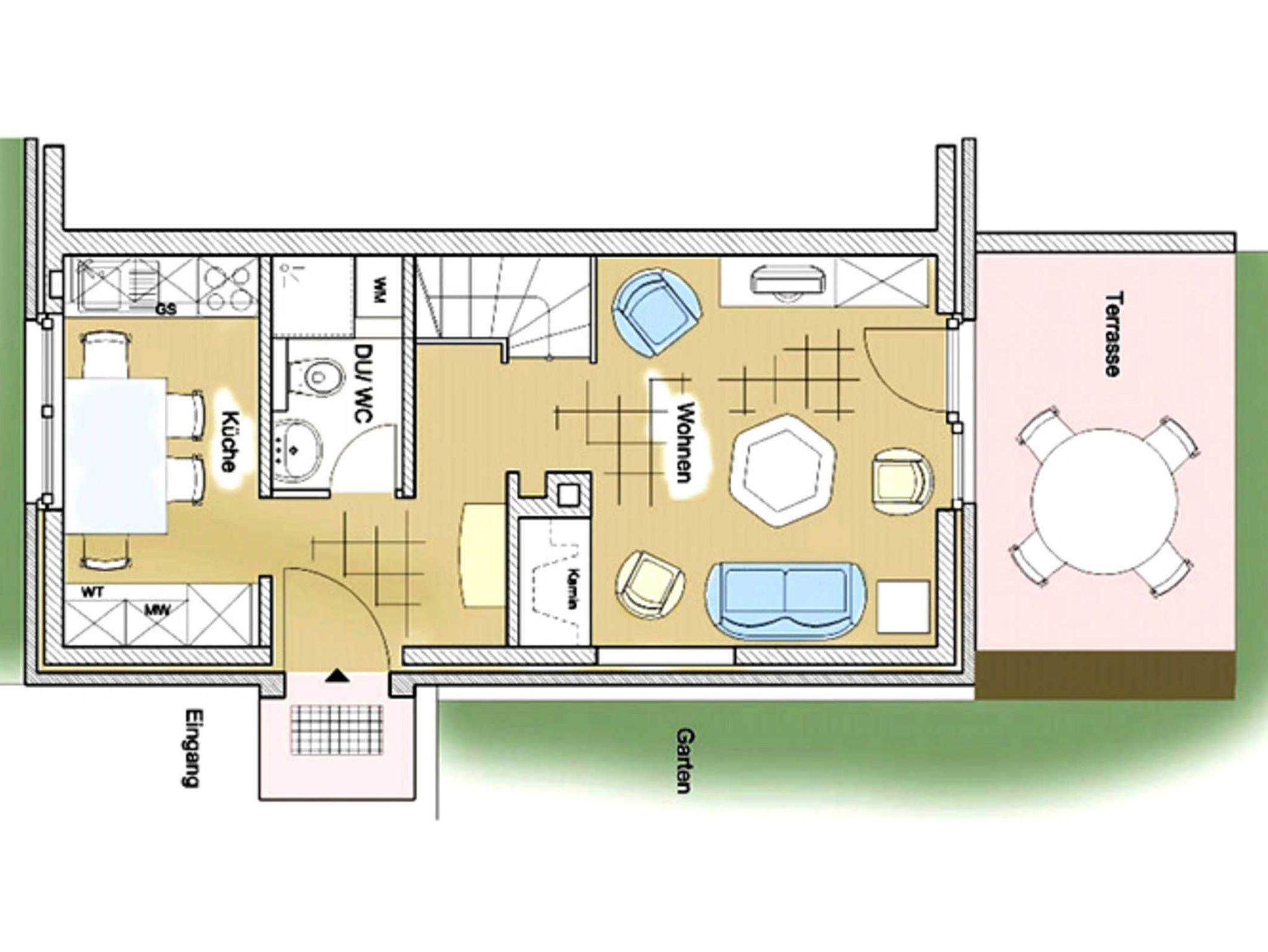 Küche mit Esstisch , Wohnbereich mit Zugang zur Terrasse und ein Gäste WC, einen separaten Eingang sowie einen eigenen Garten.Im Sommer wie auch im Winter können Sie sich in unserem Haus wohlfühlen. Die Fußbodenheizung und der offene Kamin sorgen für eine gemütliche Atmospähre.Nieblum ist das schönste Dorf der Insel. Den historischen Ortskern erreichen Sie in 3 Minuten und zum Strand gehen Sie gemütlich ca. 10 Min.