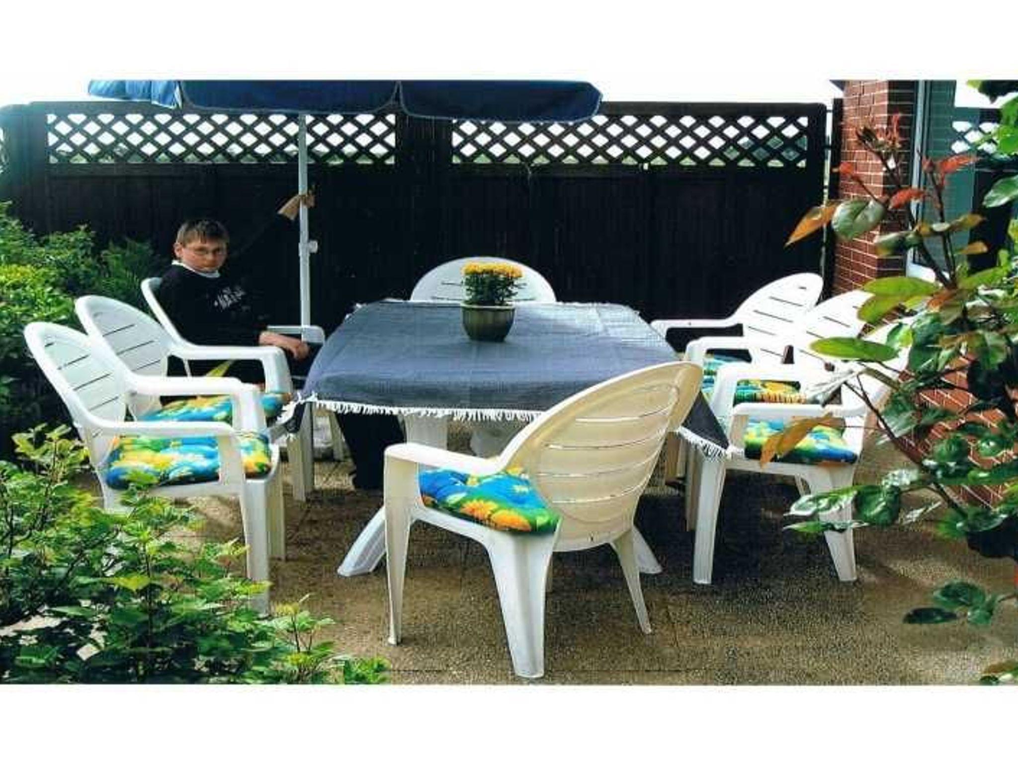 Zu jeder Fewo gehört eine Terrasse mit Strandkorb und Gartenmöbeln.