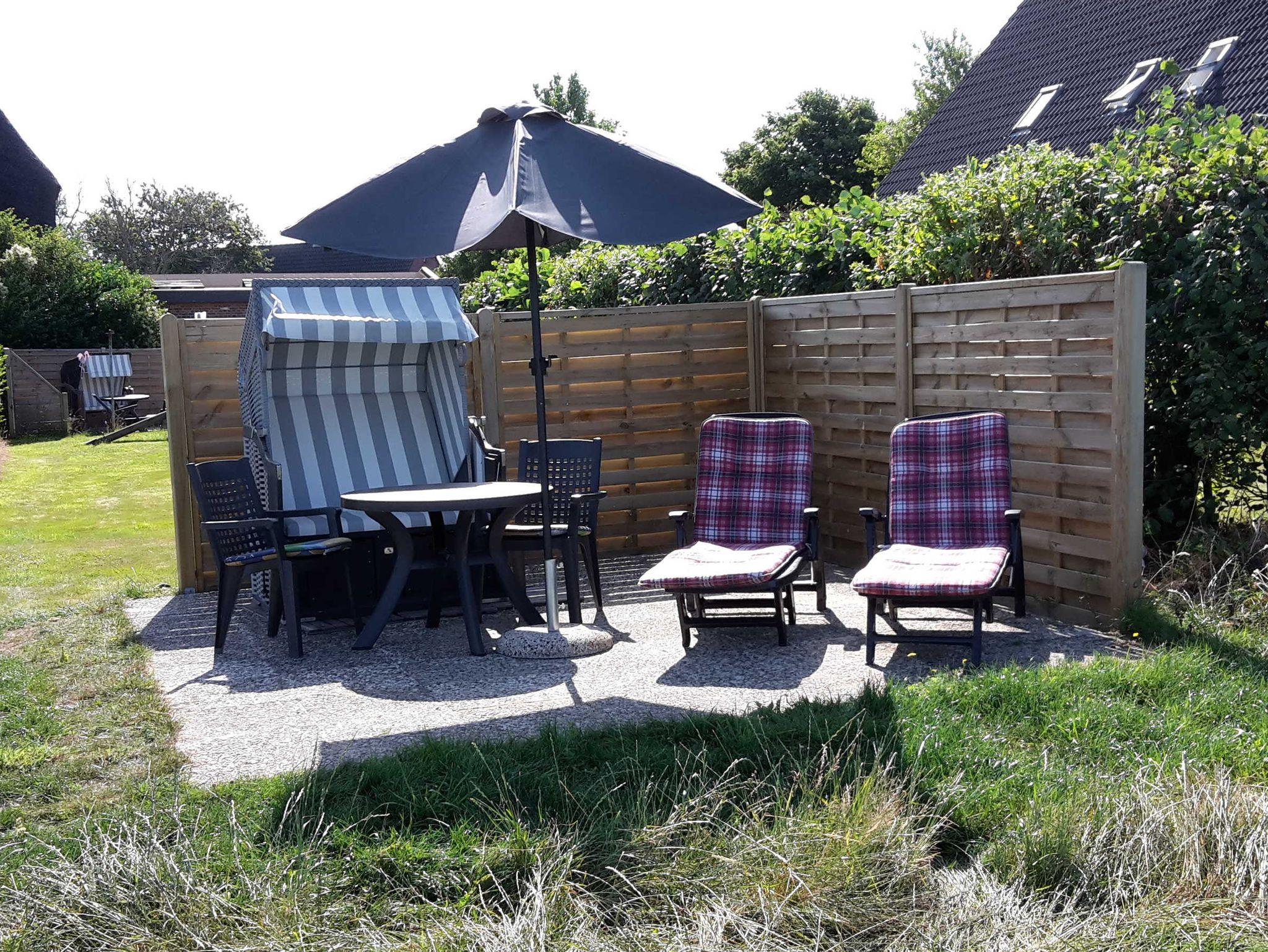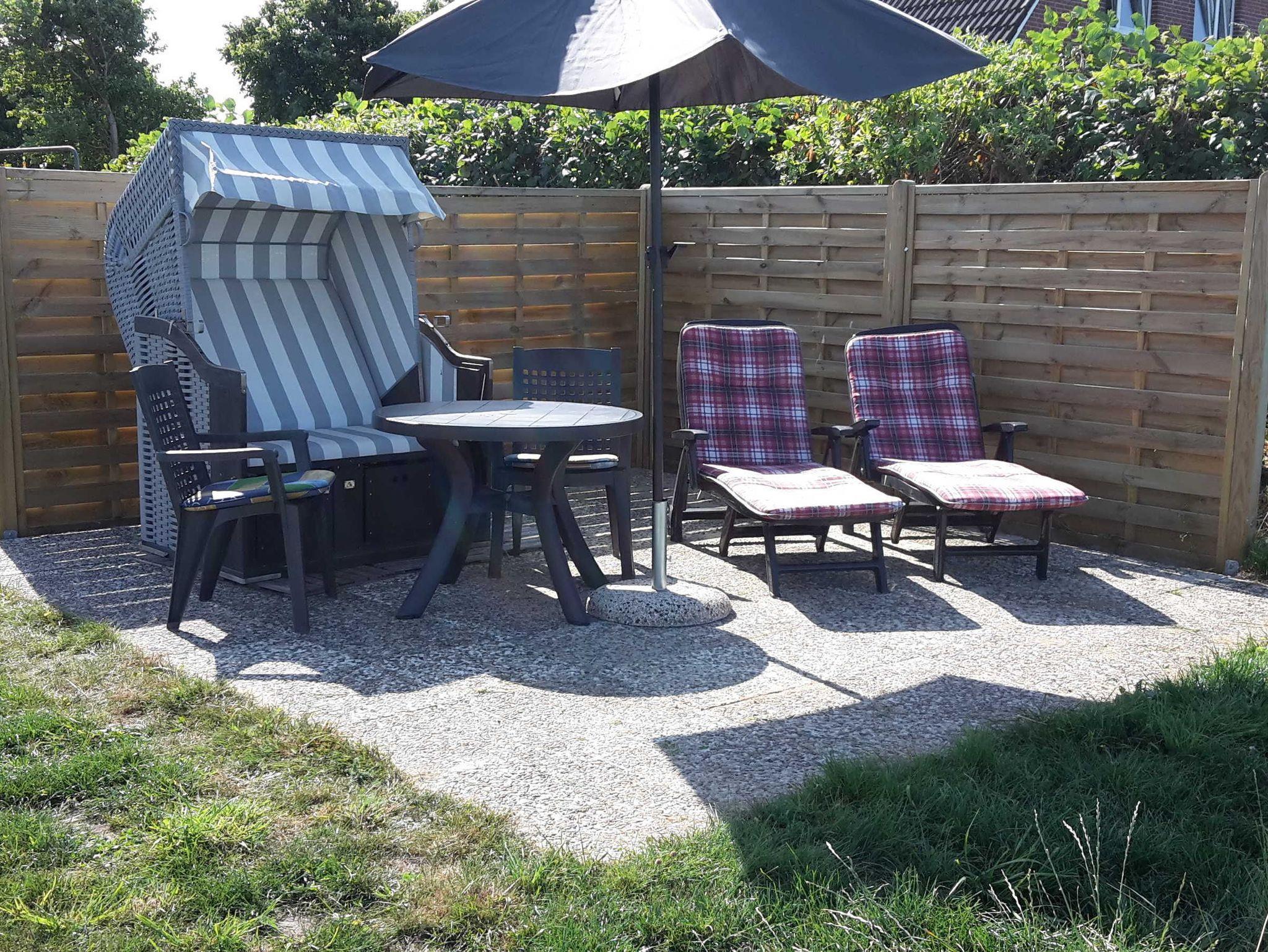 Zu jeder Fewo gehört eine Terrasse mit Strandkorb und Gartenmöbeln.