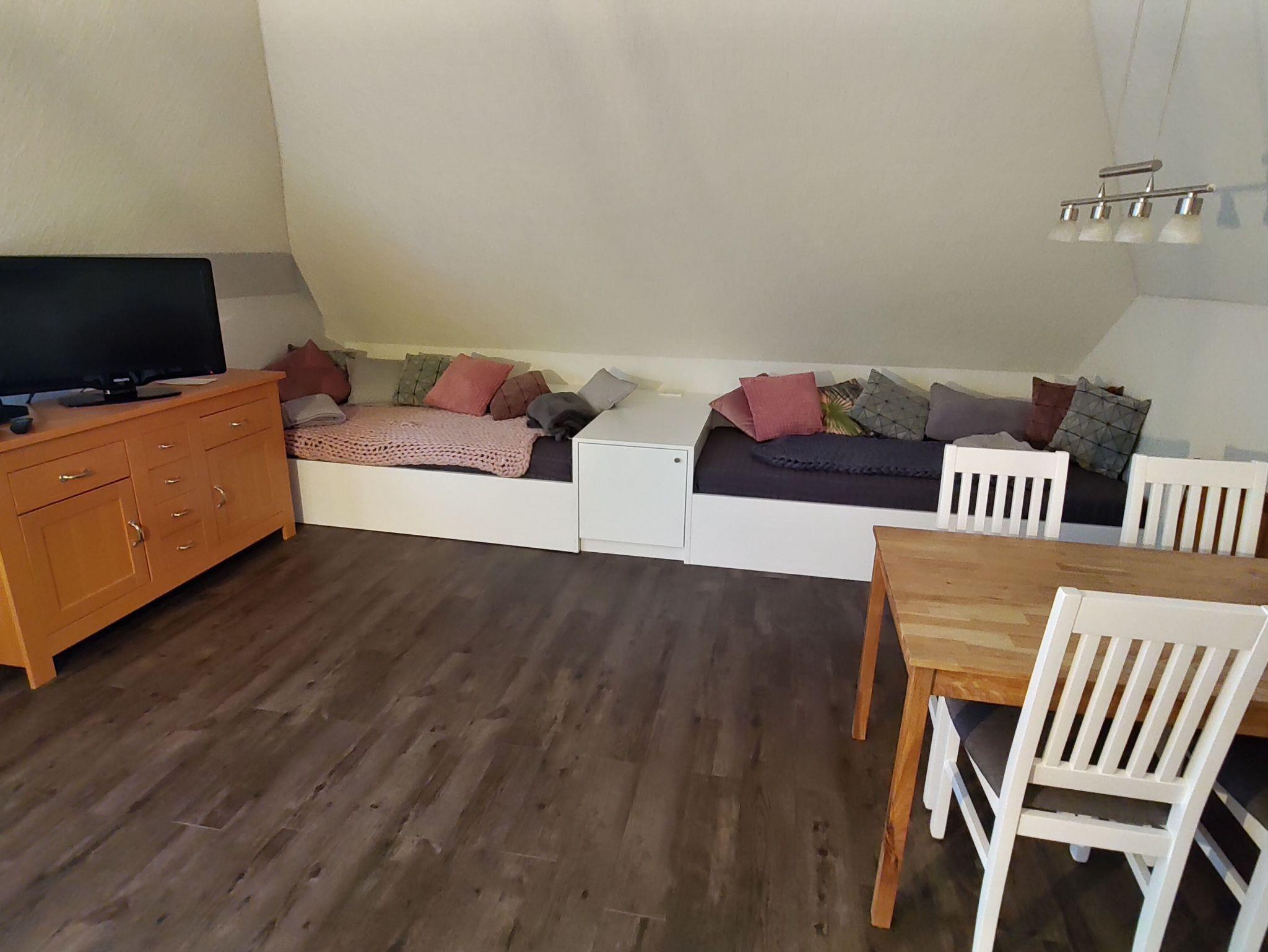 Diese 50 qm große Obergeschosswohnung mit Balkon bietet Platz für idealerweise zwei, höchstens drei Personen.