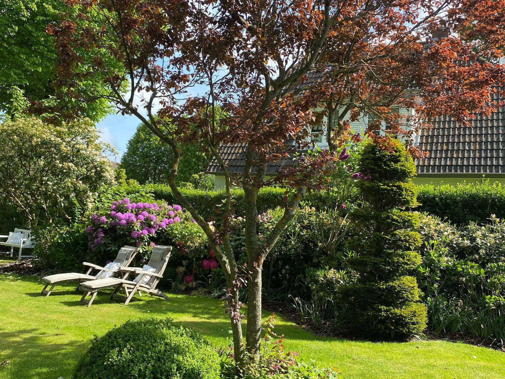 Auf einem großzügigen Grundstück von 2000 Quadratmetern gelegen, bietet Dat Schloss neben dem zeitweise bewohnten Haus der Eigentümer auch einen separaten Garten exklusiv für unsere Gäste. Hier können Sie die Ruhe und Privatsphäre genießen. Hochwertige Gartenmöbel und ausreichend Liegen laden zum Entspannen im schön gestalteten, dicht bewachsenen Garten ein. Die Terrasse und der Essplatz im Freien sind perfekte Orte für gemütliche Mahlzeiten und geselliges Beisammensein. Ein Parkplatz am Haus mit Abstellmöglichkeiten für Fahrräder steht Ihnen ebenfalls zur Verfügung.