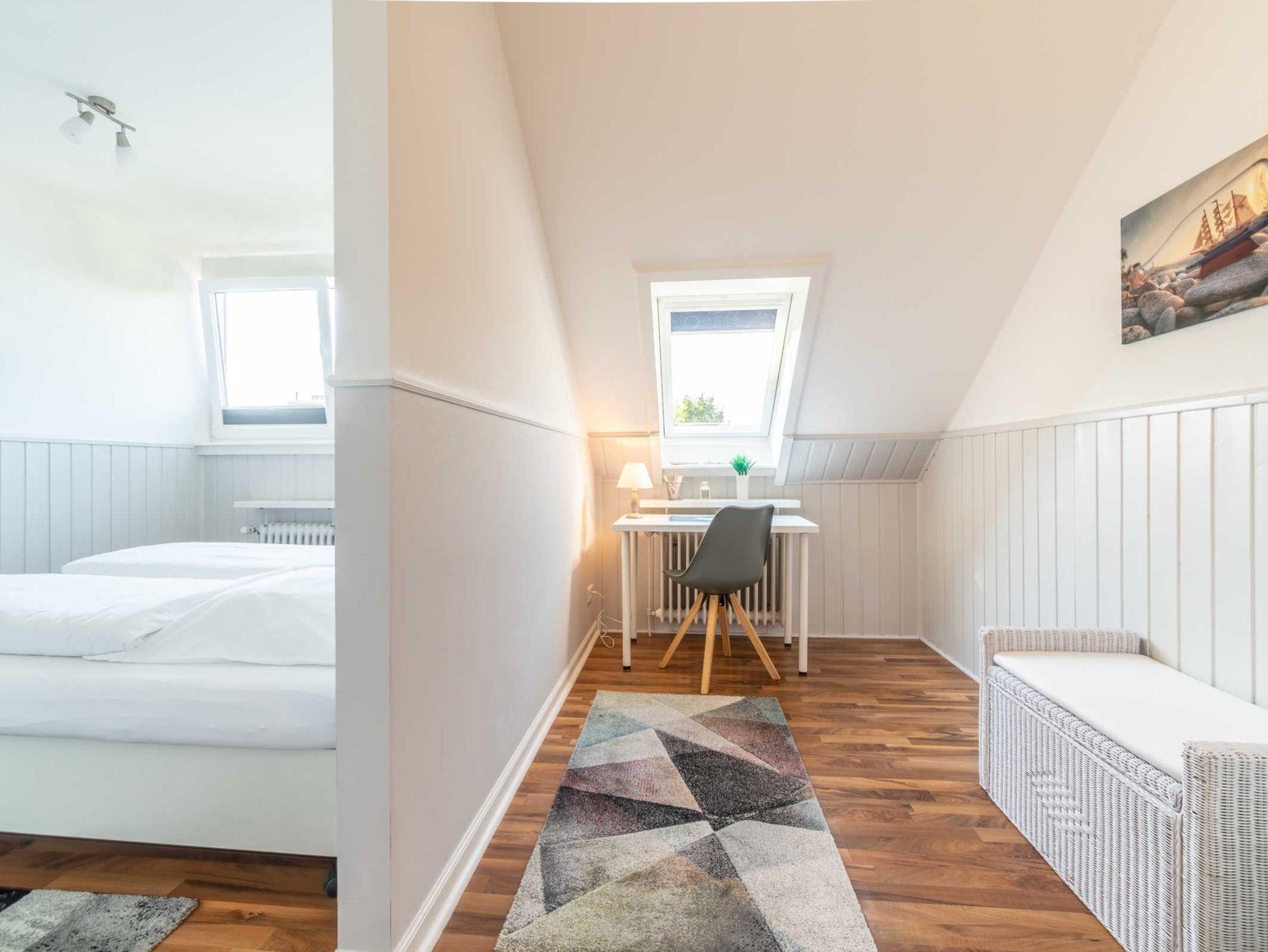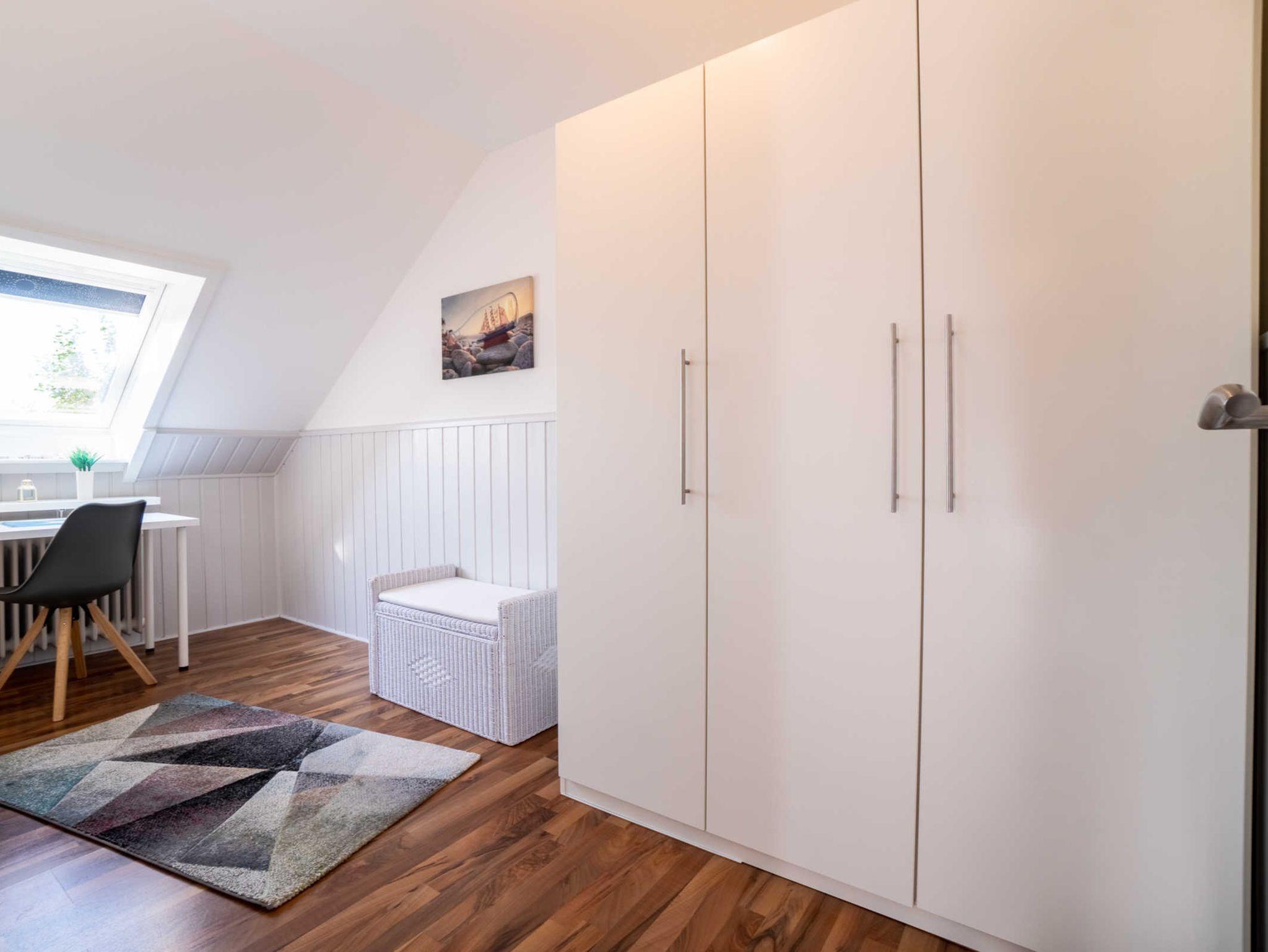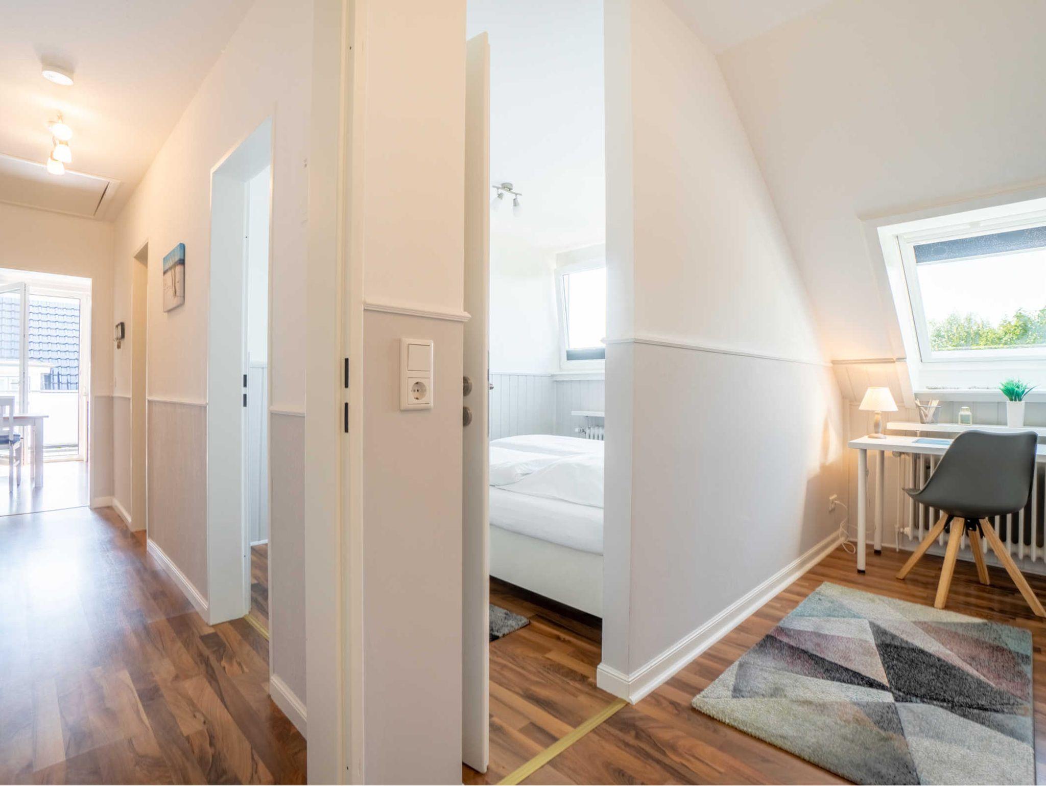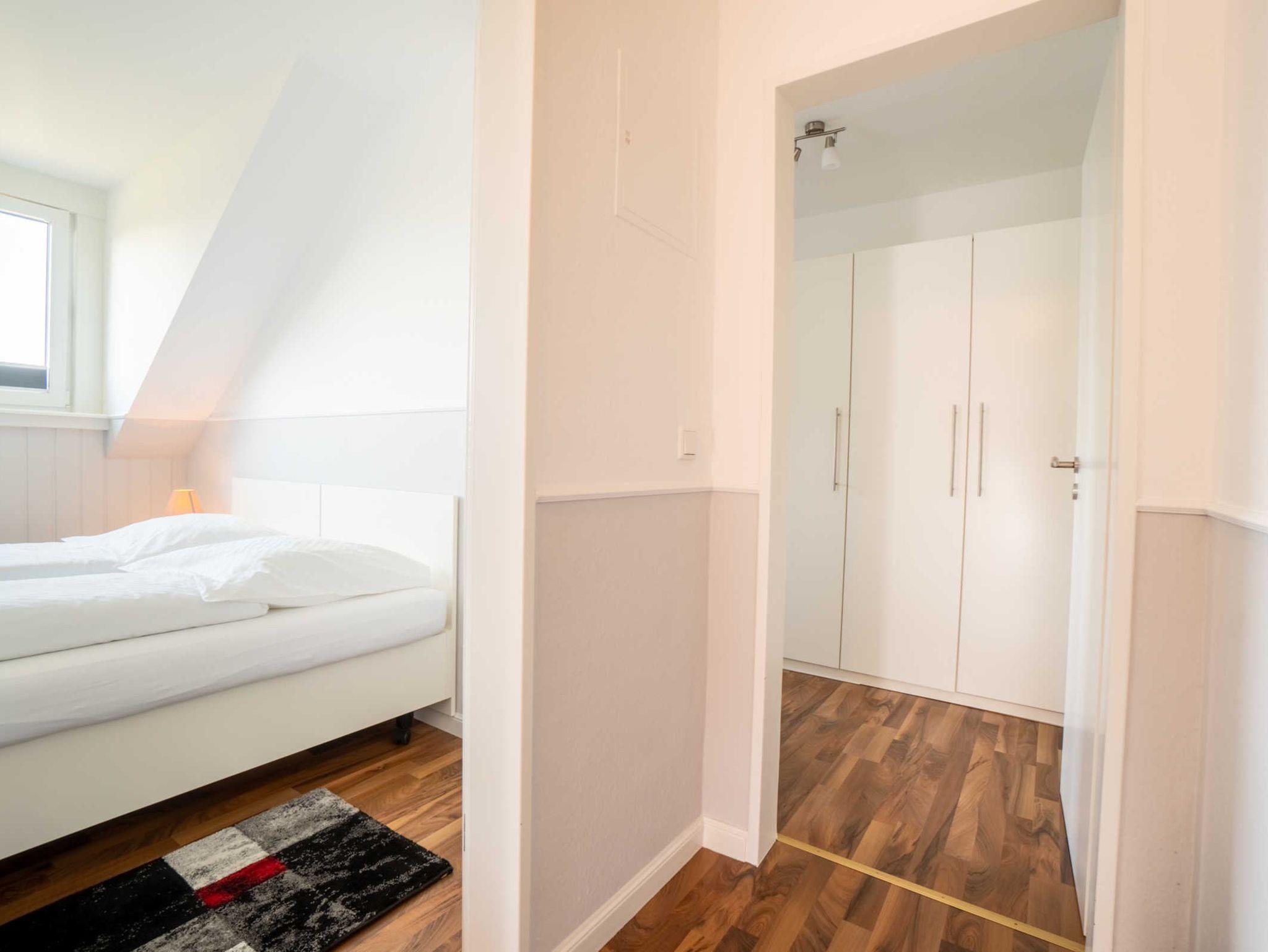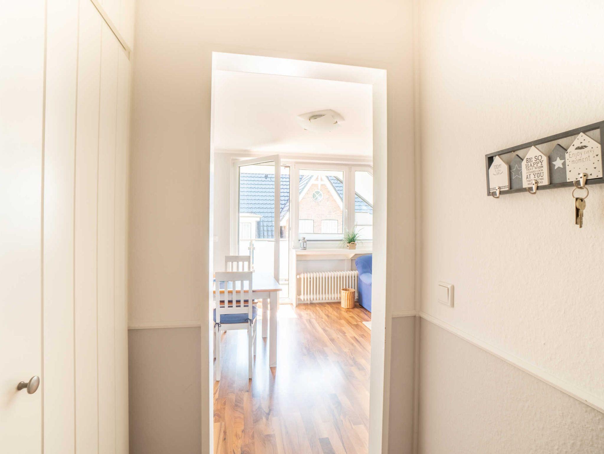 Die Wohnung liegt im Obergeschoss rechts und bietet Platz für bis zu 2 Personen mit Kleinkind. Sie hat einen Zugang zum Westbalkon.