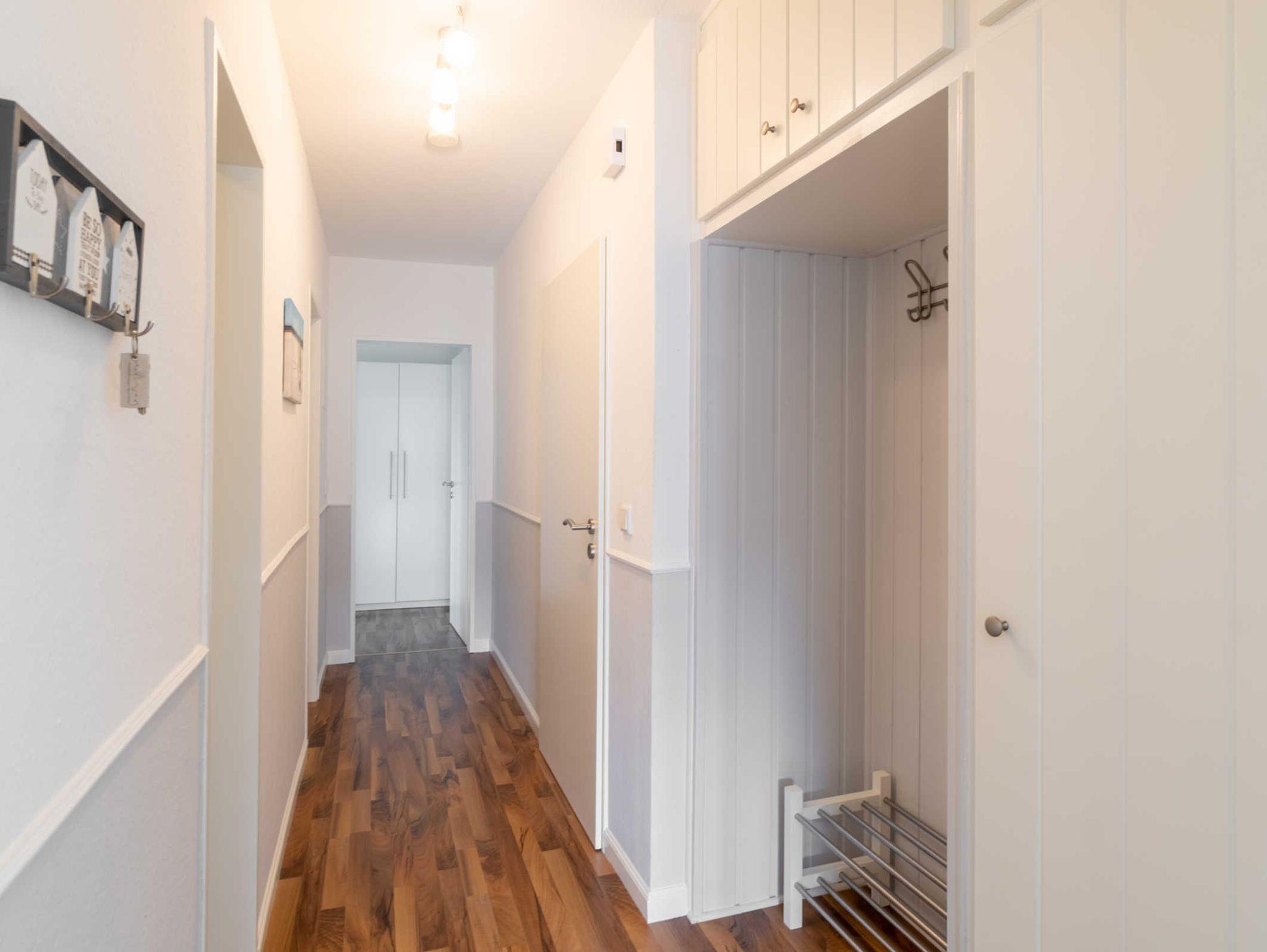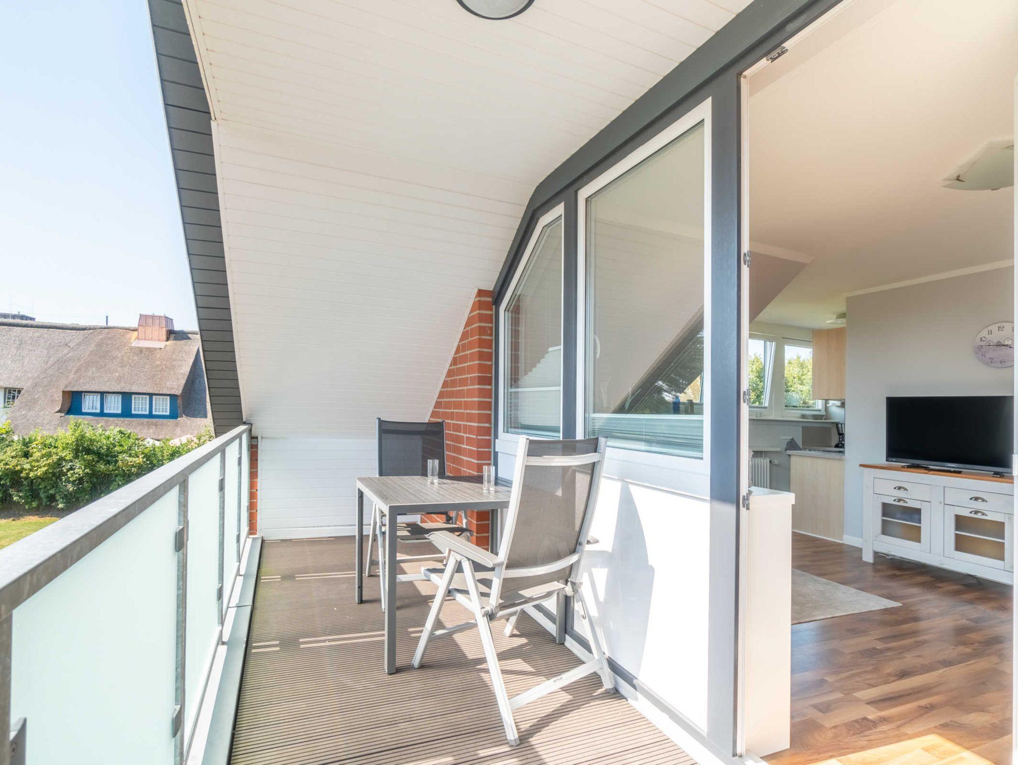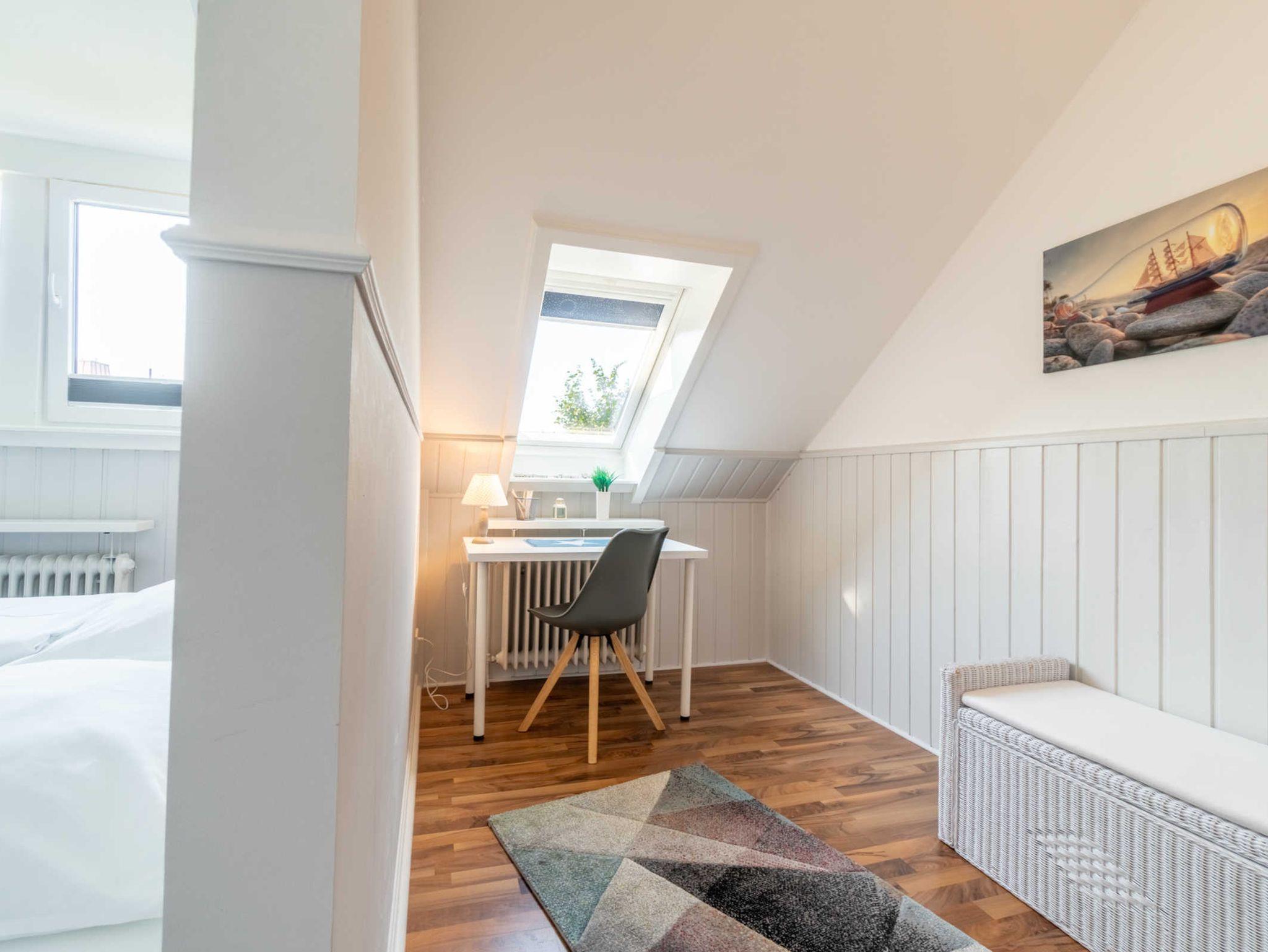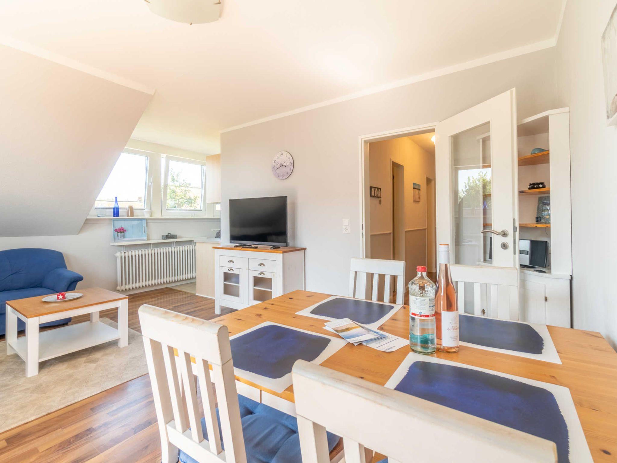 Die Wohnung liegt im Obergeschoss rechts und bietet Platz für bis zu 2 Personen mit Kleinkind. Sie hat einen Zugang zum Westbalkon.