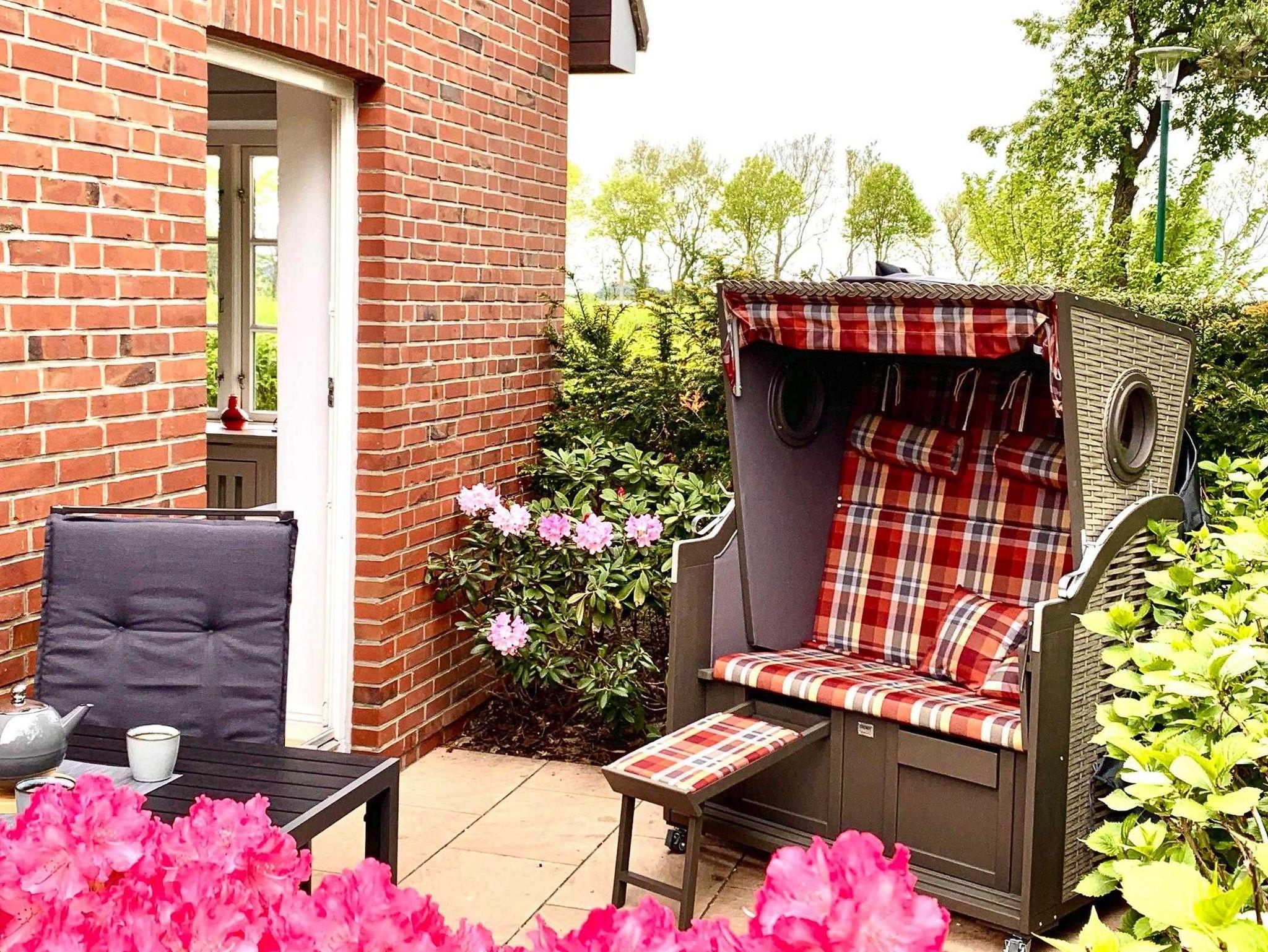 Außenbereich: Abstellmöglichk. f. Fahrräder, Strandkorb, Strandkorb auf Terrasse, Terrasse, Terrassenmöbel.