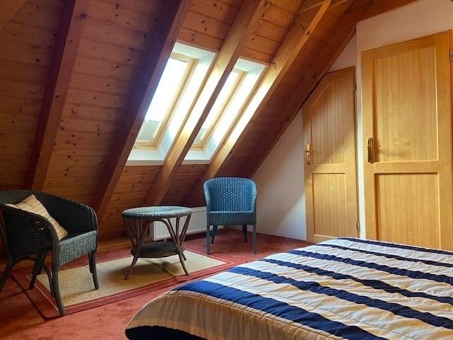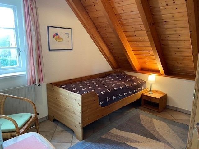 Das dritte Schlafzimmer verfügt über ein Etagenbett (für Kinder) und ein Babybett. Ein weiteres gemütliches Schlafzimmer im Dachgeschoss des Hauses verfügt über ein Doppelbett (140 x 200), welches bei sonnigem Wetter einen Blick auf die Nachbarinsel Amrum bietet.