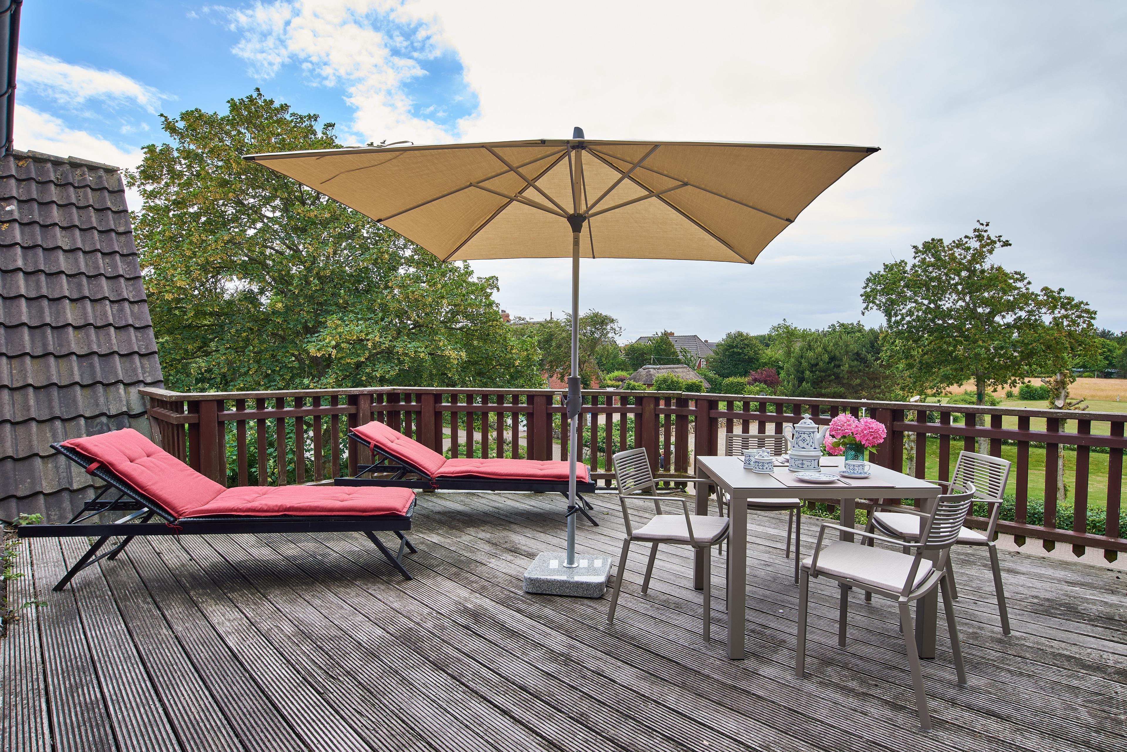 Mitten im Herzen des wunderschönen und idyllischen Ortes Nieblum, welcher unter vielen Liebhabern der Insel als schönster Ort auf Föhr gilt, befindet sich dieses Juwel nur wenige Meter entfernt vom schön angelegten und gepflegten Nieblumer Ententeich. Nieblum ist ein kleines Inseldorf, nur ca. 5 Km von der Stadt Wyk entfernt und bietet alles, was man zum täglichen Bedarf benötigt. Es gibt einen kleinen Einkaufsladen, eine Bäckerei mit hervorragenden Brötchen, Broten und süßen Gaumenfreuden, mehrere Restaurants und Cafes, eine unter den Föhrern sehr beliebte Eisdiele und natürlich einen schönen Strand mit Surfschule. Und genau in diesem hübschen Dorf liegt unsere Haushälfte Wildrose mit seinen 65 qm. Schon beim Betreten des Hauses werden Sie die offene und großzügige Bauweise der Doppelhaushälfte bemerken. Der geräumige Flur bietet reichlich Platz und von hier führt eine Treppe hinauf in den Schlafbereich, welcher mit der offenen Balkenlage, den dunklen, edlen Möbeln im Kontrast zum hell gestalteten Raum sogleich Gemütlichkeit ausstrahlt. Zugleich befindet sich im Schlafraum neben dem Boxspringbett (160x200cm) eine weitere Sitzgruppe zum Lesen, Fernsehschauen, Telefonieren oder einfach zum Entspannen und Zurückziehen. Von hier aus gelangen Sie auch auf die große Dachterrasse, die im Sommer (ca. April bis Ende September Anfang Oktober) mit Gartenmöbeln zum Verweilen einlädt.