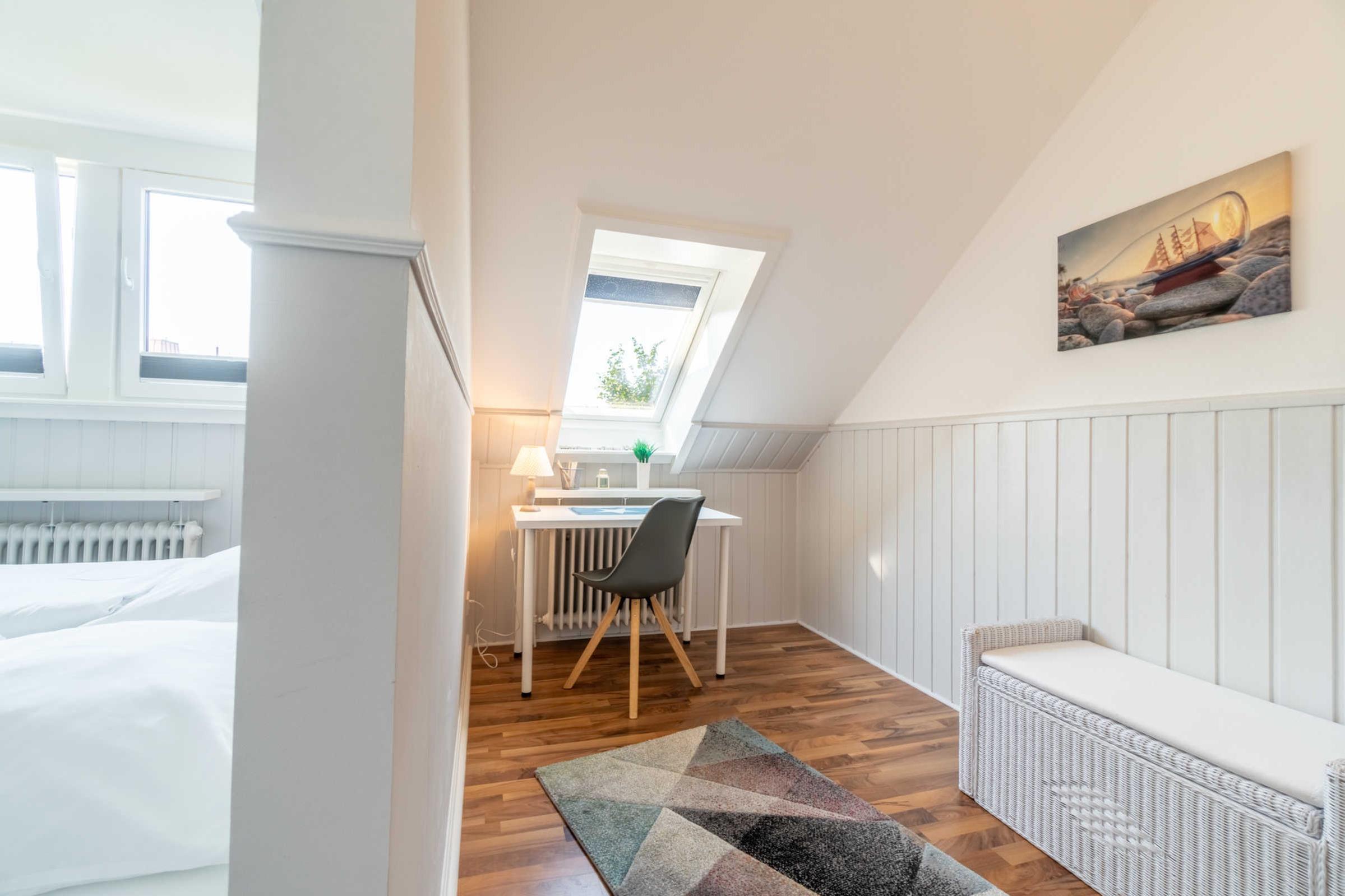 Die Wohnung liegt im Obergeschoss rechts und bietet Platz für bis zu 2 Personen mit Kleinkind. Sie hat einen Zugang zum Westbalkon.