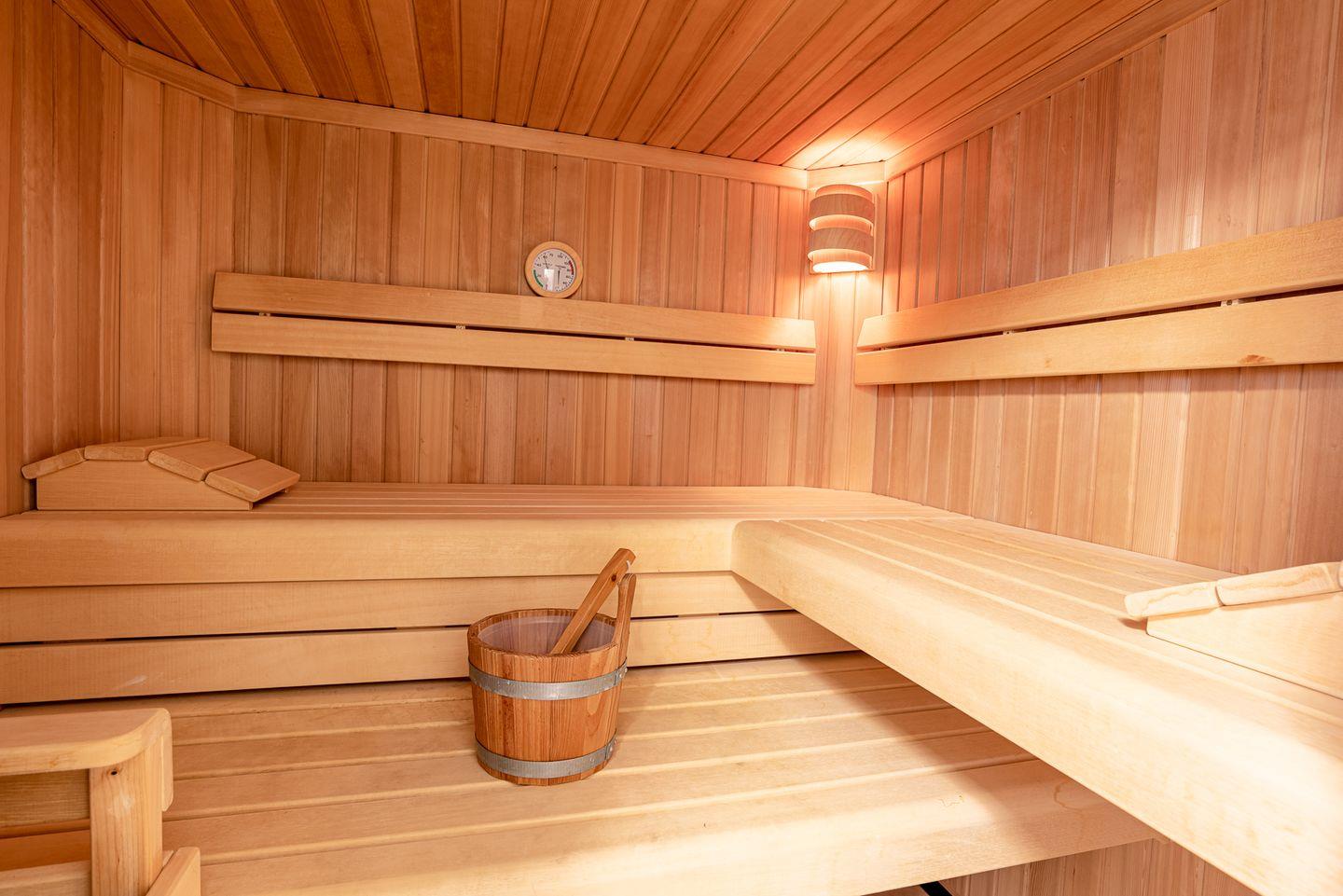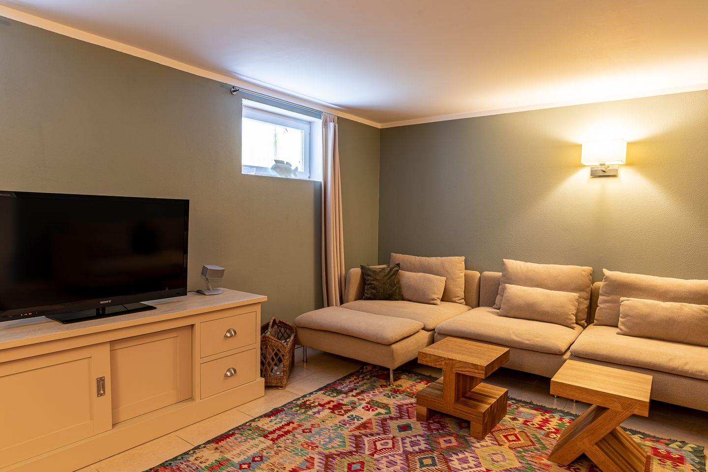 Im Souterrain befindet sich die Sauna mit einer separaten Dusche sowie ein weiteres Wohnzimmer bzw. Wellnesszimmer. Dieser Aufenthaltsraum kann sowohl als Rückzugsort dienen, um über die klangvolle Soundanlage Musik zu hören, Fernsehen zu gucken oder auch nur um ein Buch zu lesen. Neben einer kuscheligen, großen Sofalandschaft stehen hier auch zwei Wellnessliegen bereit, sodass nach einem Saunagang relaxt werden kann. Der Hauswirtschaftsraum verfügt über Waschmaschine, Trockner und allem, was Sie im Urlaub benötigen könnten, wie Bügeleisen, -brett und Co.