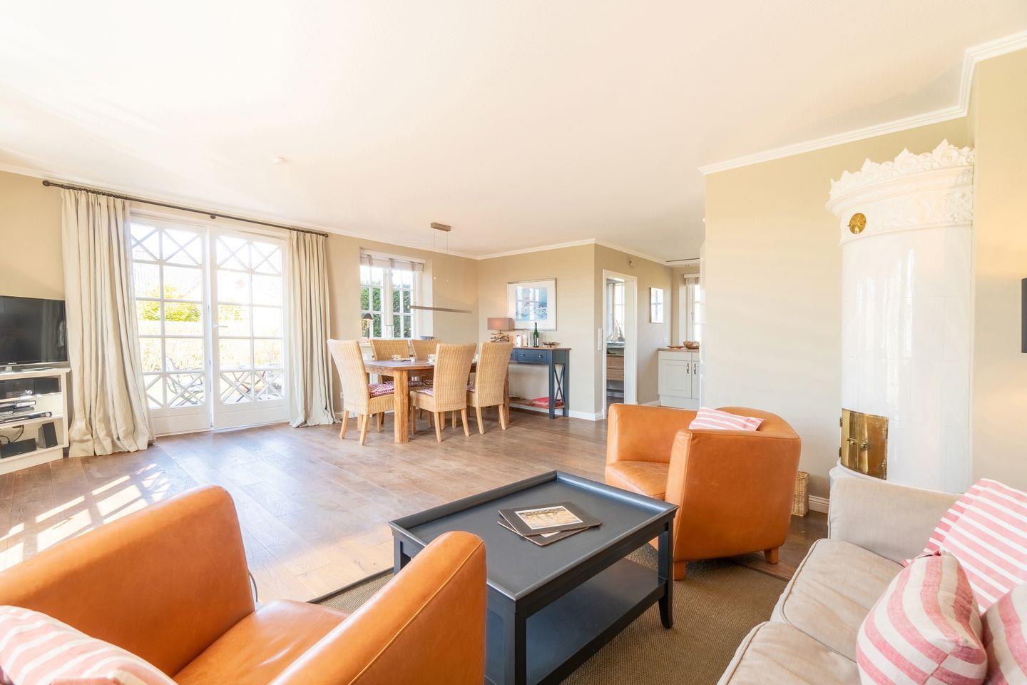 Im Erdgeschoss befindet sich das großzügige, lichtdurchflutete Wohn- und Esszimmer mit offener Küche. Von hier aus gelangen Sie direkt auf die eigene Terrasse mit Strandkorb und in den Garten. Der Original Mylin-Kachelofen im Wohnbereich sorgt auch an kühleren Tagen für eine angenehme Atmosphäre.