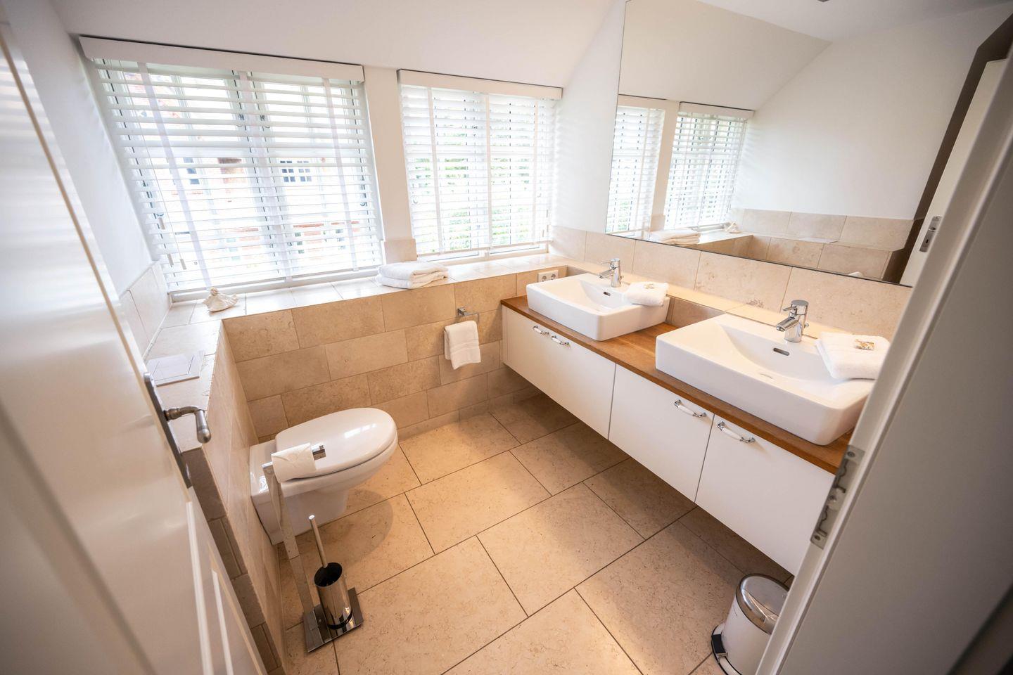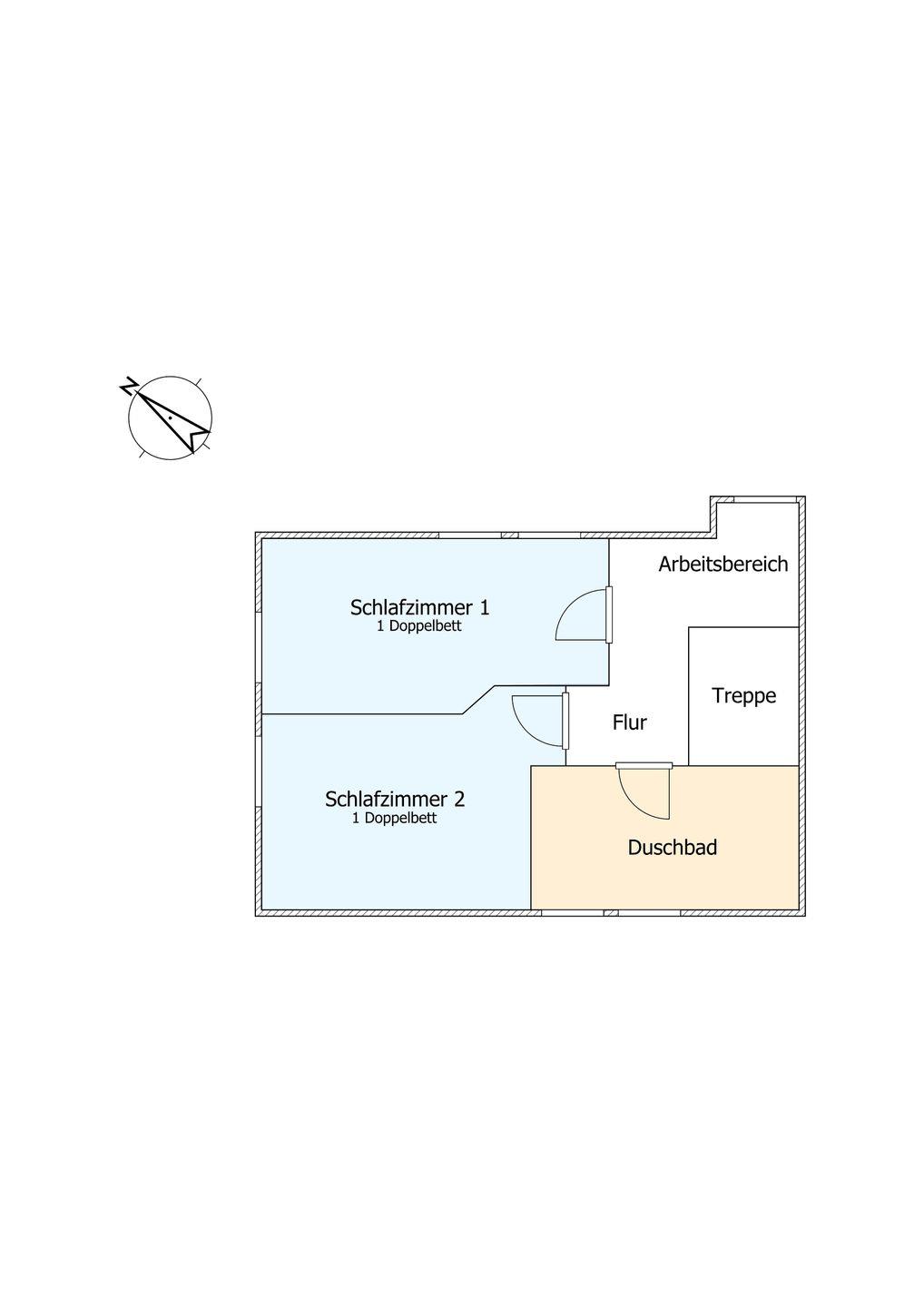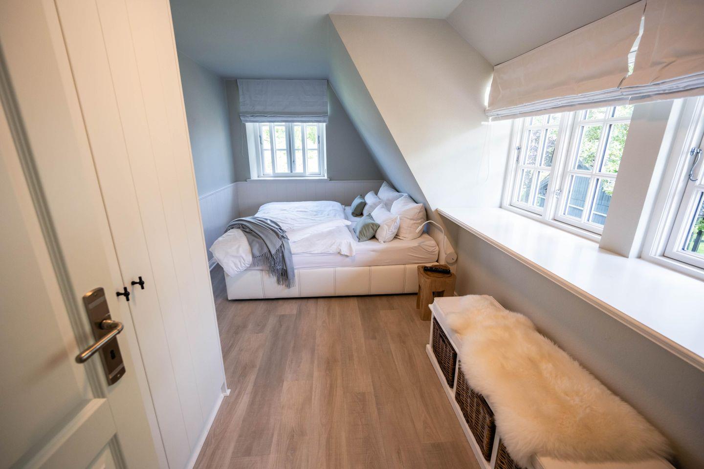 Im Obergeschoss sind die beiden Schlafzimmer mit je einem Doppelbett - davon 1 Boxspringbett -, ein Duschbad sowie ein Lese- und Arbeitsbereich im Flur gelegen.