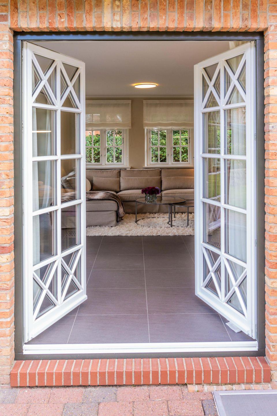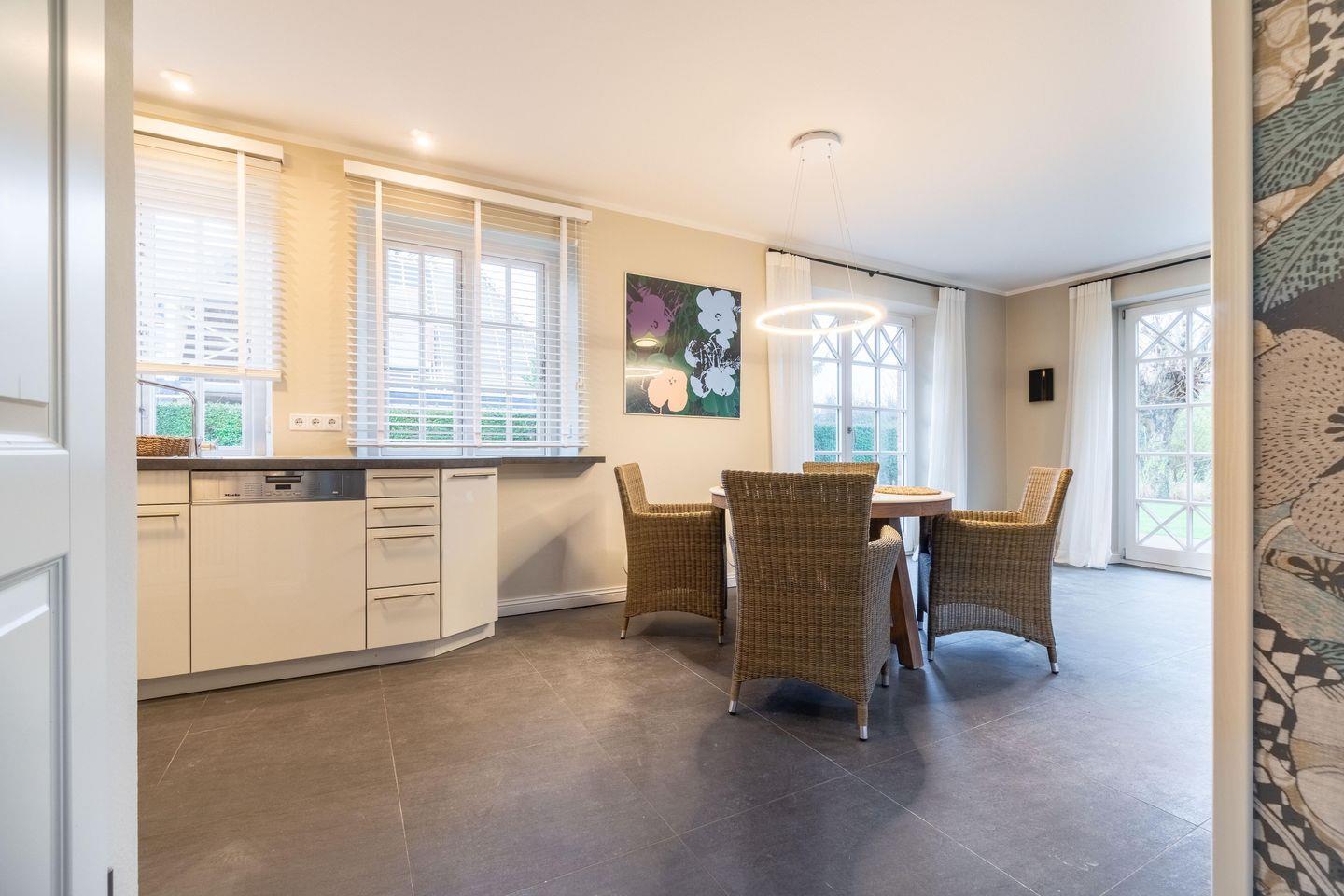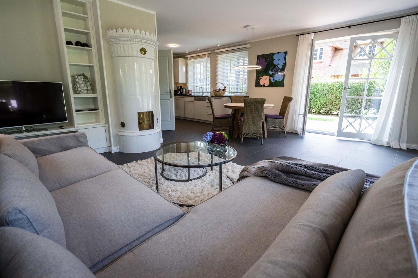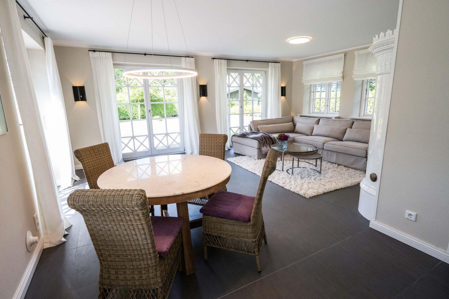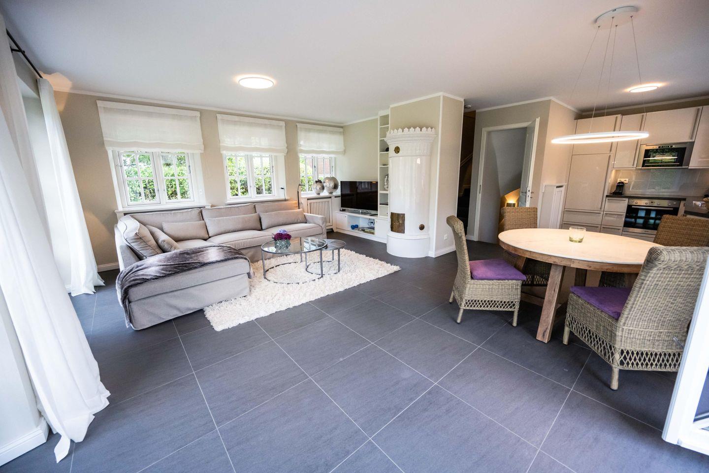 Im Erdgeschoss befindet sich das großzügige Wohn- und Esszimmer mit offener Küche und direktem Zugang zur hauseigenen Terrasse und in den Garten. Der Original Mylin-Kachelofen im Wohnbereich sorgt auch an kühleren Tagen für eine angenehme Atmosphäre.