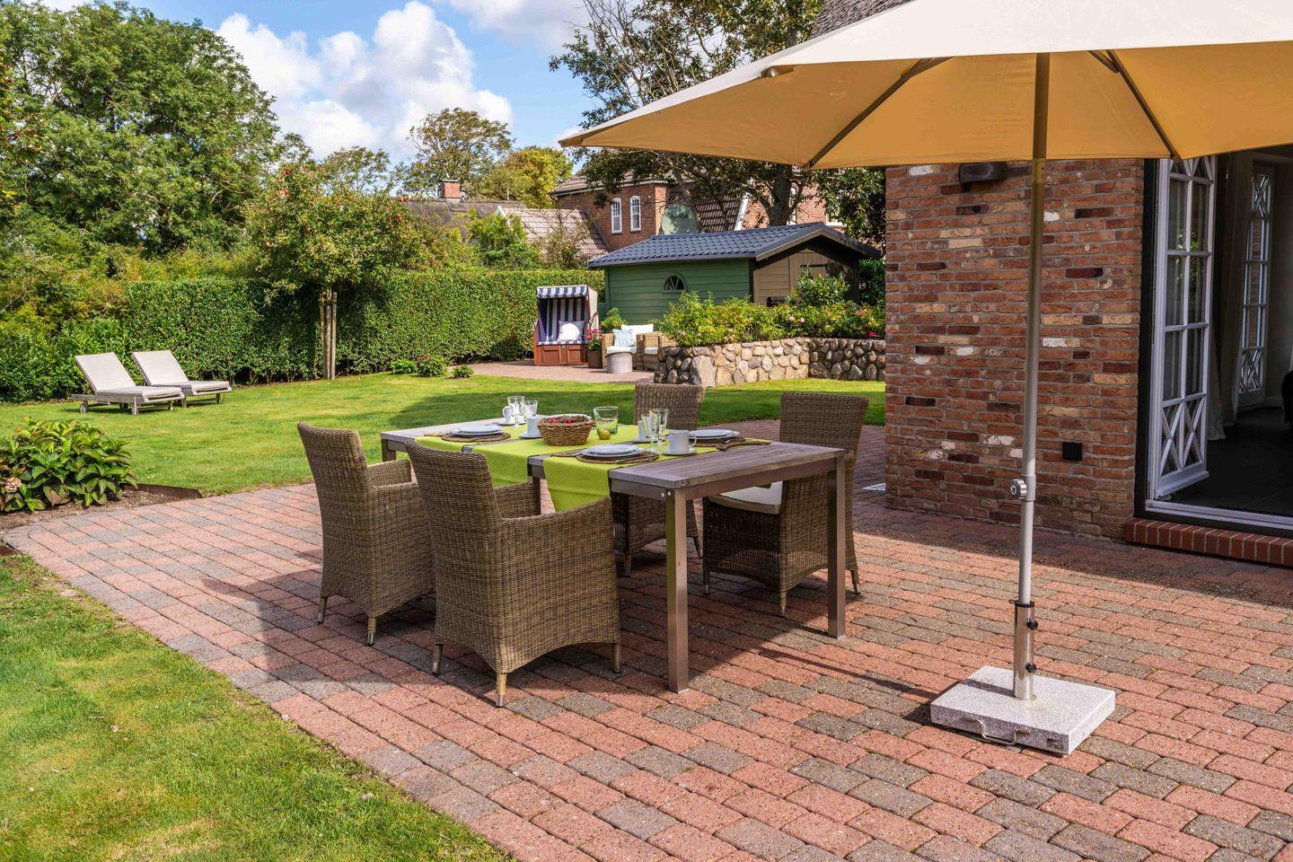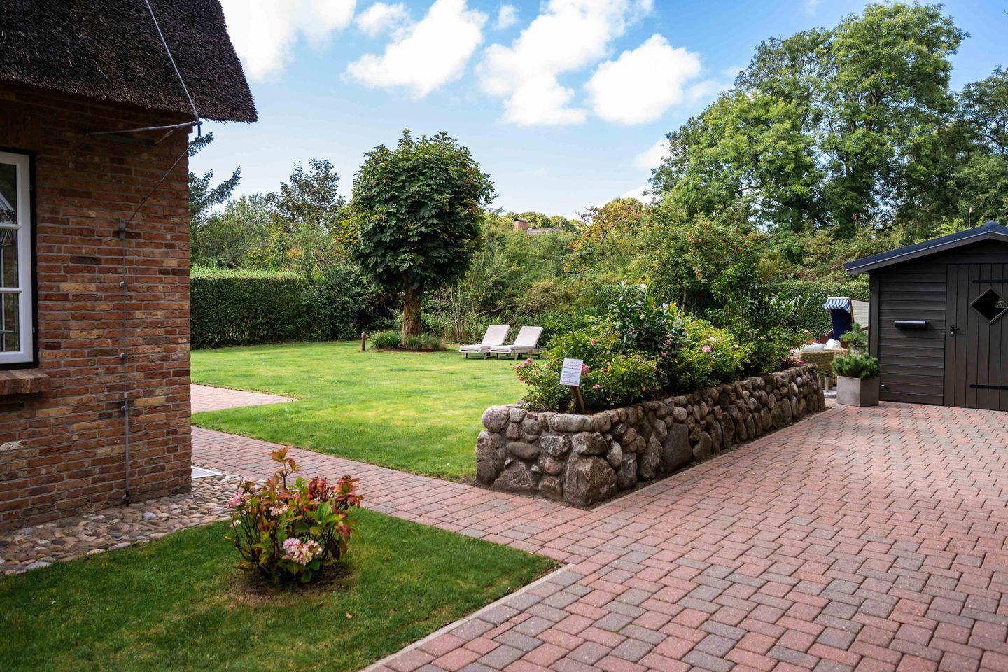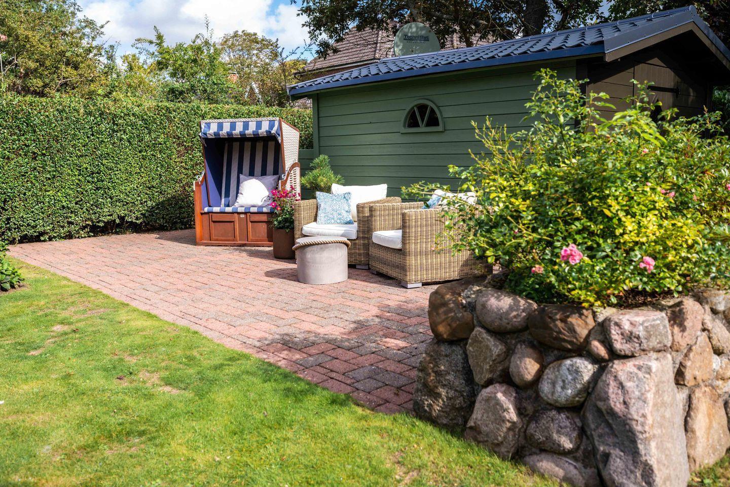 An Sonnentagen genießen Sie den Garten mit Strandkorb und Liegen und träumen Sie unter der großen Kastanie. Im Gartenhaus haben Sie ganzjährig Platz, noch zwei Fahrräder abzustellen. Bei kühlem Wetter entspannen Sie im Wellnessbereich und am antiken Kamin.