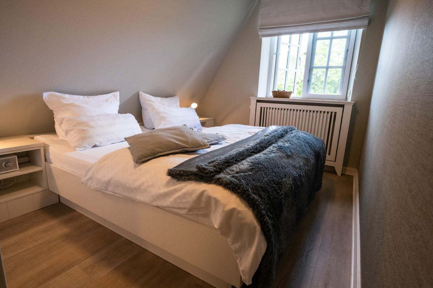 Die reetgedeckte Doppelhaushälfte Smuk Huus verfügt über 2 Schlafzimmer und 2 Bäder und bietet somit komfortabel Platz für bis zu 4 Personen zuzüglich einer Kleinkinderaufbettung. Auch ein Hund ist hier, von September bis Juni, herzlich willkommen.