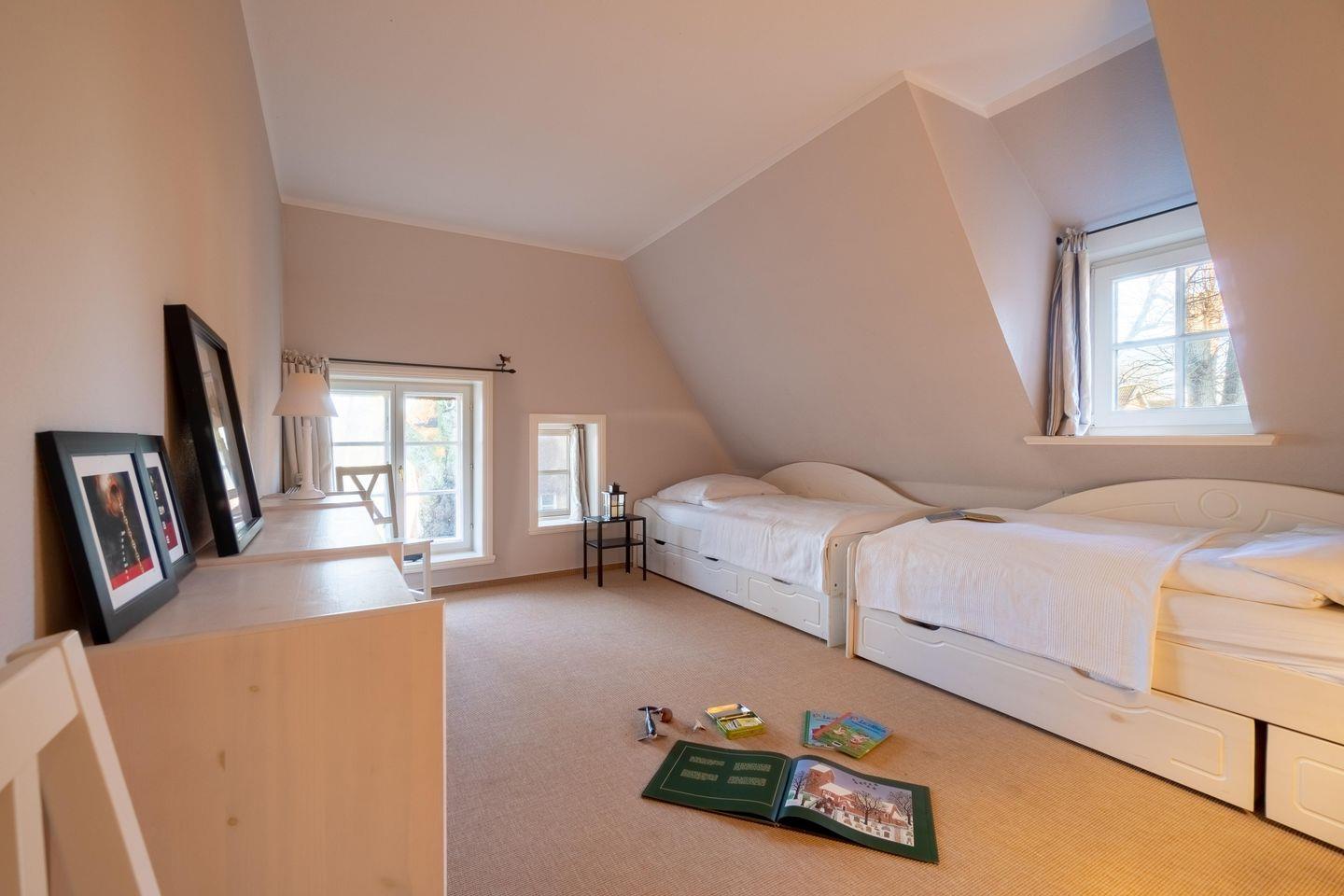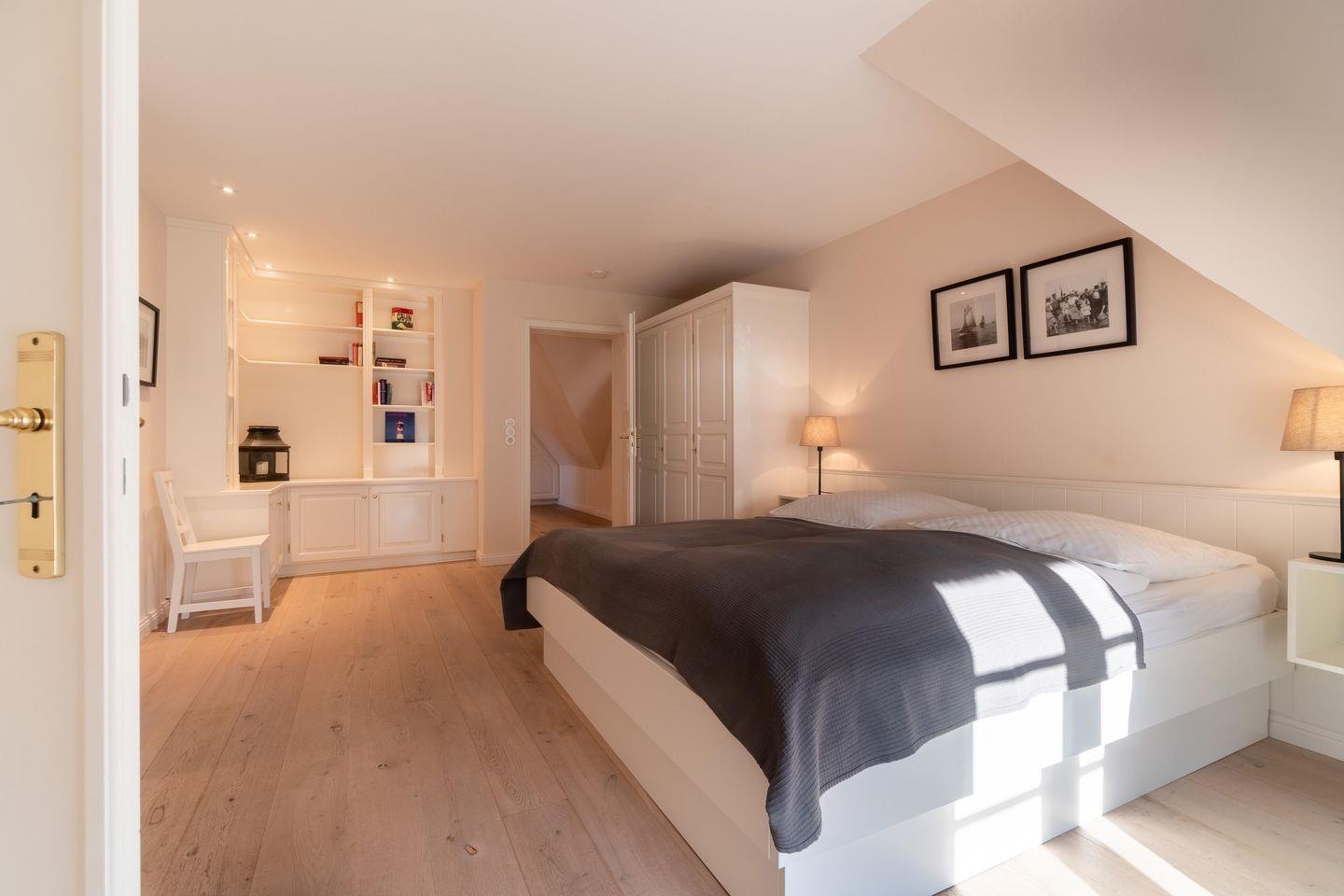 Im Obergeschoss sind die vier weiteren Schlafzimmer - drei mit je einem Doppelbett und eines mit zwei Einzelbetten -, das dritte TV-Zimmer sowie das zweite Vollbad gelegen. Drei der Schlafzimmer verfügen jeweils über ein Duschbad en Suite.