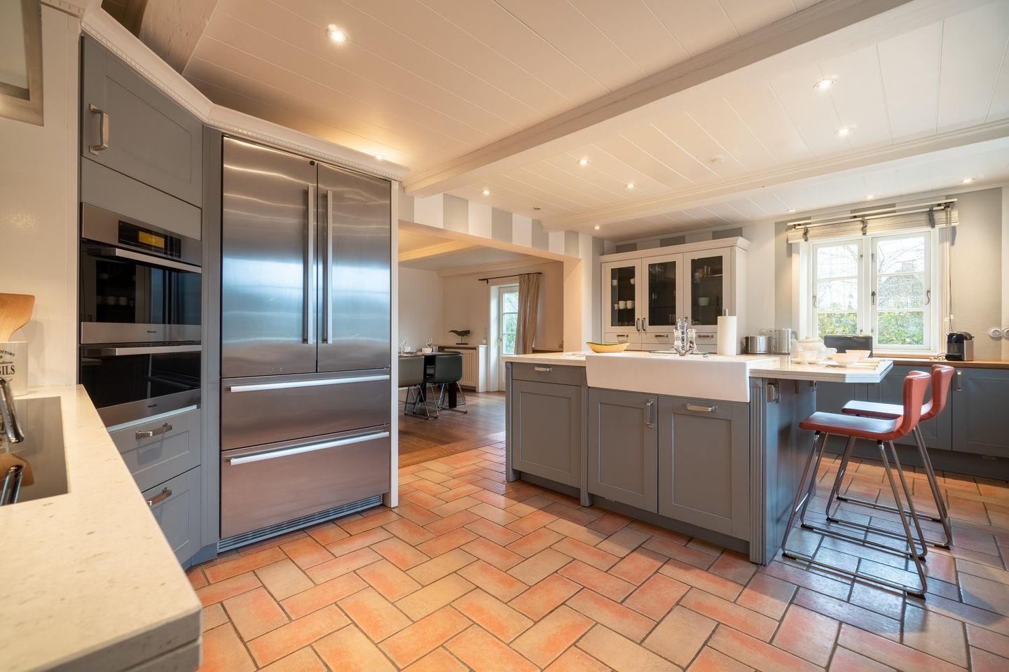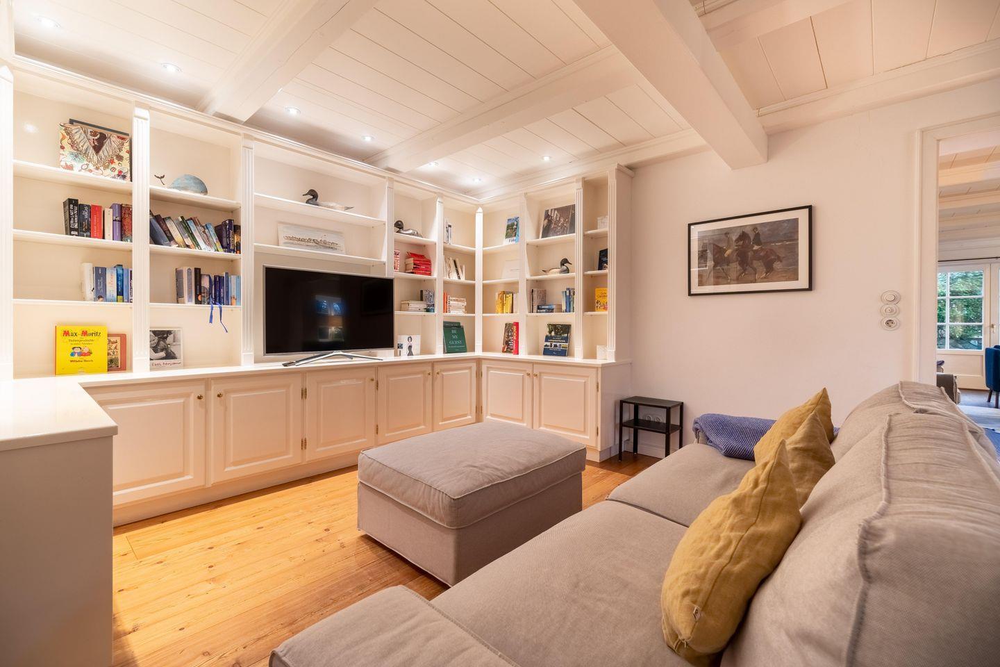 Im Erdgeschoss befinden sich das großzügige Wohnzimmer, zwei TV-Zimmer, ein Esszimmer mit angrenzender Küche, ein Schlafzimmer mit Doppelbett und Duschbad en Suite, sowie ein Vollbad. Über das Wohnzimmer und das Esszimmer gelangen Sie direkt in den Garten und auf die Terrasse. Der antike Kachelofen im Wohnzimmer sorgt auch an kühleren Tagen für eine angenehme Atmosphäre. Im Wohnzimmer steht Ihnen zudem ein Arbeitsbereich mit einem Schreibtisch zur Verfügung. Das Herzstück der Küche bildet sicherlich die großzügige Kochinsel, die jeden Hobbykoch begeistern wird.