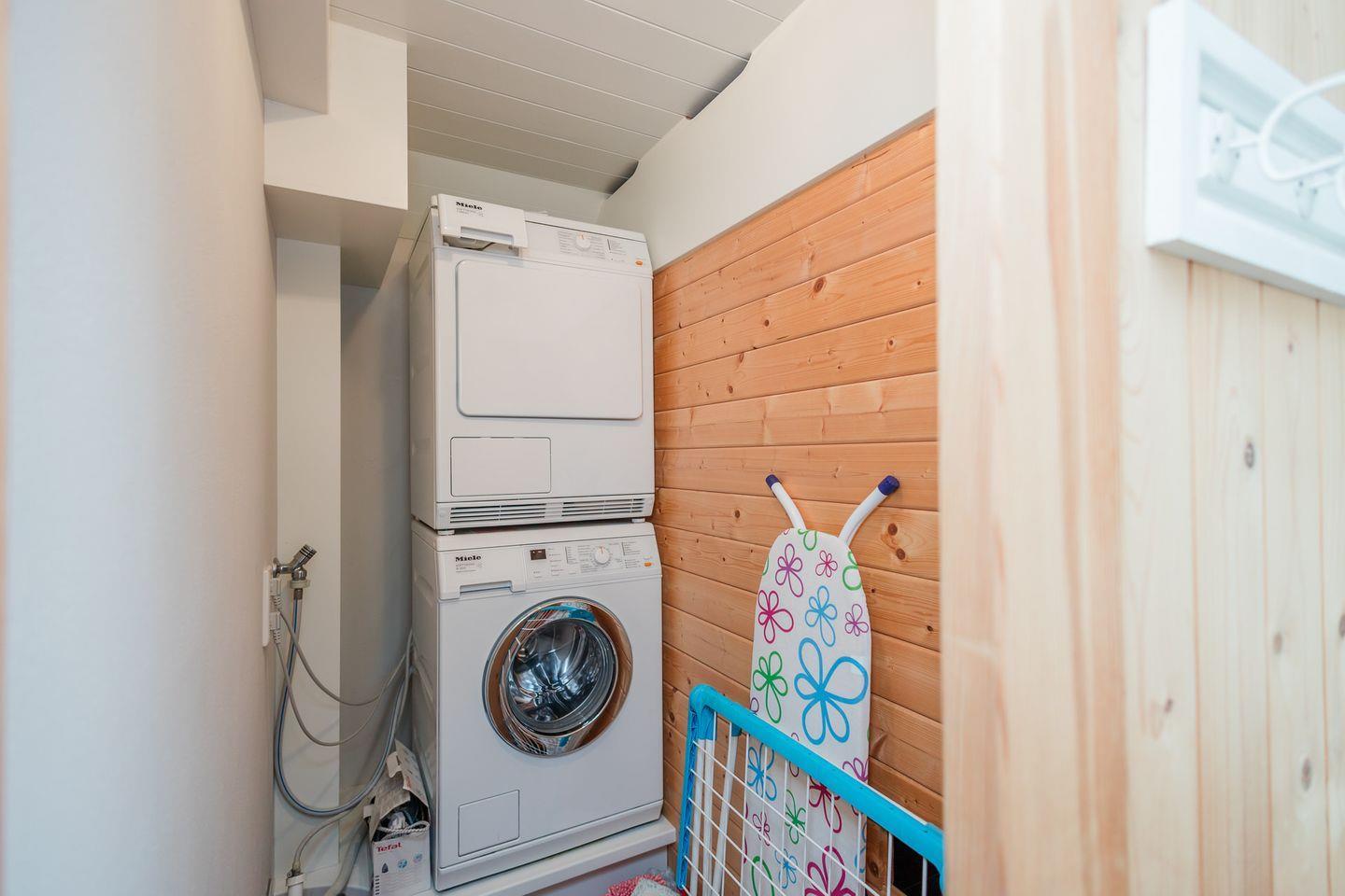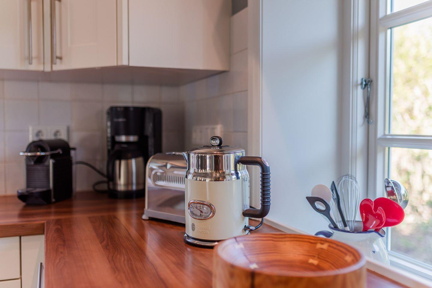 Im Erdgeschoss befinden sich der großzügige Wohn- und Essbereich mit offener Küche, ein Schlafzimmer mit Einzelbett, ein Duschbad sowie der Wellnessraum mit der hauseigenen Sauna und separater Dusche. Über den Wohnbereich und den Wellnessraum gelangen Sie direkt auf die eigene Terrasse und in den Garten. Der Kaminofen im Wohnbereich sorgt auch an kühleren Tagen für eine angenehme Atmosphäre.