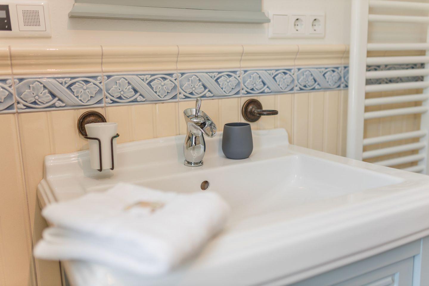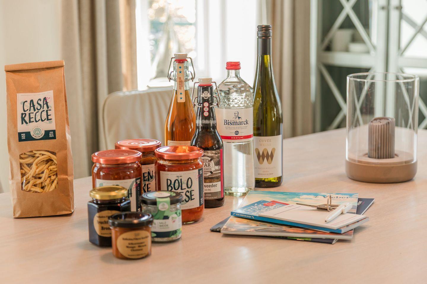 Bei Begrüßung erwartet Sie neben einer Flasche Wein und Wasser ein Präsentkorb im Einkaufswert in Höhe von 75 €, der ausschließlich Produkte der Insel Föhr in Abhängigkeit der Jahreszeiten und Verfügbarkeiten bereithält, individuell für Sie zusammengestellt.