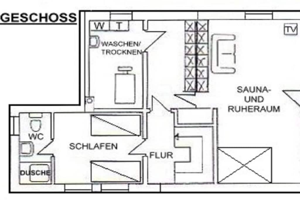 Fire Alarm, Hot Water, Vacuum Cleaner, Kitchen(hob, oven, fridge), Living/diningroom(Sofa, TV, dining table, fireplace), bedroom(Wardrobe, double bed, TV), bedroom(Wall Bed, Wardrobe, single bed), bedroom(Wardrobe, single bed, single bed), bathroom(Mirror, toilet, bath tub, shower, washbasin), bathroom(Mirror, toilet, shower, washbasin), guest toilet(toilet, washbasin), Internet access, tumble dryer, washing machine, heating(Vacuum Cleaner, tumble dryer, washing machine, ironing board, iron), heating, terrace(garden furniture), garden, parking, parking, ironing board, iron, lounge set, drying cabinet, telephone