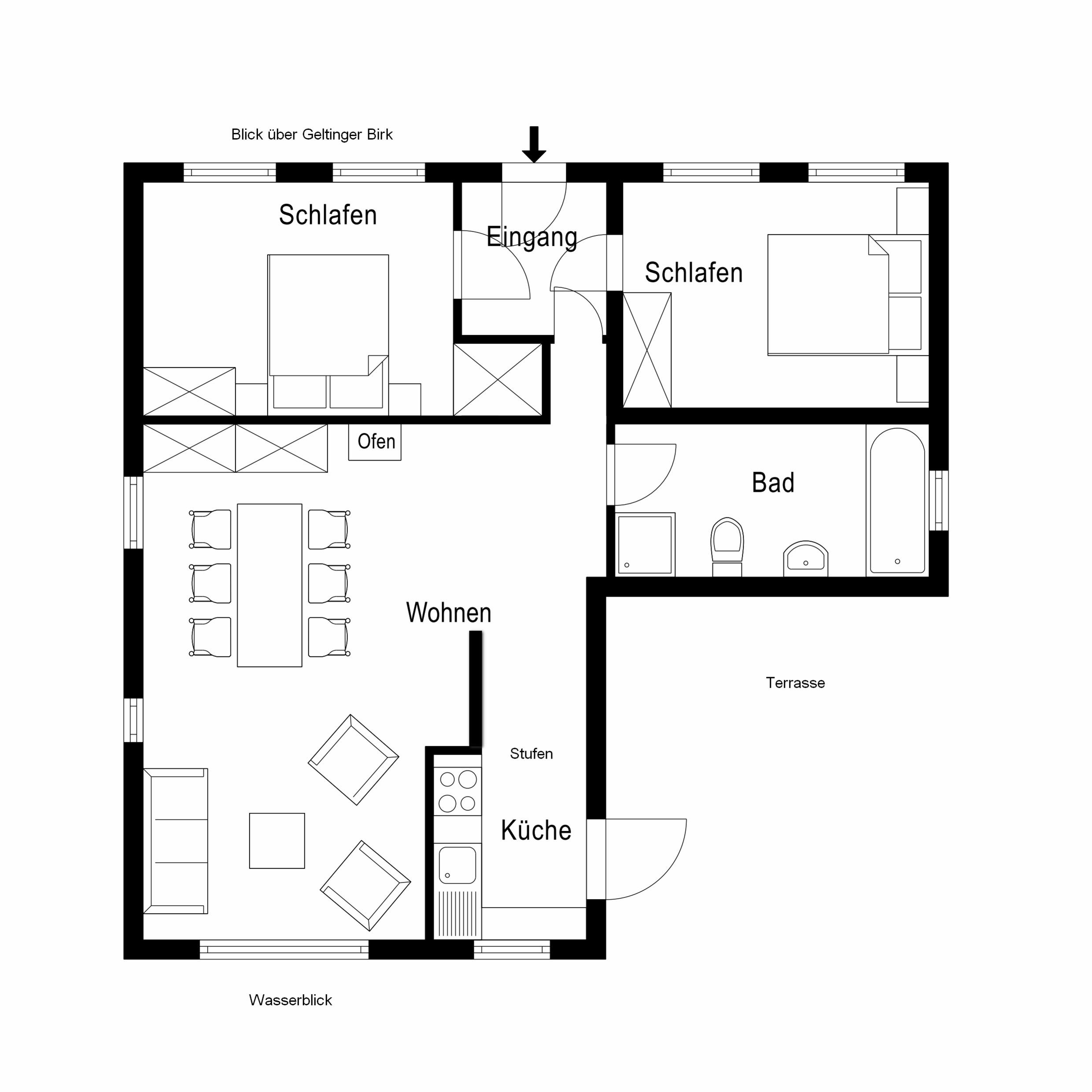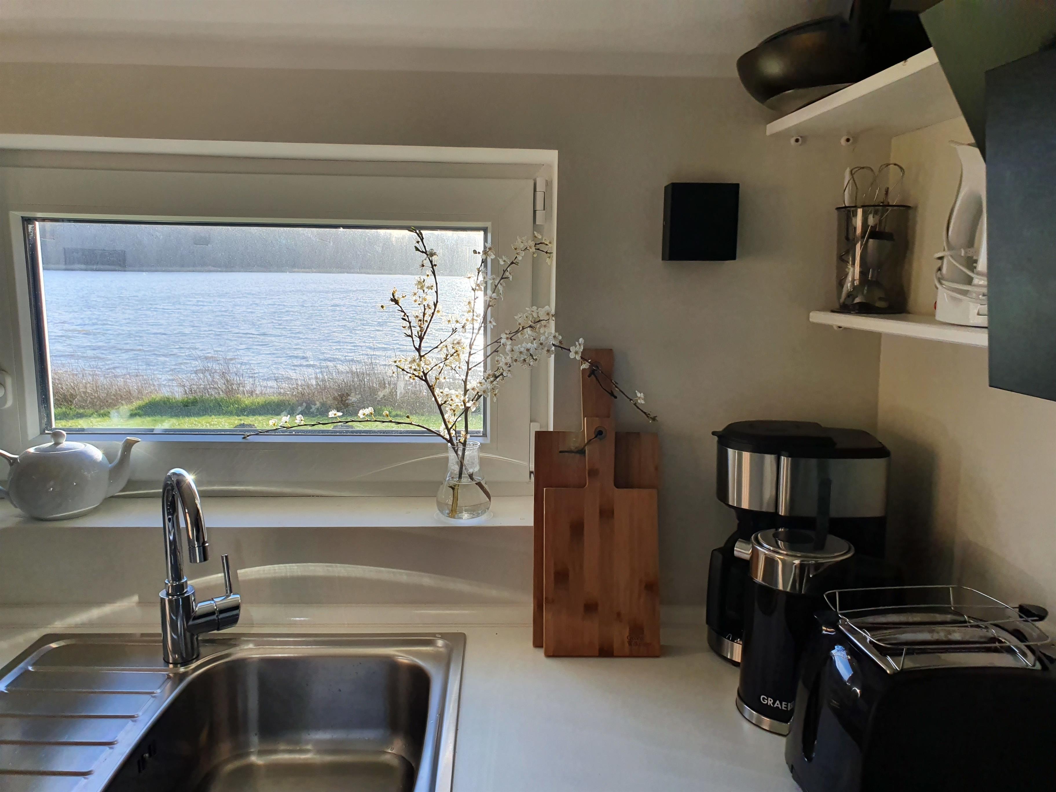 Wohn-Esszimmer mit Kaminofen und Wasserblick, kleine Küche mit Ausgang zu Terrasse und Garten, 2 Doppelzimmer, Bad mit bodengleicher Dusche und Badewanne