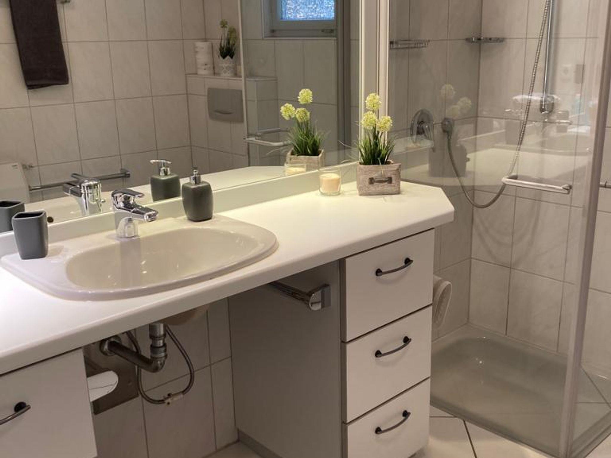 Der ca. 70 qm große Mietbereich umfasst Küche, Wohnzimmer, ein Schlafzimmer mit Doppelbett, sowie ein kleines Schlafzimmer mit zwei Hochbetten mit vier Schlafplätzen,ein großes behindertengerecht ausgebautes Badezimmer mit Dusche und eine Abstellkammer.