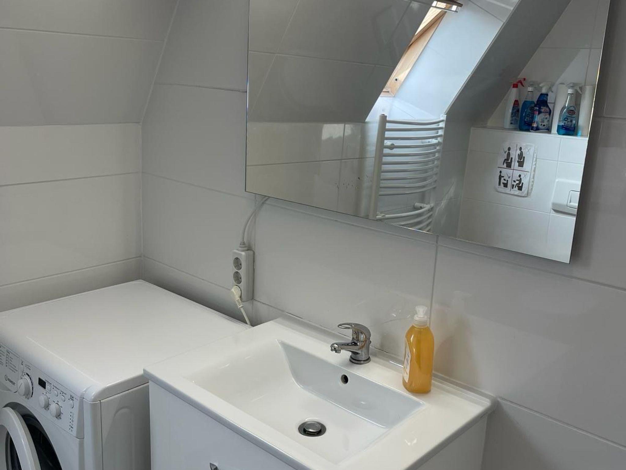 Das gemeinschaftliche Badezimmer verfügt außerdem über eine Waschmaschine.