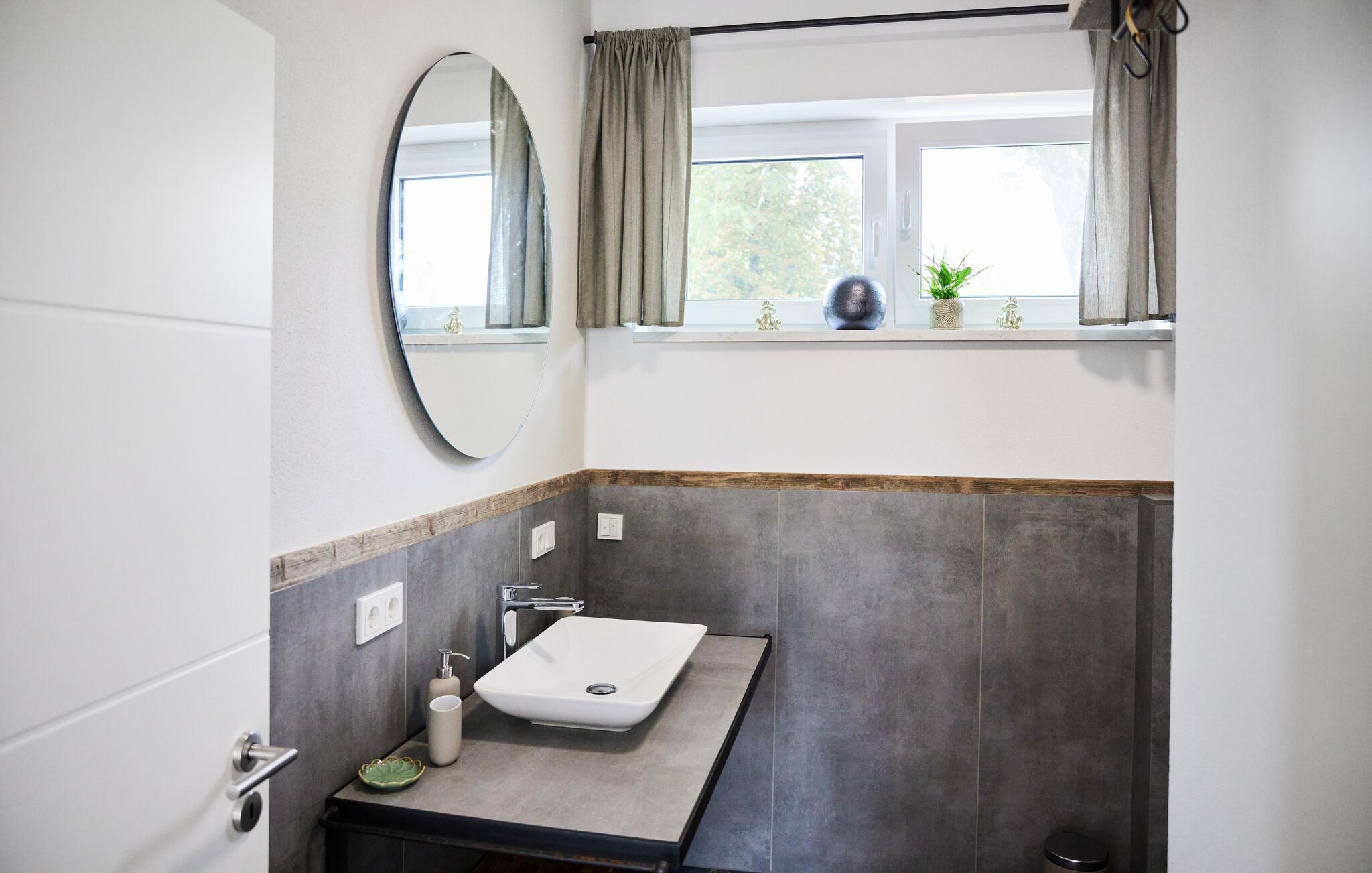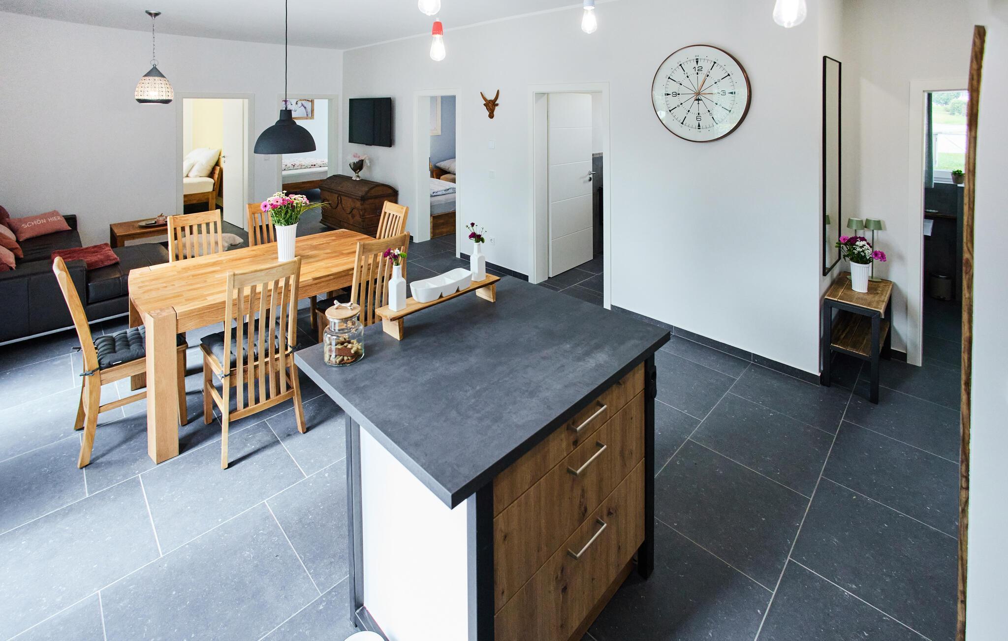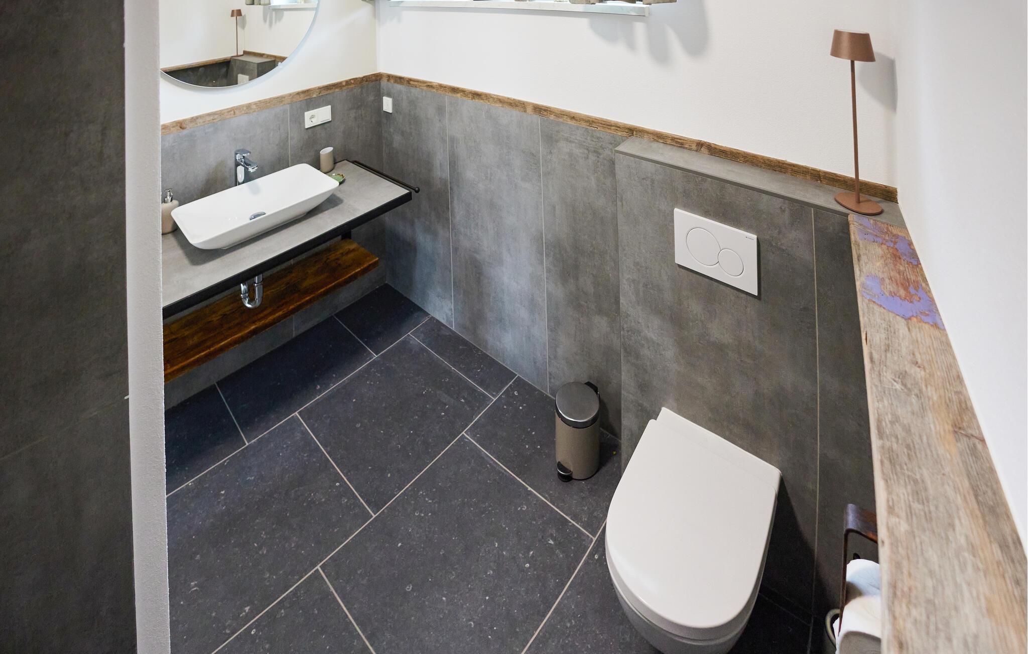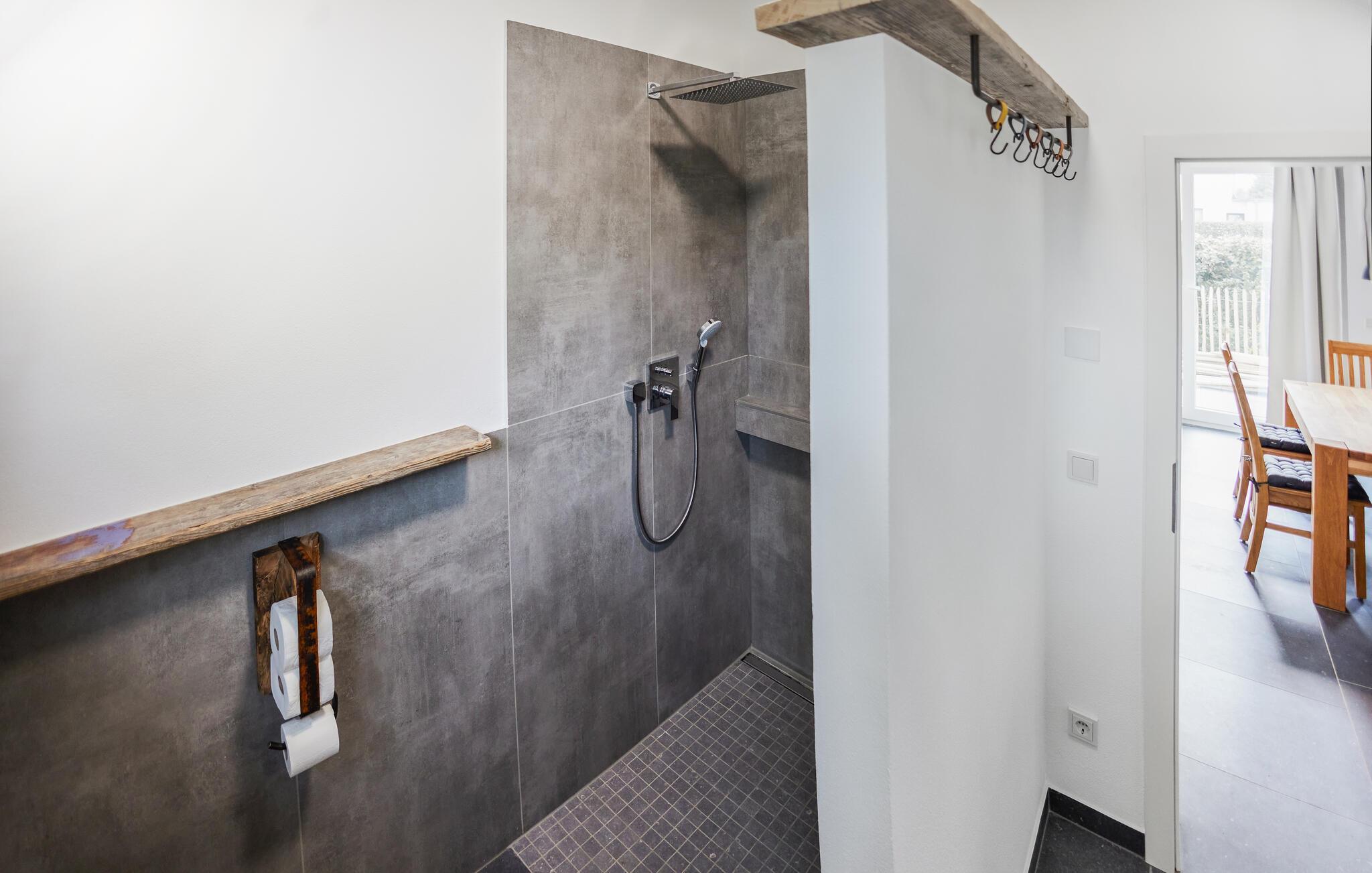 Erleben Sie pure Entspannung in dieser modernen und stilvollen Ferienwohnung. Die schicke Kombination aus dunklen Fliesen und hochwertigen Holzmöbeln schafft eine harmonische Atmosphäre, die zum Wohlfühlen einlädt. Die lichtdurchfluteten Räume im ersten Stock bieten Ihnen viel Platz zum Entspannen. Genießen Sie die offene Terrasse mit einem herrlichen Blick auf die Landschaft. Ein Zugang zum Bach und eine Feuerschale im Garten bieten Ihnen besondere Momente in der Natur. Perfekt für gemütliche Abende unter freiem Himmel.