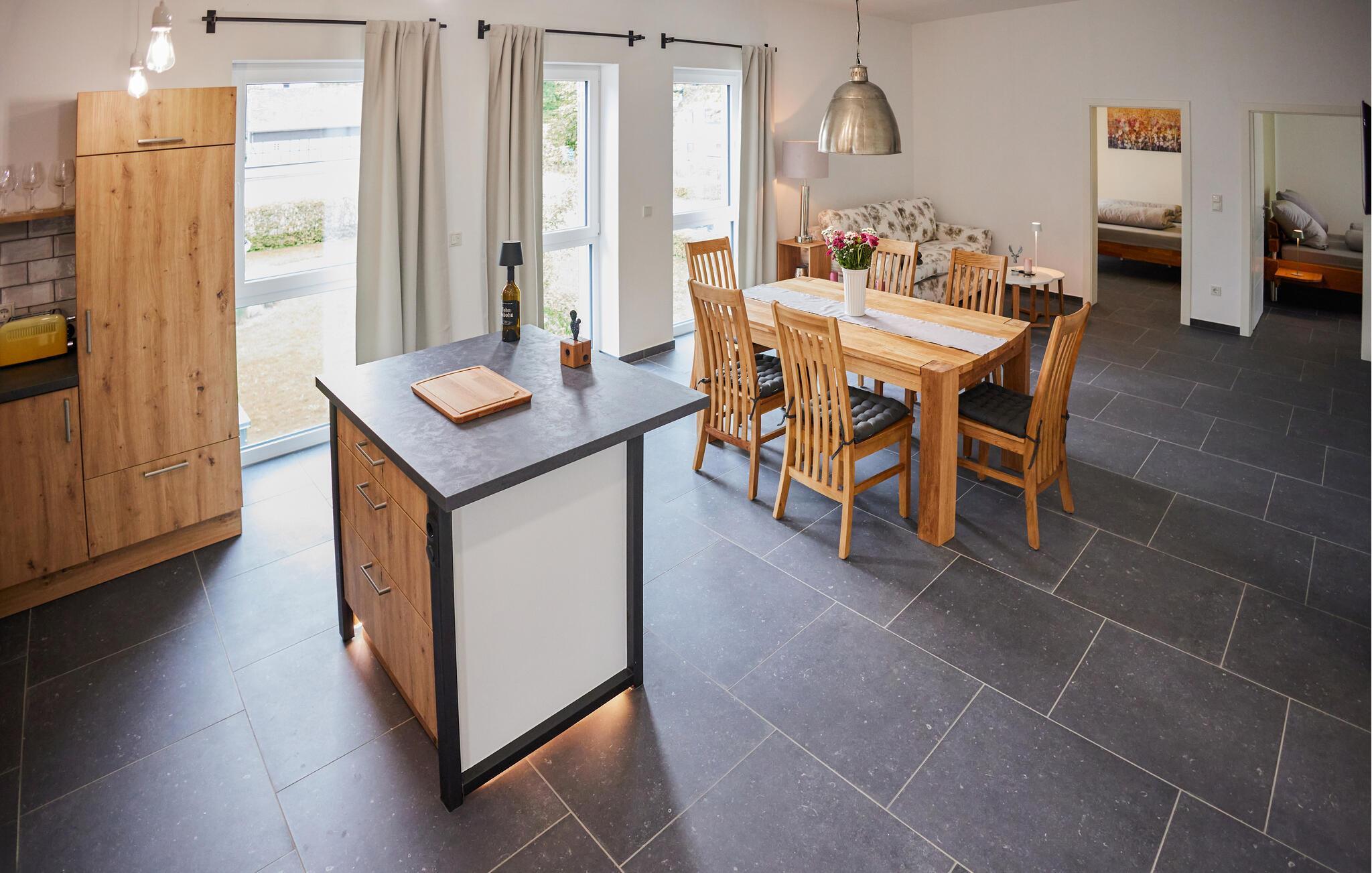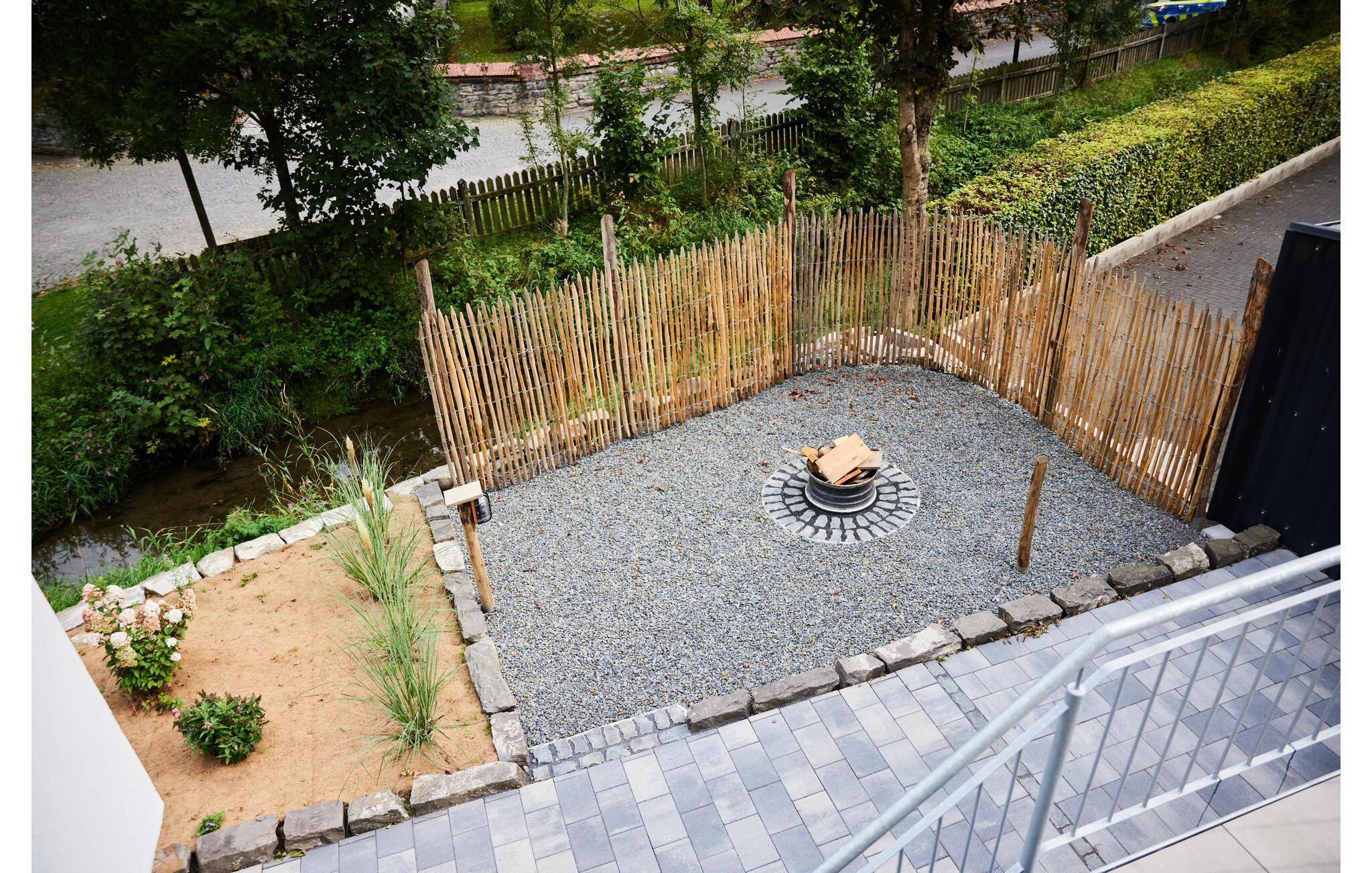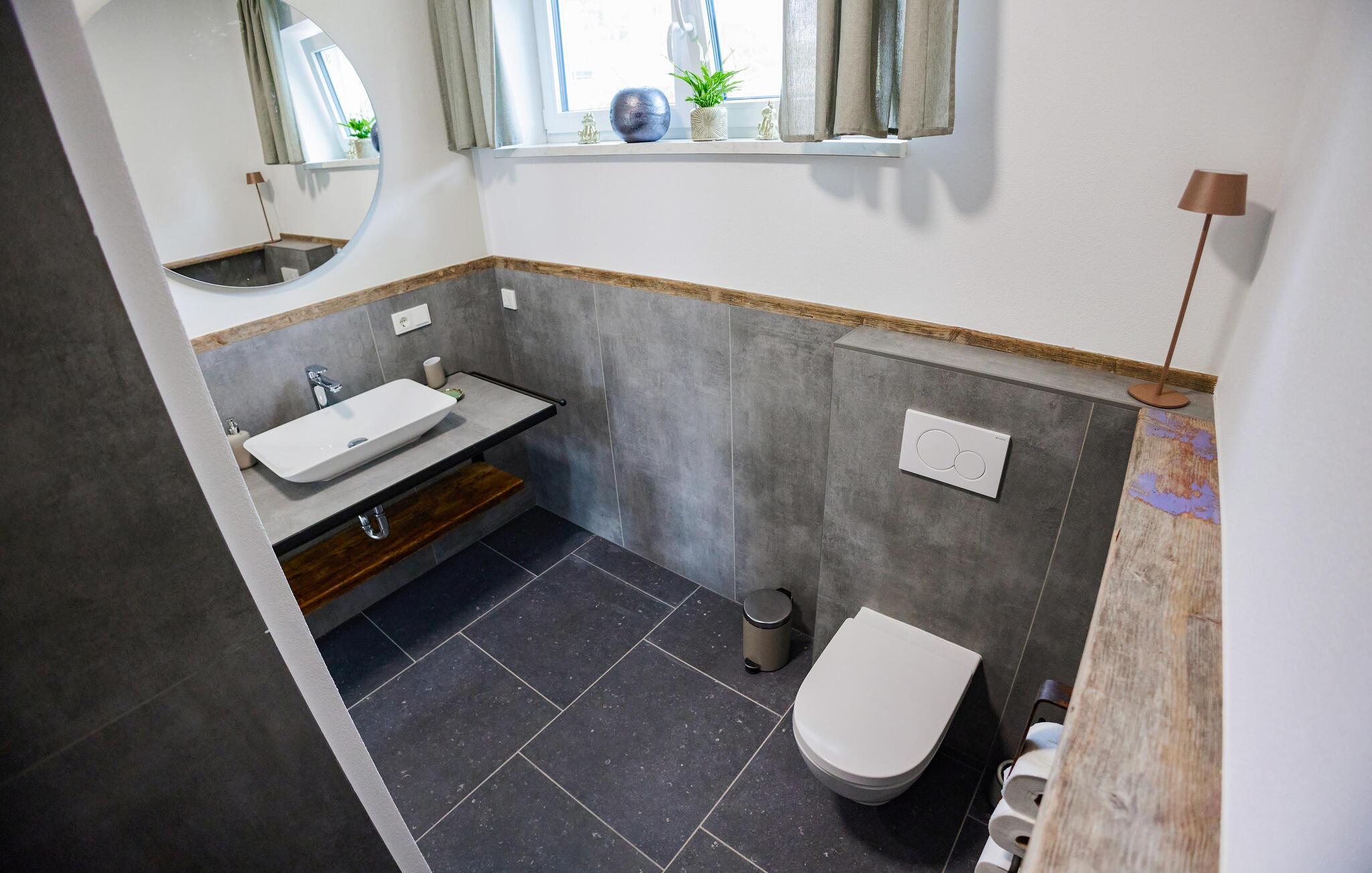 Erleben Sie pure Entspannung in dieser modernen und stilvollen Ferienwohnung. Die schicke Kombination aus dunklen Fliesen und hochwertigen Holzmöbeln schafft eine harmonische Atmosphäre, die zum Wohlfühlen einlädt. Die lichtdurchfluteten Räume im ersten Stock bieten Ihnen viel Platz zum Entspannen. Genießen Sie die offene Terrasse mit einem herrlichen Blick auf die Landschaft. Ein Zugang zum Bach und eine Feuerschale im Garten bieten Ihnen besondere Momente in der Natur. Perfekt für gemütliche Abende unter freiem Himmel.