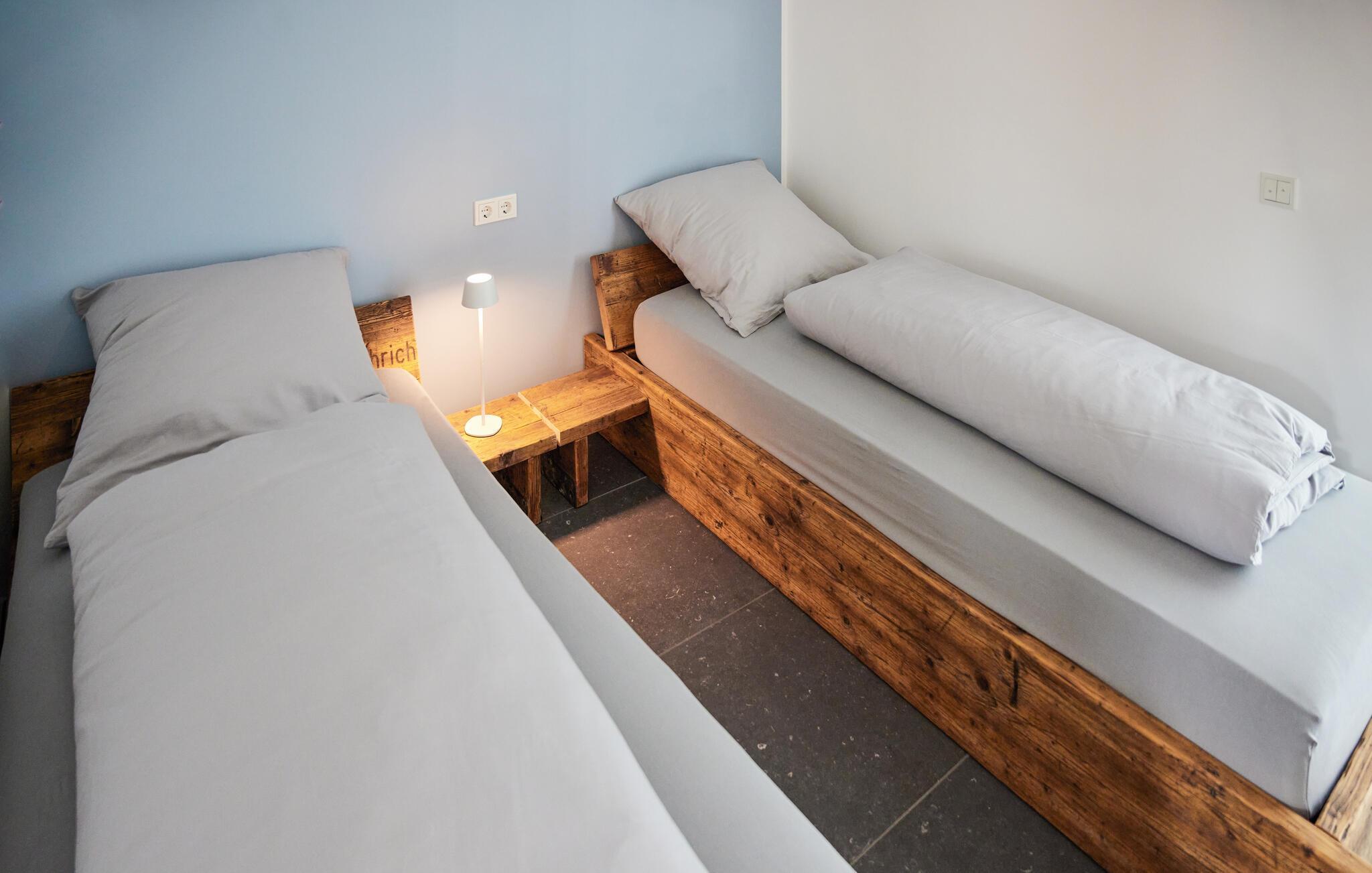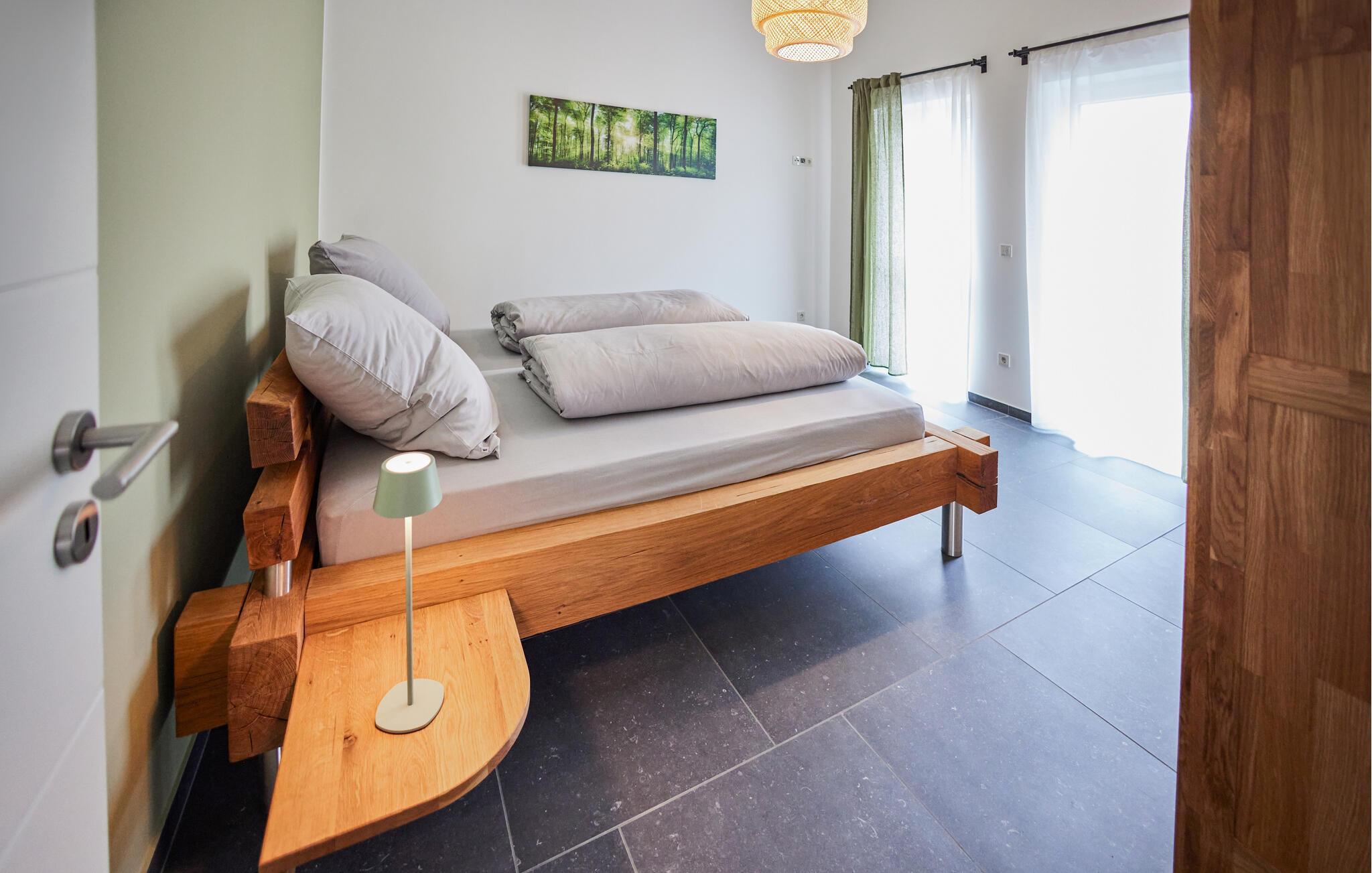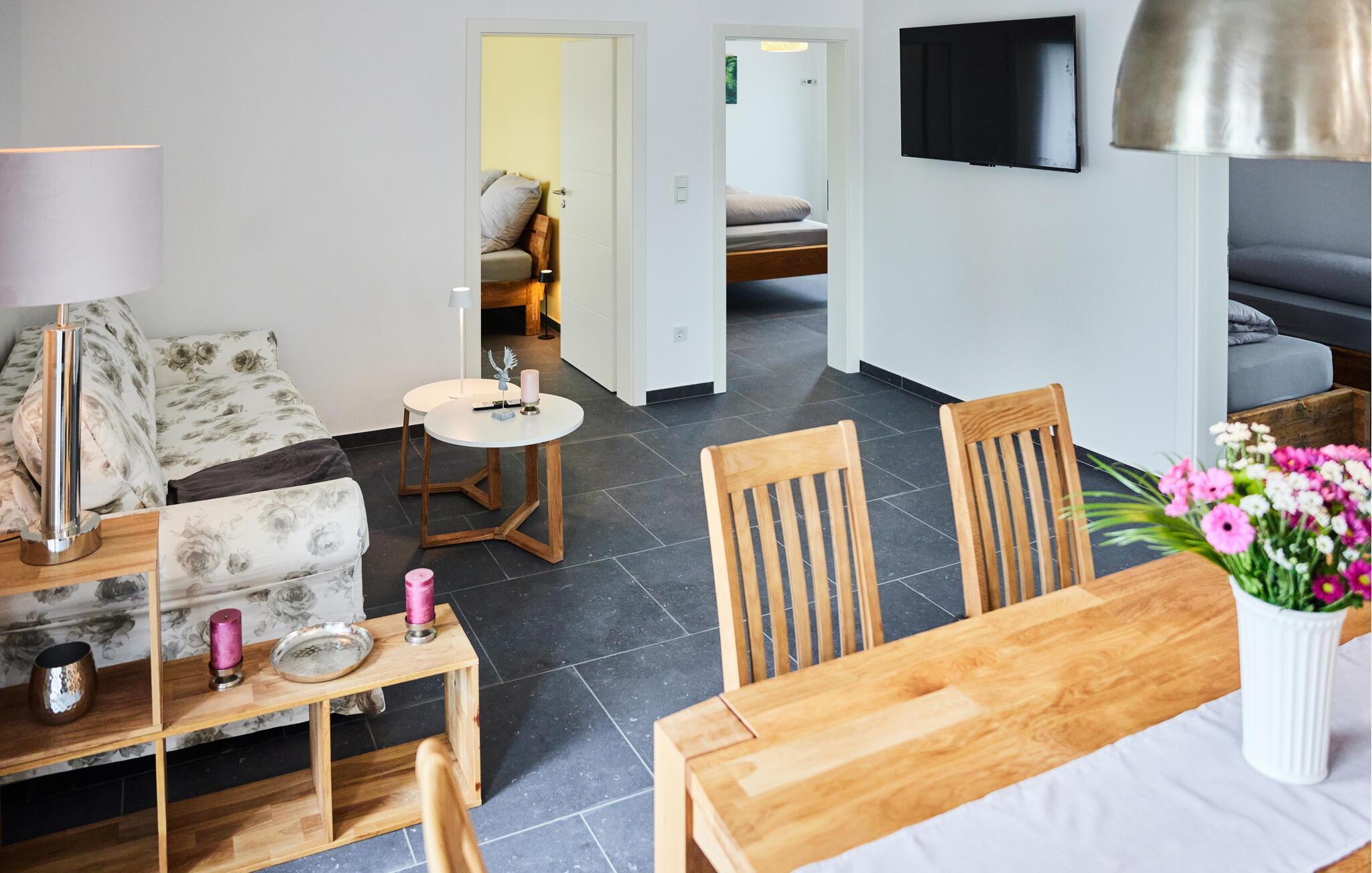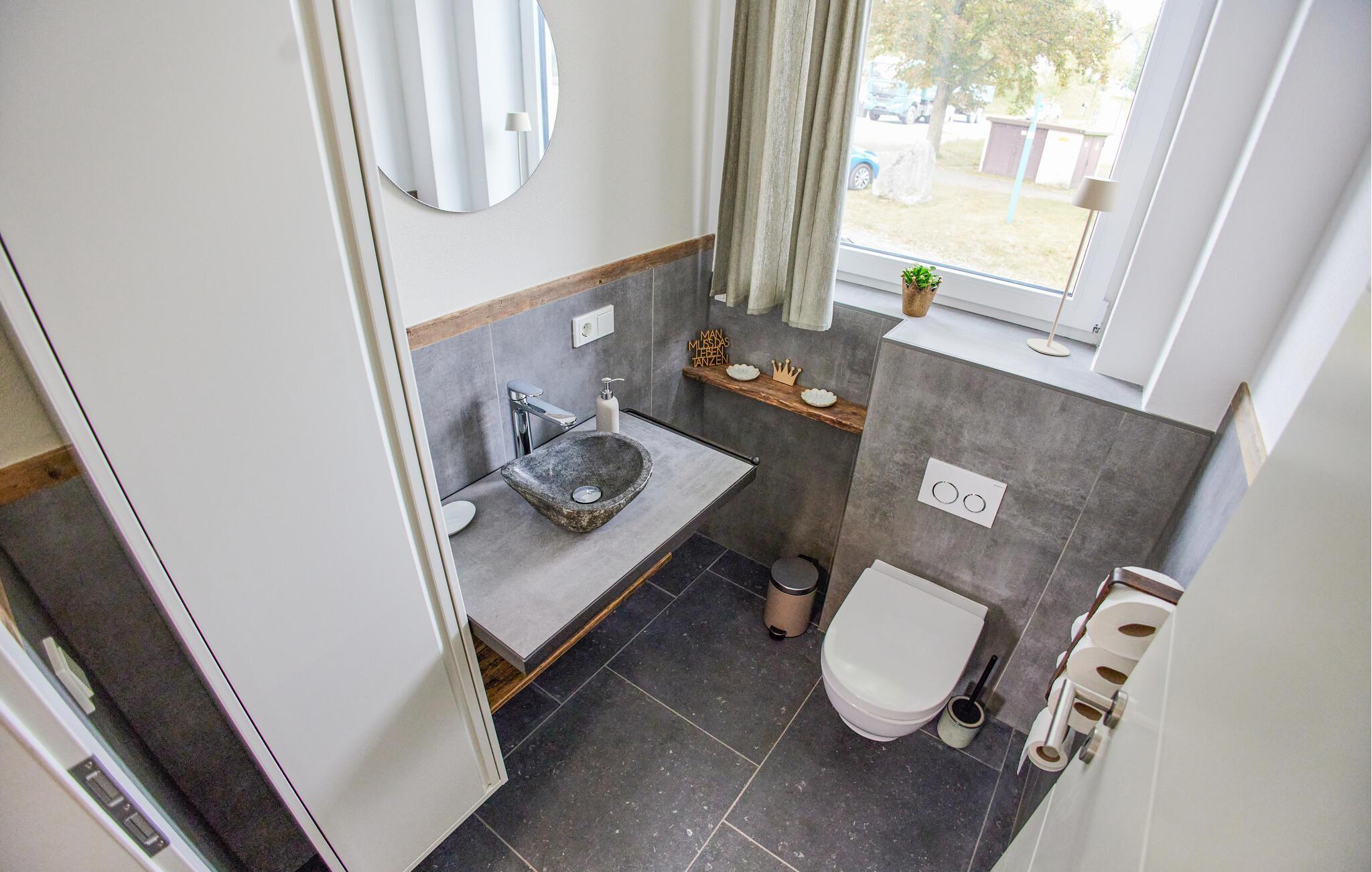 Erleben Sie pure Entspannung in dieser modernen und stilvollen Ferienwohnung. Die schicke Kombination aus dunklen Fliesen und hochwertigen Holzmöbeln schafft eine harmonische Atmosphäre, die zum Wohlfühlen einlädt. Die lichtdurchfluteten Räume im ersten Stock bieten Ihnen viel Platz zum Entspannen. Genießen Sie die offene Terrasse mit einem herrlichen Blick auf die Landschaft. Ein Zugang zum Bach und eine Feuerschale im Garten bieten Ihnen besondere Momente in der Natur. Perfekt für gemütliche Abende unter freiem Himmel.