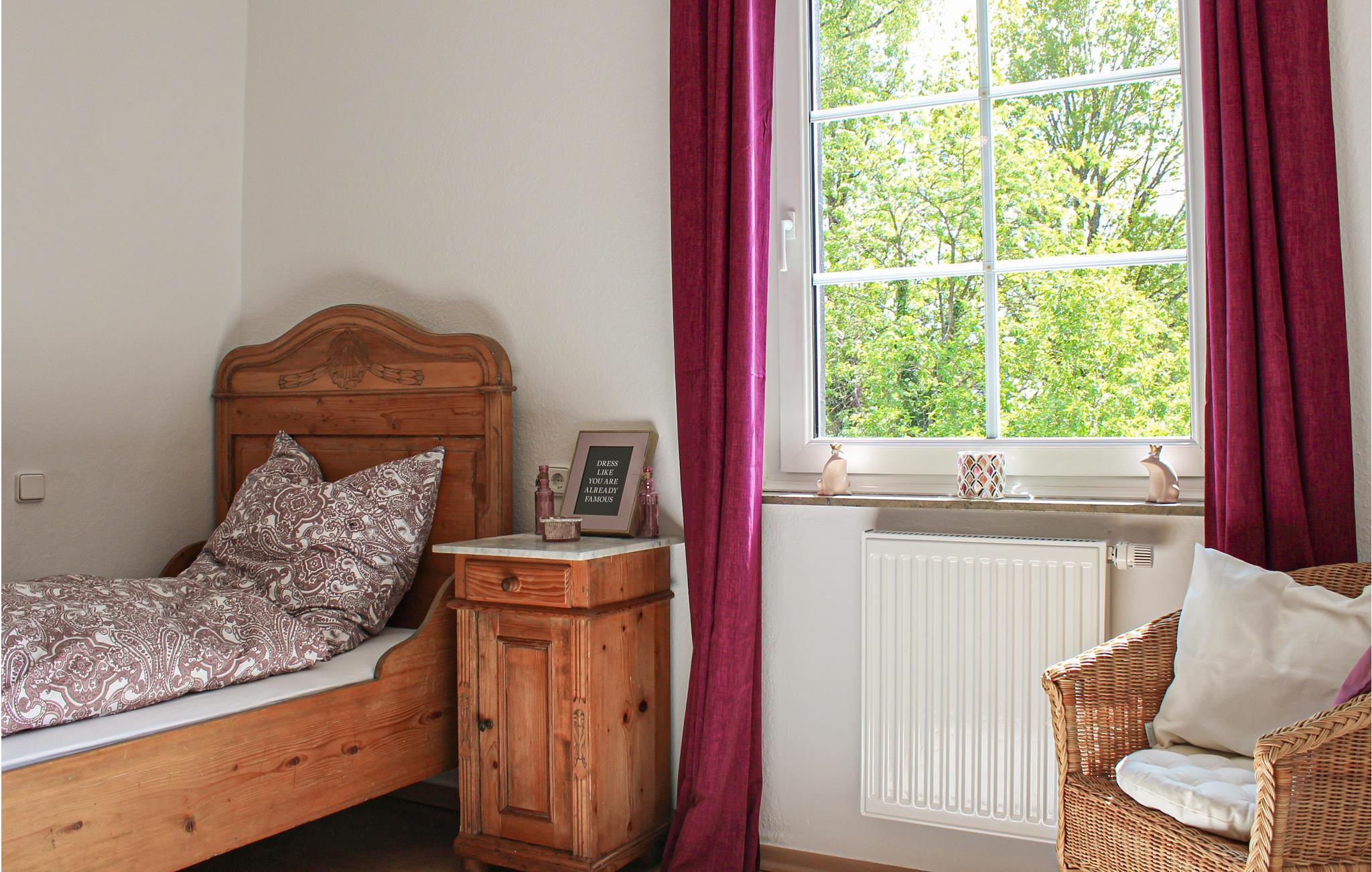 Im oberen Geschoss befindet sich das Badezimmer mit Dusche sowie drei Schlafzimmer. Zwei davon haben jeweils ein großes Doppelbett. Im dritten Schlafzimmer befindet sich ein hölzernes Einzelbett. Dieses Möbelstück, wie auch andere in Ihrer Ferienwohnung, sind sehr gut erhaltene Antiquitäten und passen ideal in die Atmosphäre eines Fachwerkhauses.