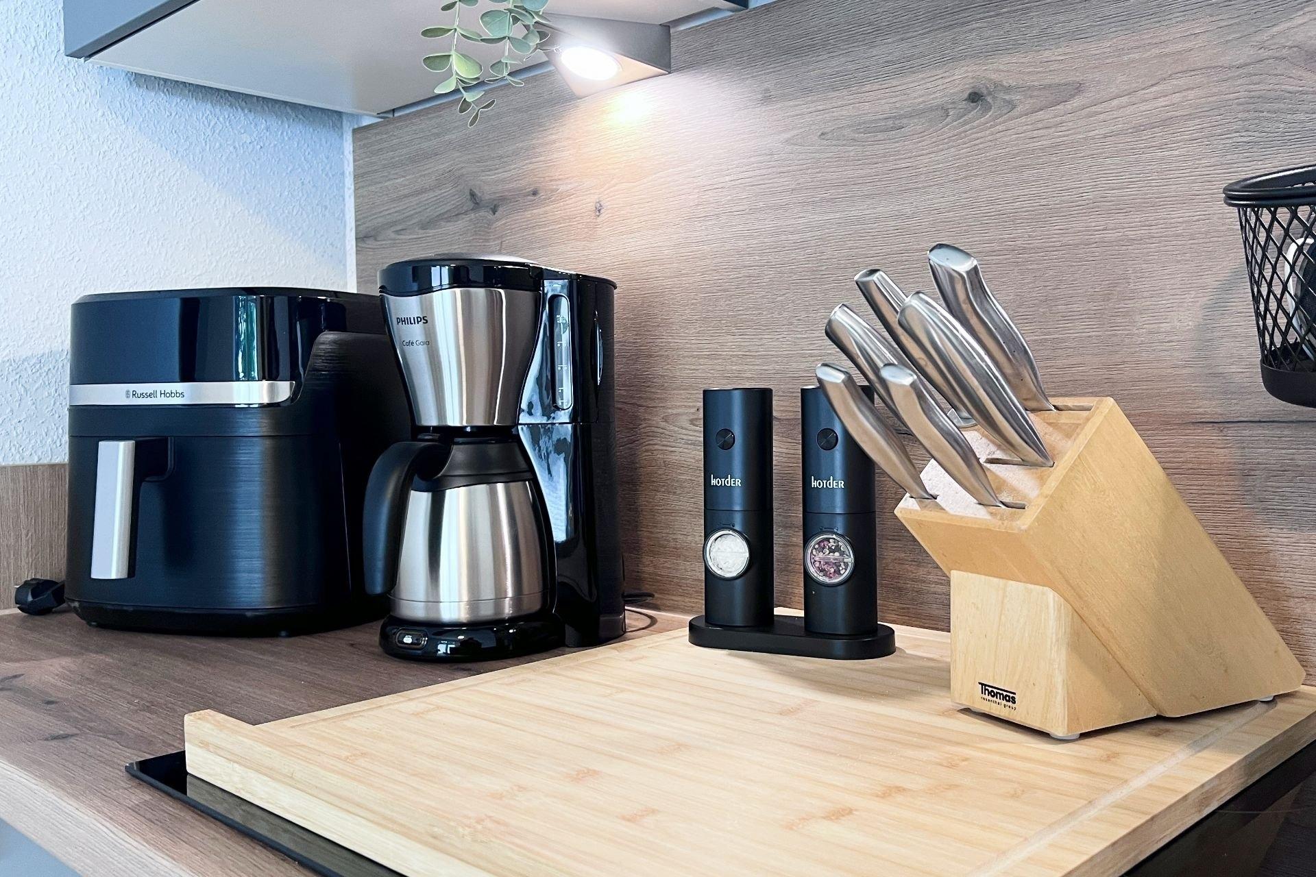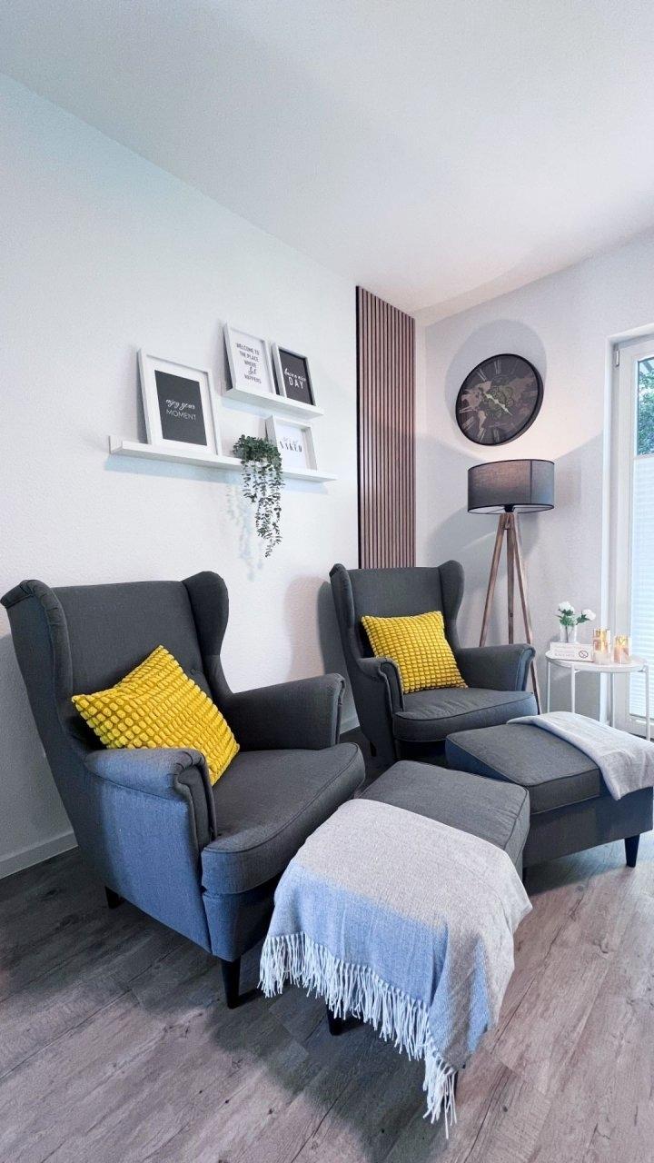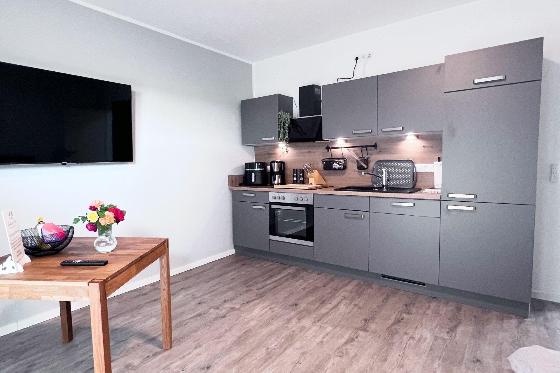 Die Wohnung bietet auf kleiner Fläche viel Komfort: ein gemütlicher Schlafbereich mit hochwertigem Boxspringbett, eine moderne Küchenzeile mit allem, was ihr braucht inklusive Airfryer und ein stilvoll eingerichteter Wohnraum mit Smart-TV. Im Bad erwartet euch eine bodengleiche Dusche. Direkt vor der Tür liegt eure eigene Terrasse mit Blick ins Grüne perfekt für ein Frühstück im Freien oder einen entspannten Abend. Der Gemeinschaftsgarten mit Grill- und Feuerstelle steht euch ebenfalls zur Verfügung.