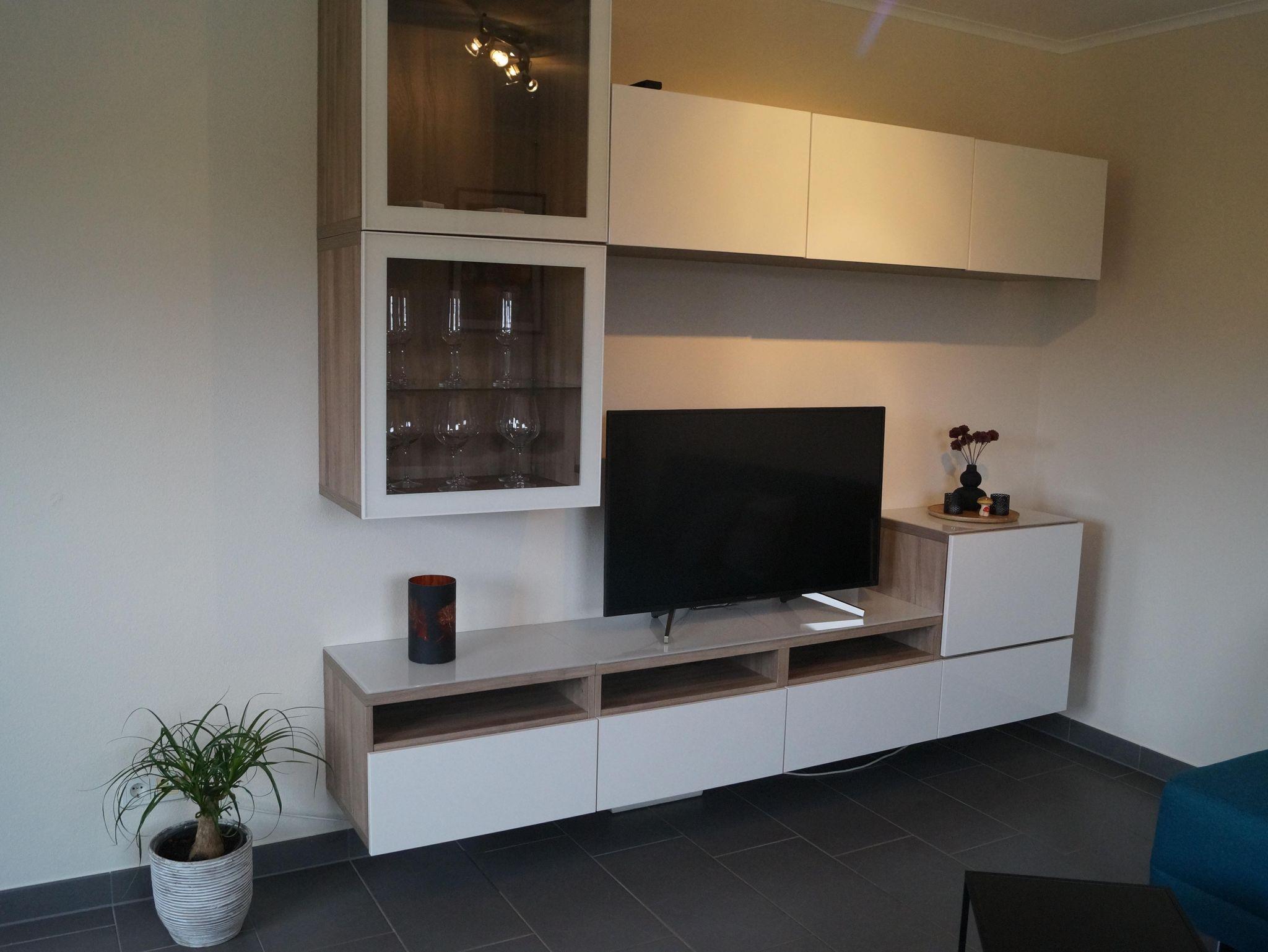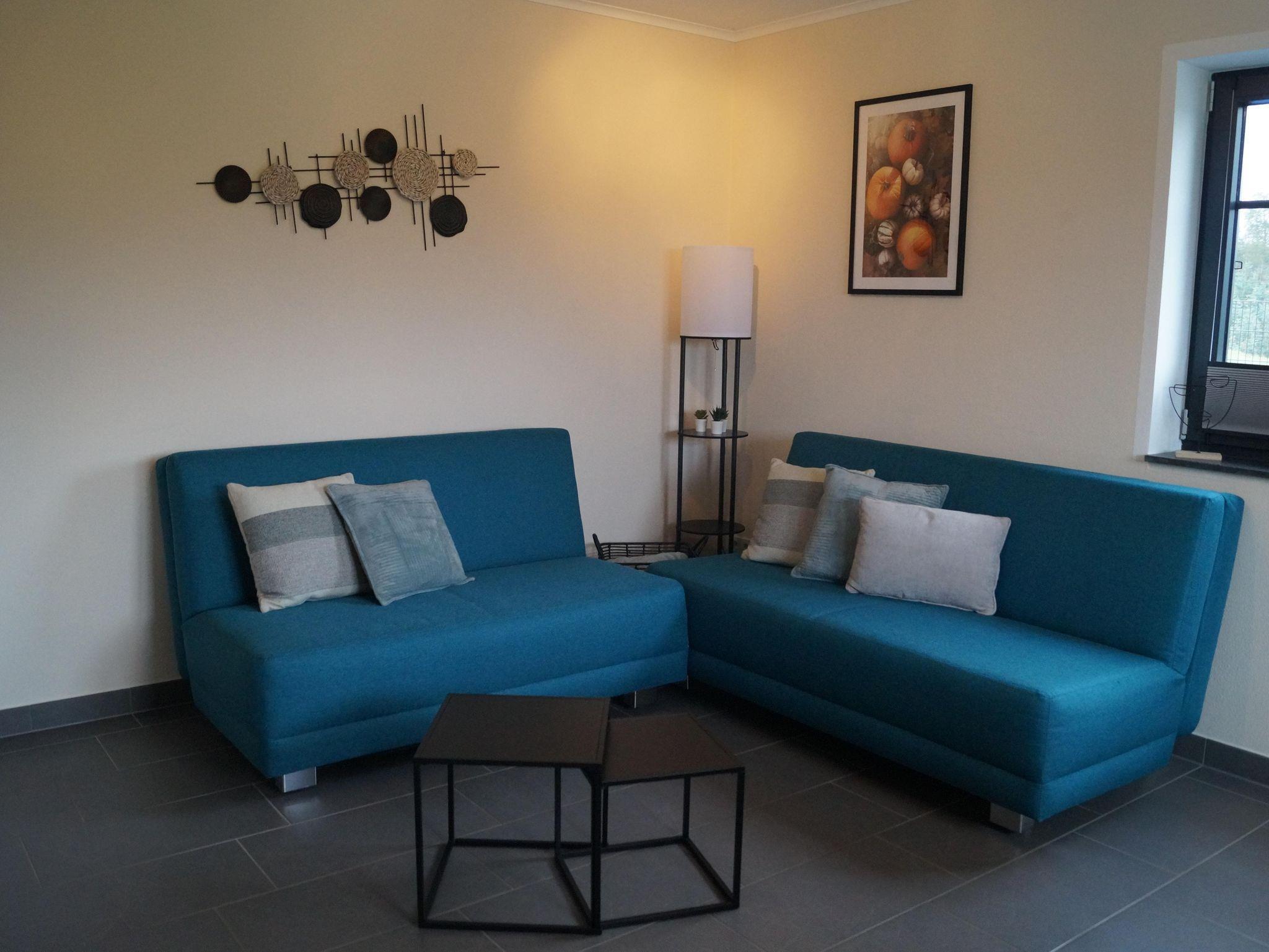 Im Wohnbereich steht ein großer Flachbildfernseher. Zwei Schlafcouchen bitten zusätzlichen Gästen noch Platz.