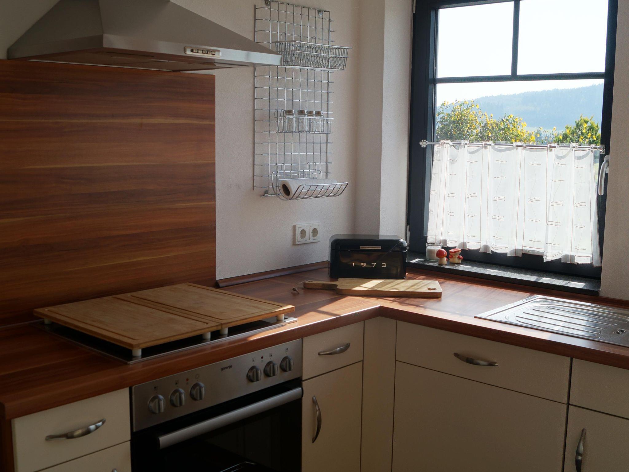 Voll ausgestattete Küche mit Herd, Backofen, Mikrowelle, Kühlschrank, kleines Gefrerfach, Spülmaschine, Kaffeemaschine, Toaster, Wasserkocher.