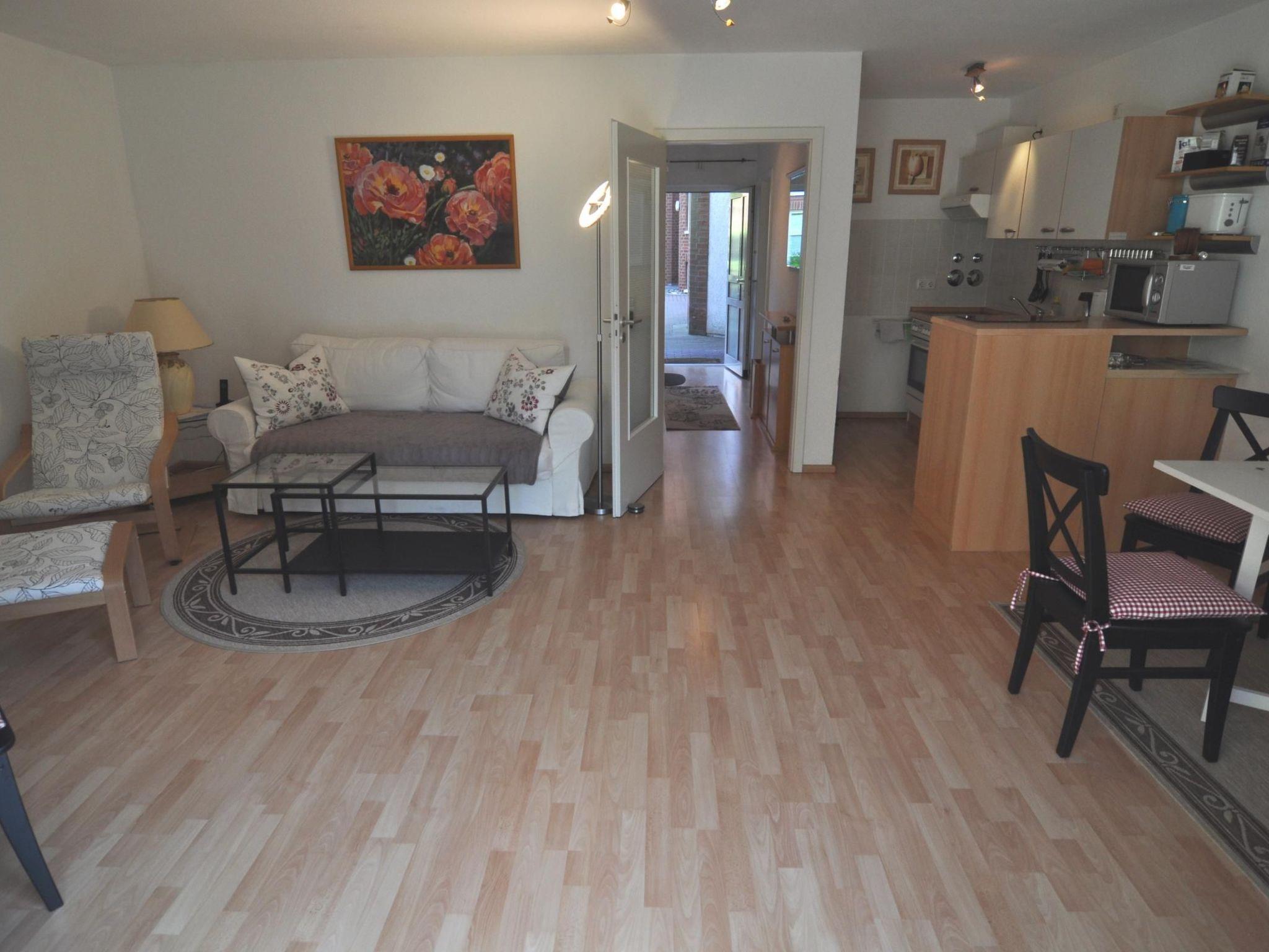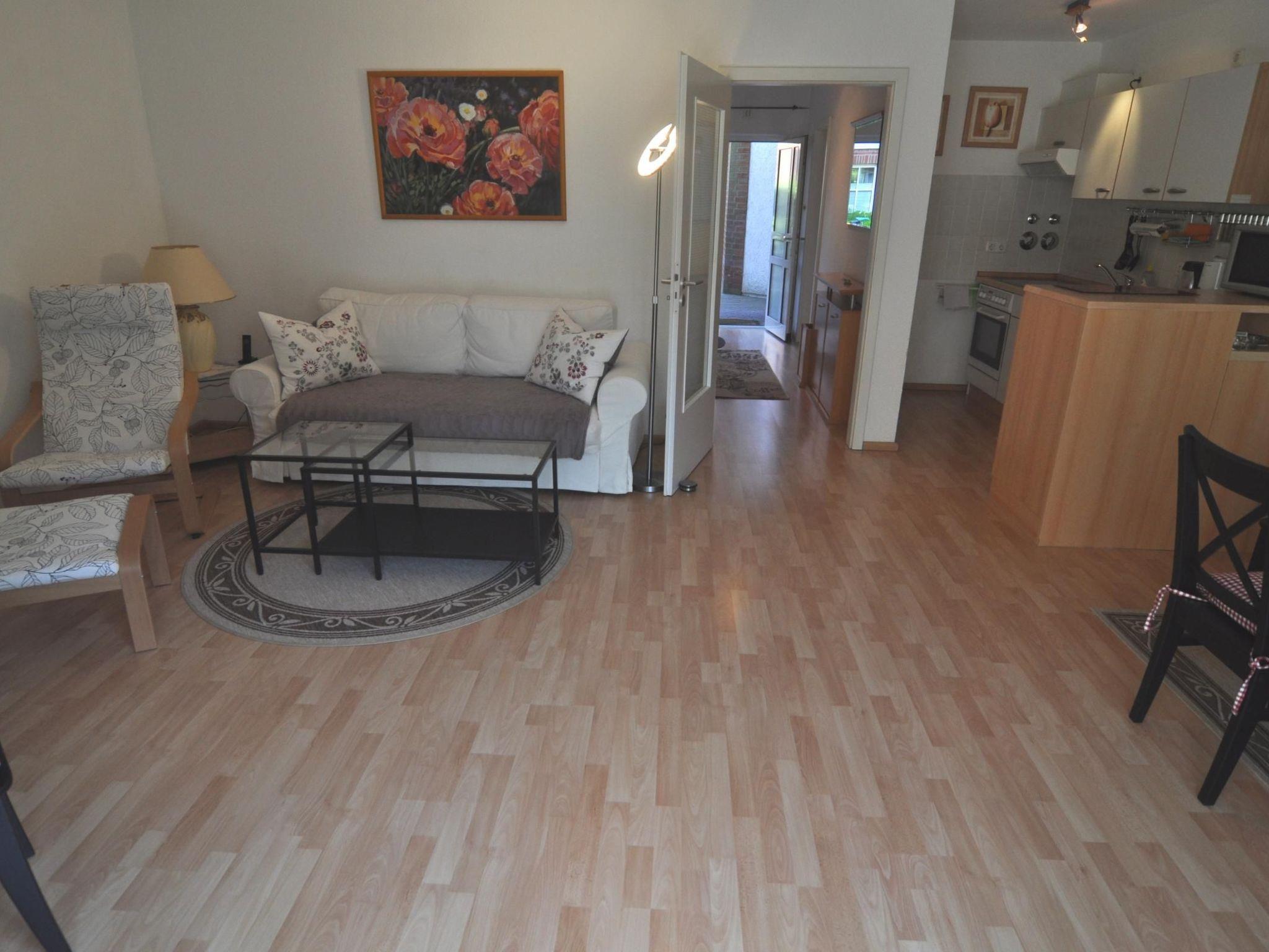 Spacious living room with integrated kitchen, dining area and direct access to the terrace. Bedroom with double bed with single mattresses measuring 100 x 200 cm and bedside tables, as well as a wardrobe. Outside window with blackout blind. Please bring your own bed linen. The kitchen is integrated into the living room and is equipped with everything you are used to at home, including - fridge with freezer compartment - cooker with ceramic hob and oven - microwave - kettle - coffee machine - dishwasher Bathroom with shower, washbasin, WC and an outside window.