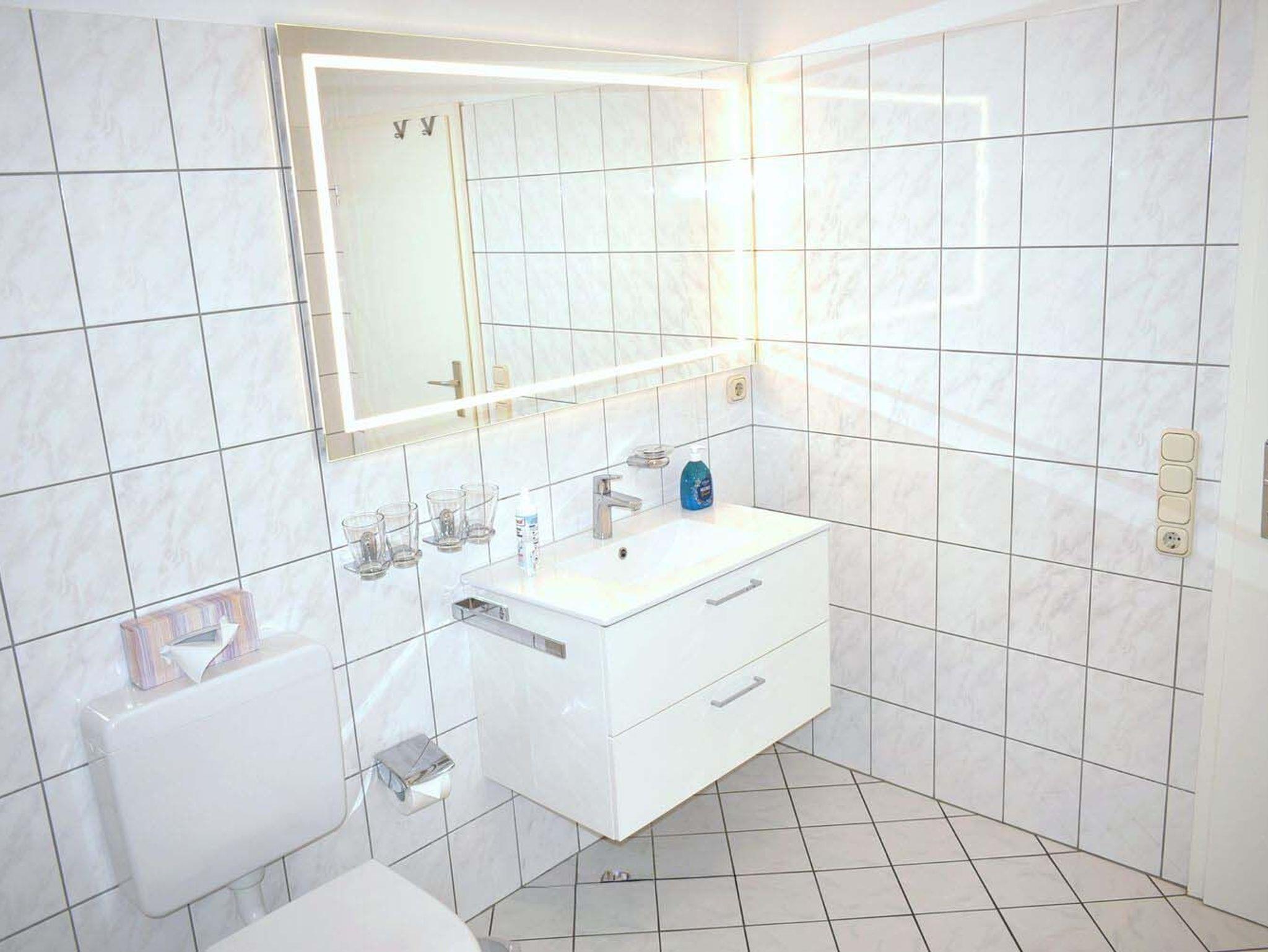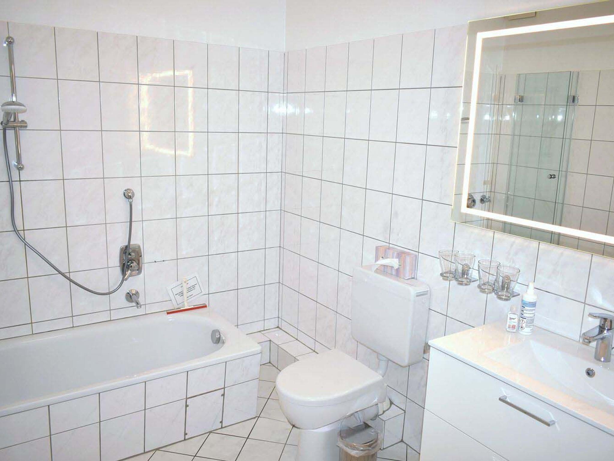 Bad 1: Badewanne, Duschkabine, Spiegel, Waschbecken, Waschbecken, WC