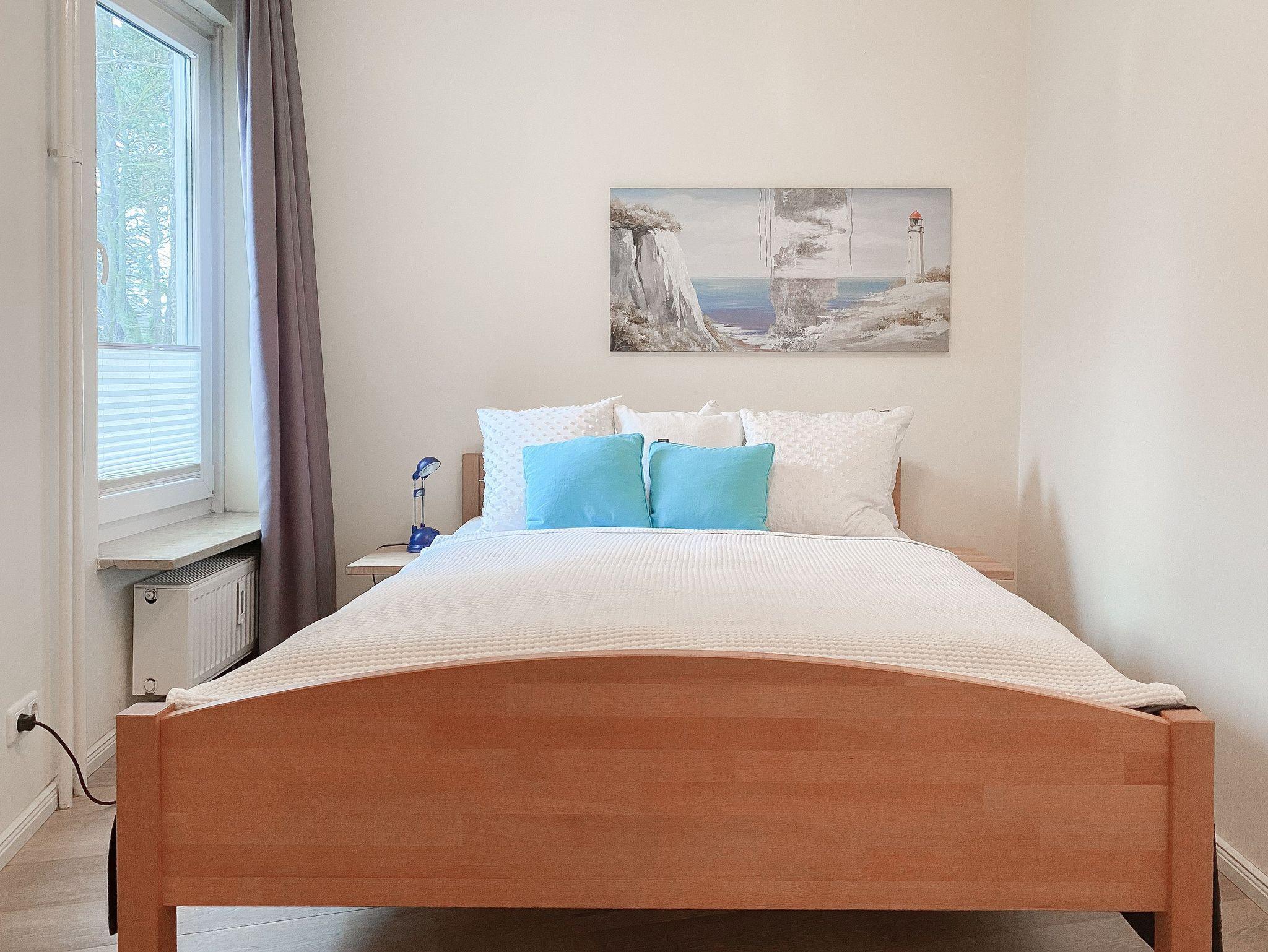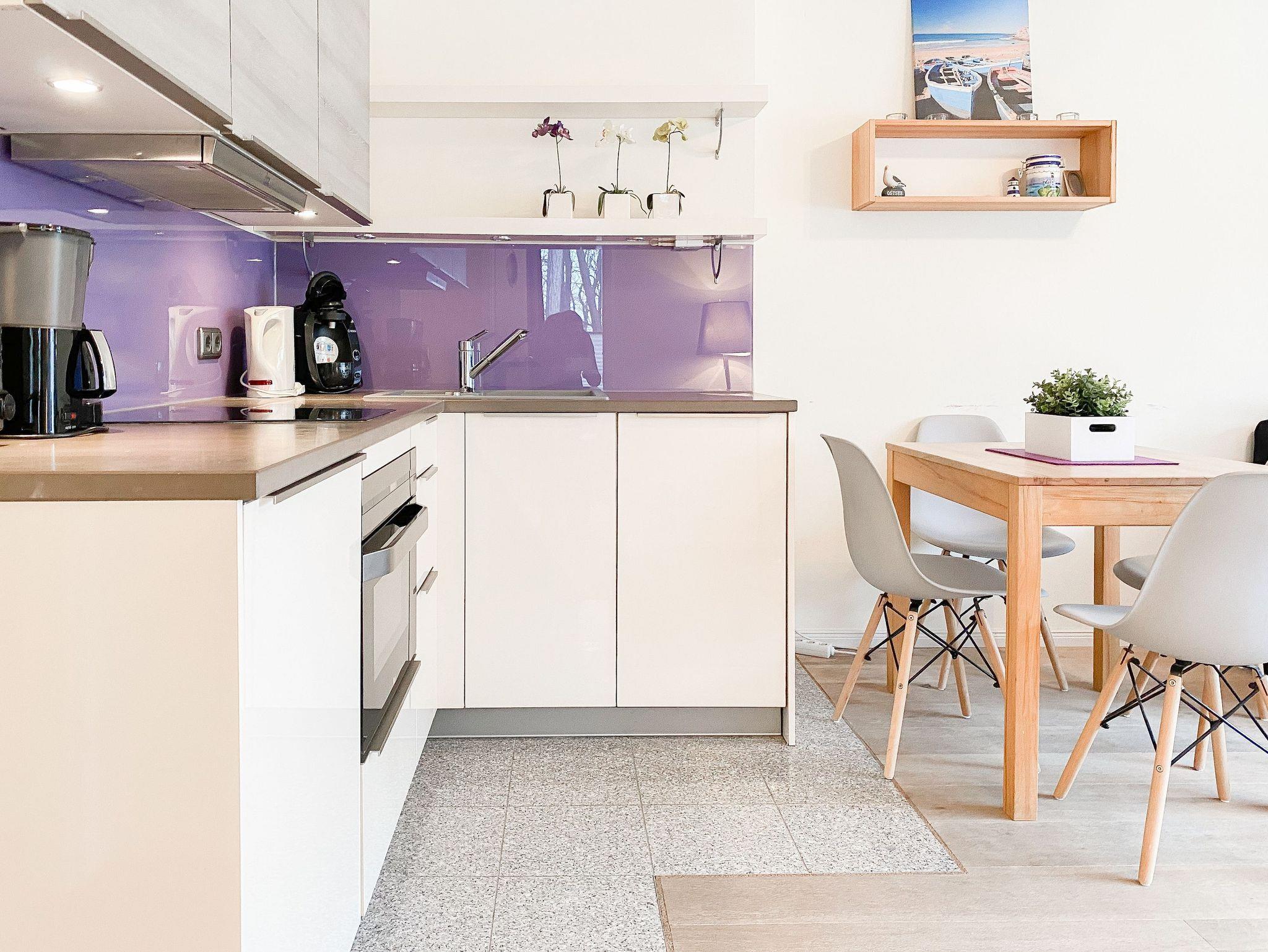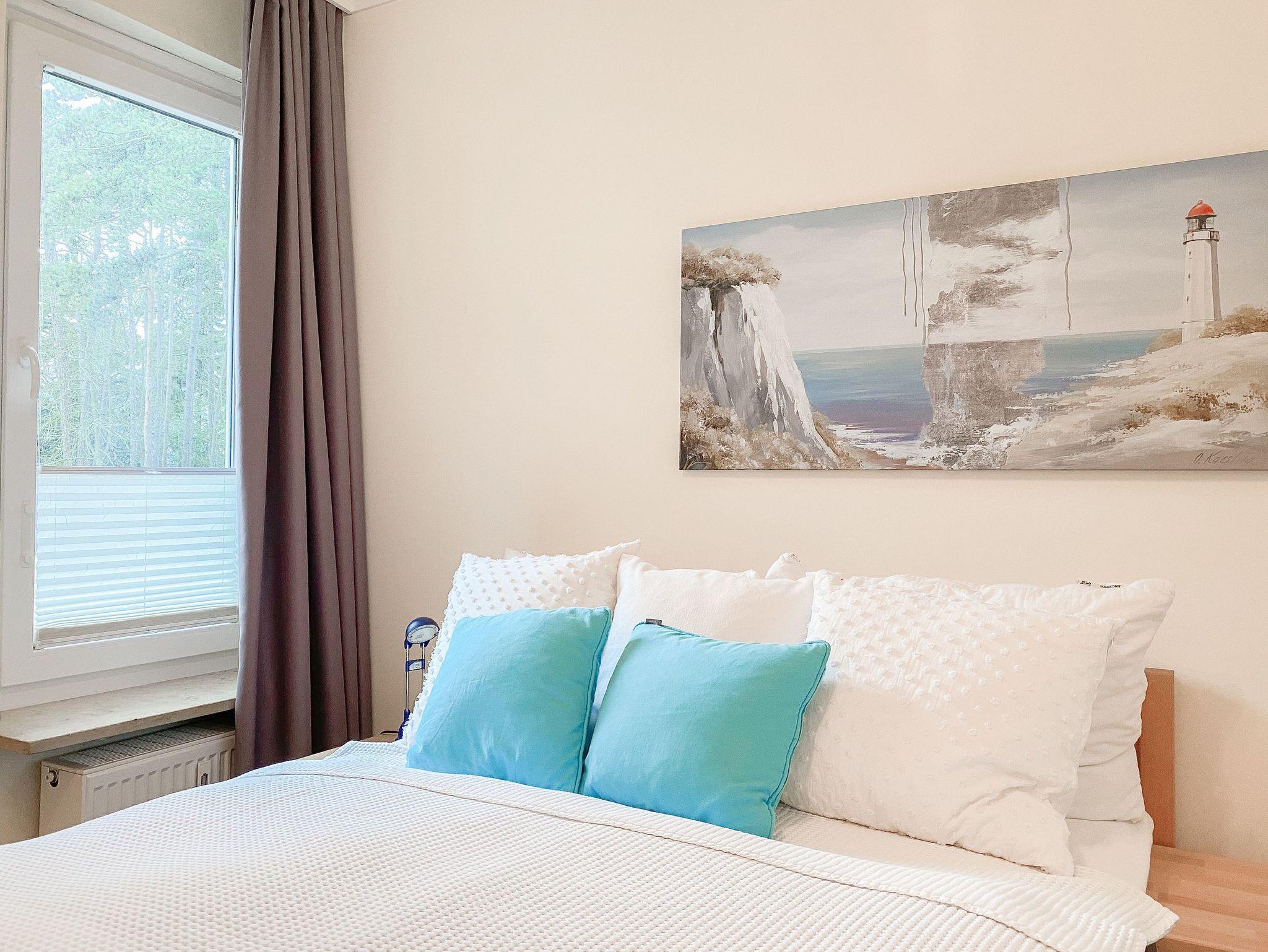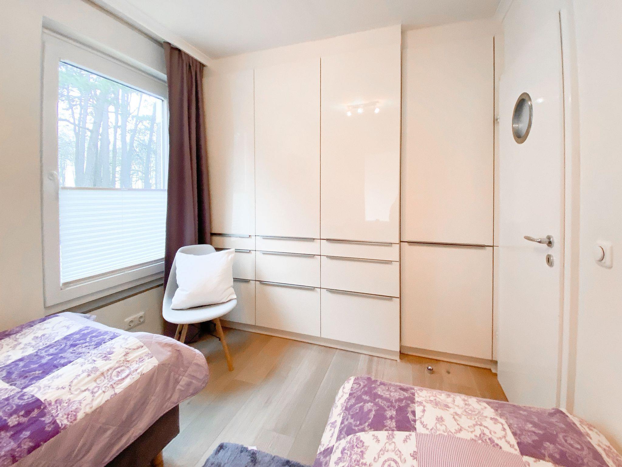 Die Ferienwohnung bietet mit 2 Schlafzimmern, ausgestattet mit Doppelbett (140x200) und zwei Einzelbetten (80x100), ausreichend Platz für maximal 4 Personen. Es erwartet Sie ein kombinierter Wohn- Essbereich mit gemütlichem Sofa, TV und WLAN sowie eine integrierte Einbauküche mit Kochfeld, Backofen, Spülmaschine und Mikrowelle. Der Sonnenbalkon ist mit einem kleinem Tisch und 2 Stühlen ausgestattet und vom Wohnzimmer aus zu betreten. Genießen Sie den schönen Ausblick bis zur Ostsee. Das[nbsp] Duschbad ist hochwertig und modern. Zur Wohnung gehört ein fester Tiefgaragenstellplatz (Einfahrtshöhe 1,95 m). Die gepflegte Wohnanlage verfügt über Fahrstühle, Münzwaschmaschine und Münztrockner und einen Fahrradkeller. Für die kleinen Gäste gibt es einen Spielplatz.