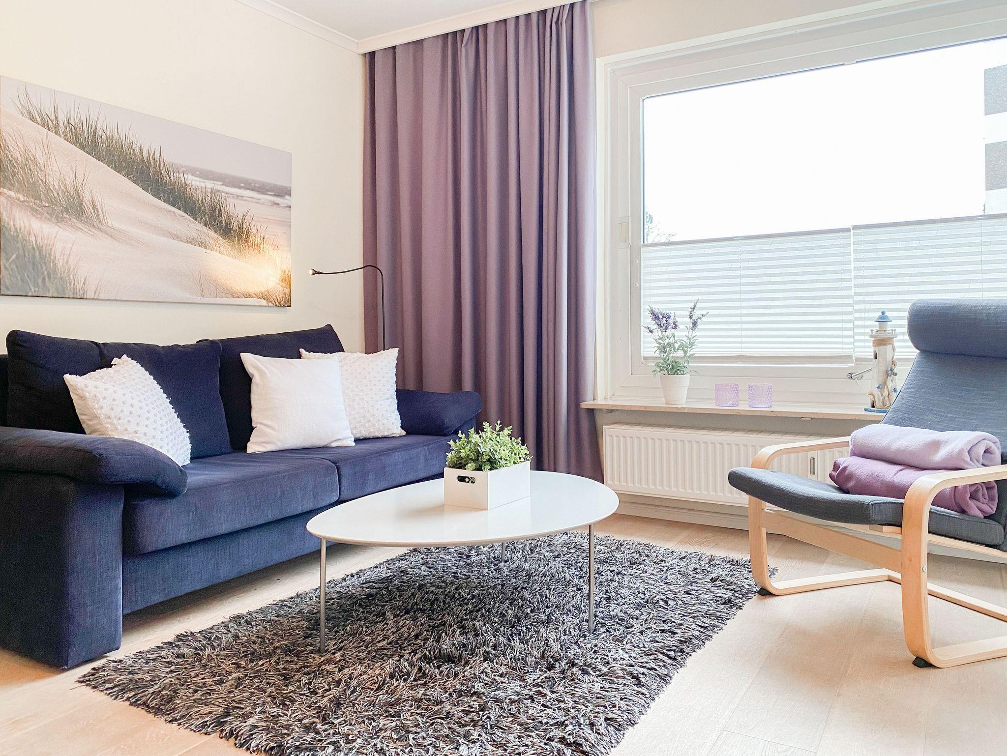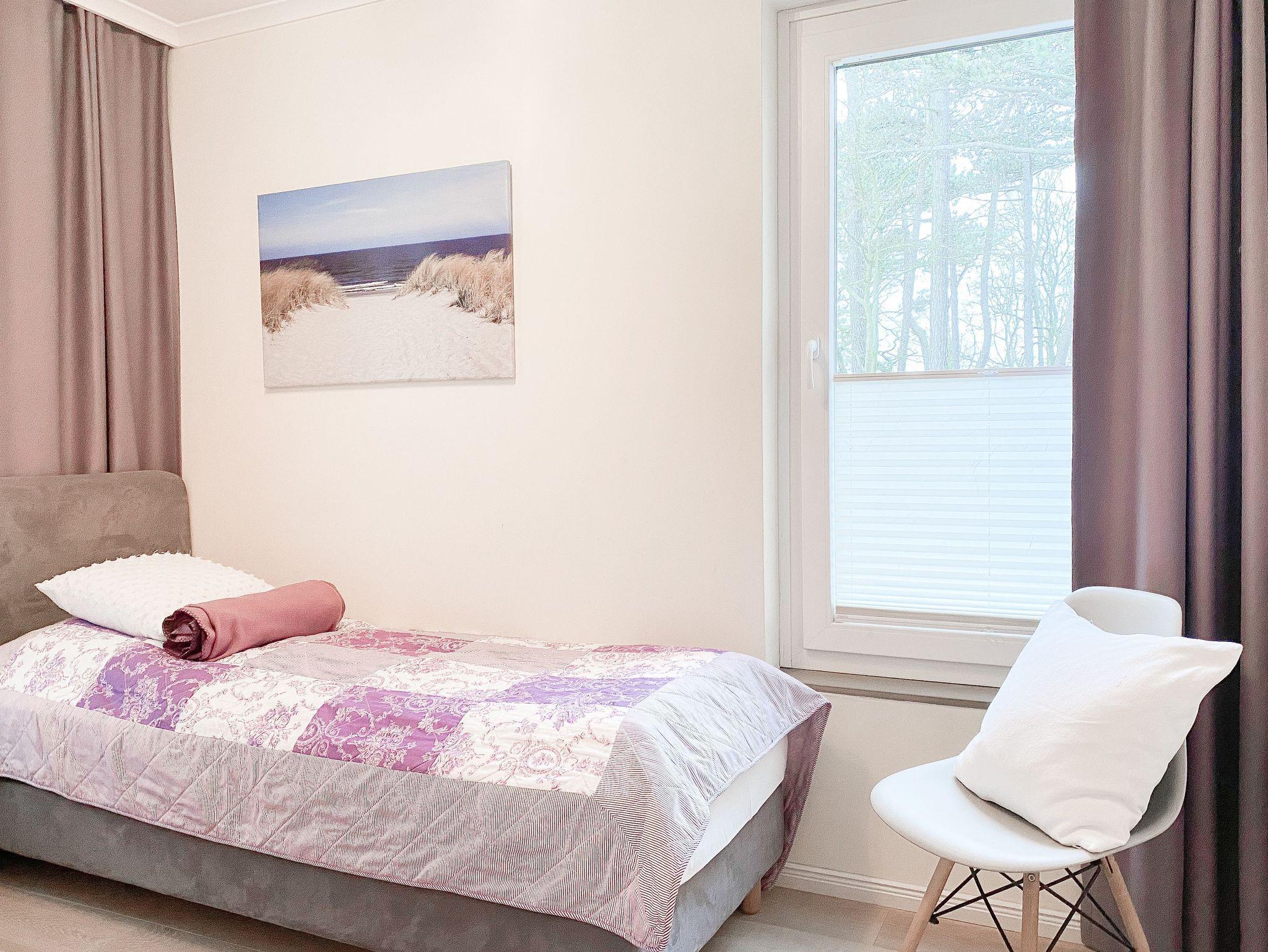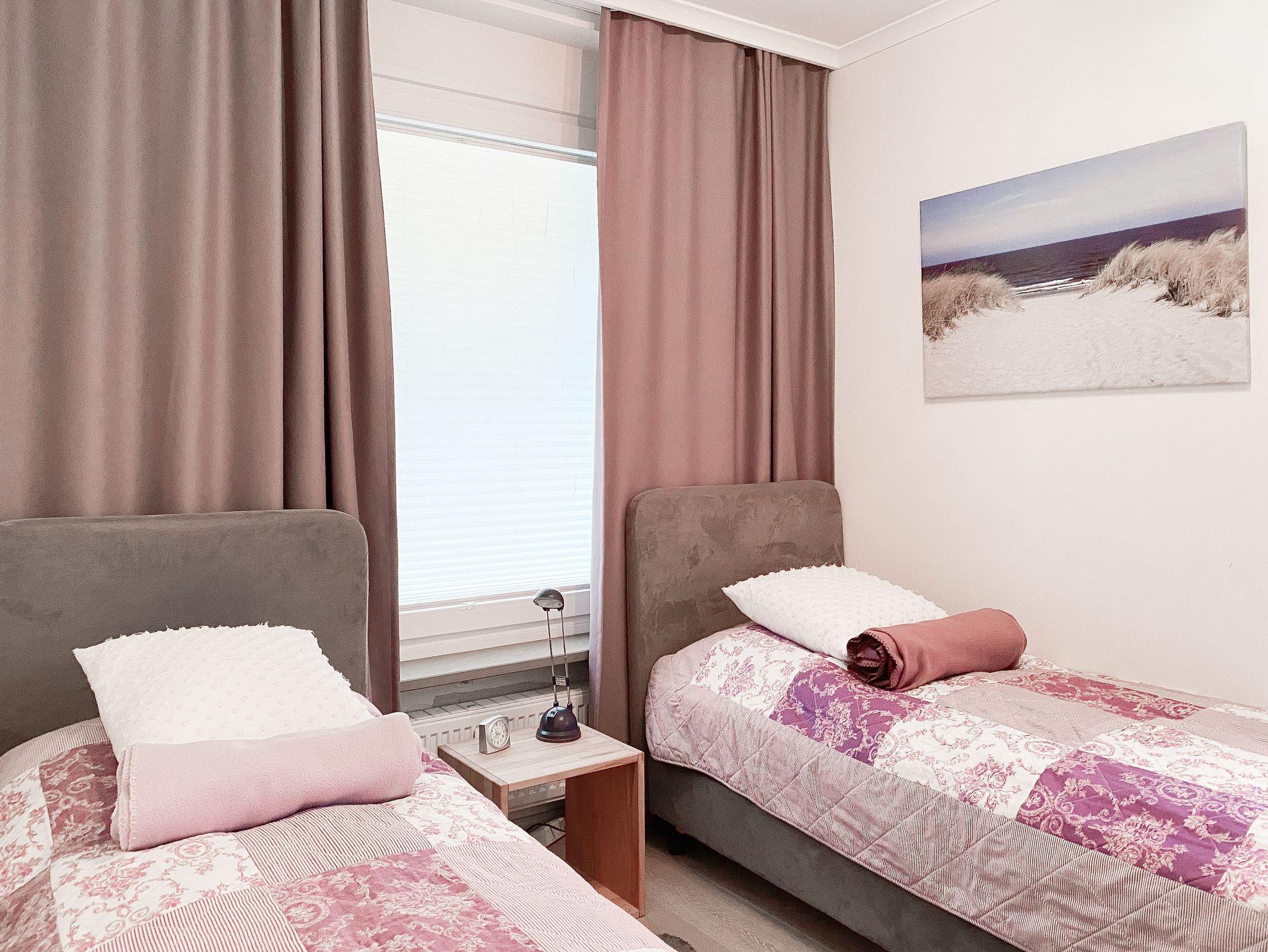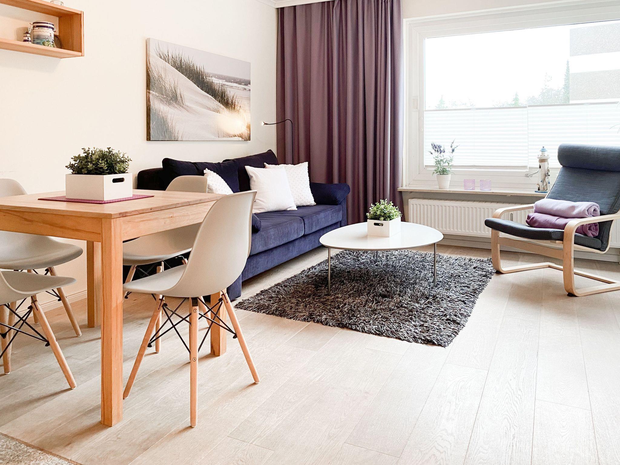 Die Ferienwohnung bietet mit 2 Schlafzimmern, ausgestattet mit Doppelbett (140x200) und zwei Einzelbetten (80x100), ausreichend Platz für maximal 4 Personen. Es erwartet Sie ein kombinierter Wohn- Essbereich mit gemütlichem Sofa, TV und WLAN sowie eine integrierte Einbauküche mit Kochfeld, Backofen, Spülmaschine und Mikrowelle. Der Sonnenbalkon ist mit einem kleinem Tisch und 2 Stühlen ausgestattet und vom Wohnzimmer aus zu betreten. Genießen Sie den schönen Ausblick bis zur Ostsee. Das[nbsp] Duschbad ist hochwertig und modern. Zur Wohnung gehört ein fester Tiefgaragenstellplatz (Einfahrtshöhe 1,95 m). Die gepflegte Wohnanlage verfügt über Fahrstühle, Münzwaschmaschine und Münztrockner und einen Fahrradkeller. Für die kleinen Gäste gibt es einen Spielplatz.