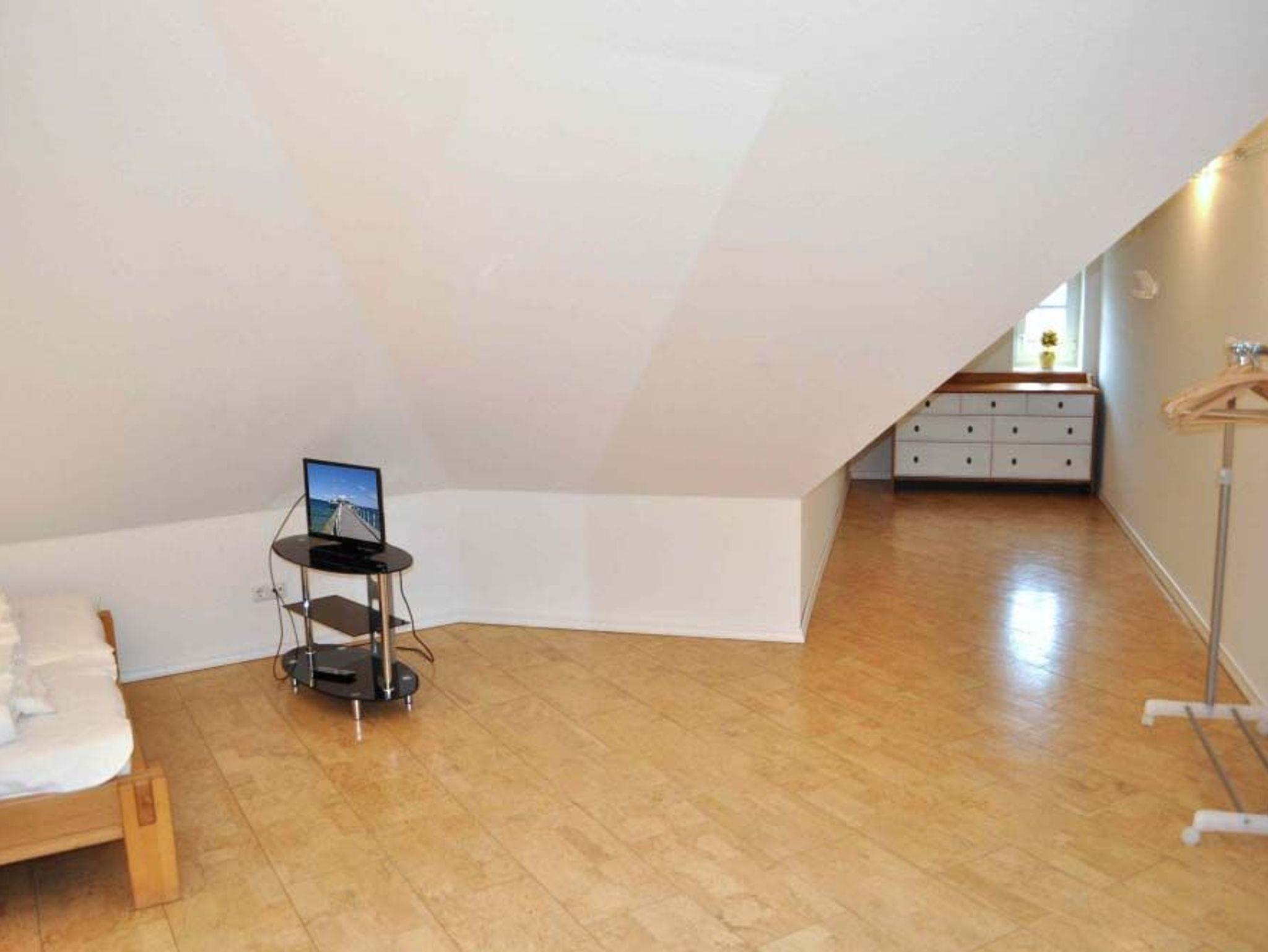 Schlafzimmer 2: Anrichte, Beistelltisch, Doppelbett 2,00 x 1,60 m, Flachbildschirm, Hocker, Kabel-TV, Kindersicherung am Geländer, Kleiderstange, Sessel, Stehlampe, Treppe nach unten, TV-Rolltisch