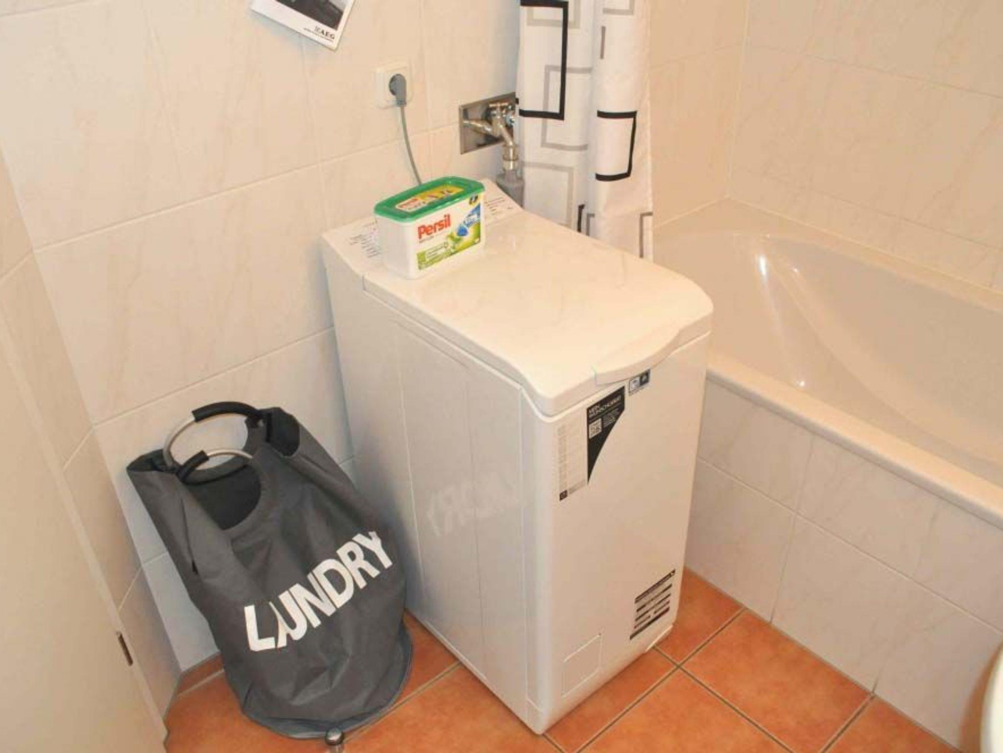 Bad 1: kleiner Schrank, Spiegel, Wanne, Waschbecken, Waschmaschine, WC