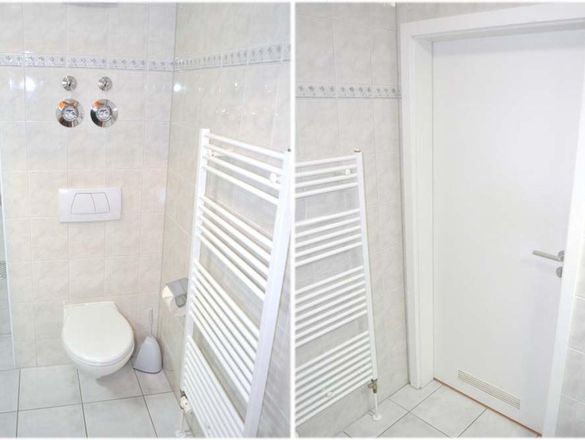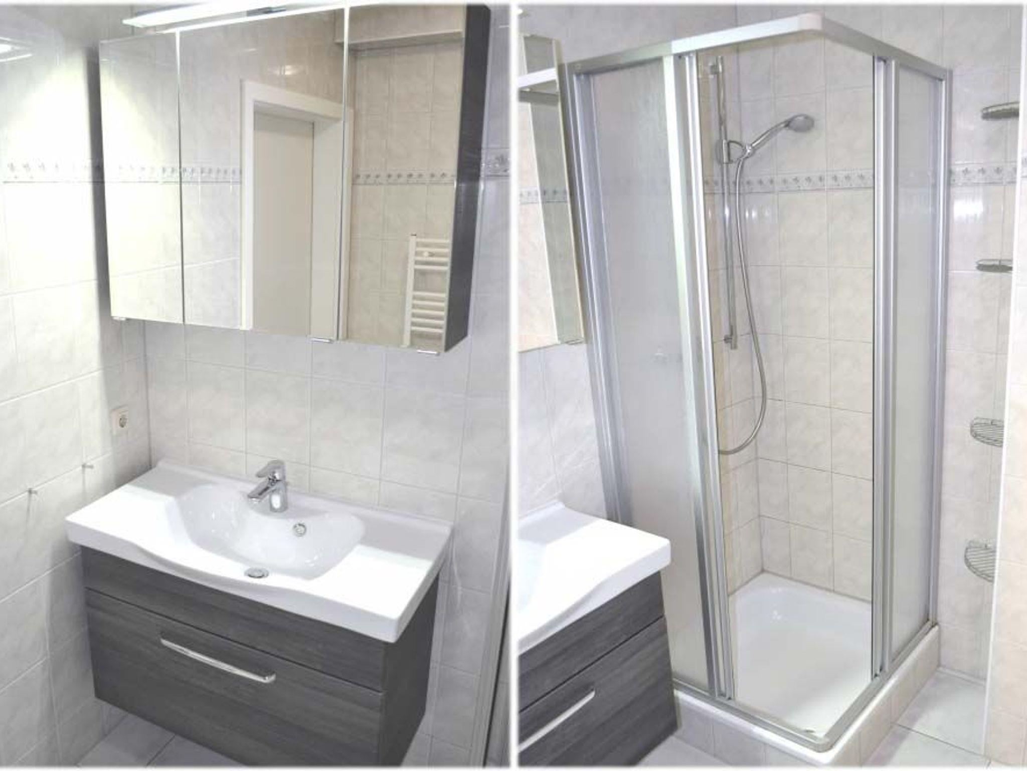 Bad 1: Dusche, Duschkabine, Fön, Schrank, Spiegelschrank, Waschtisch, WC