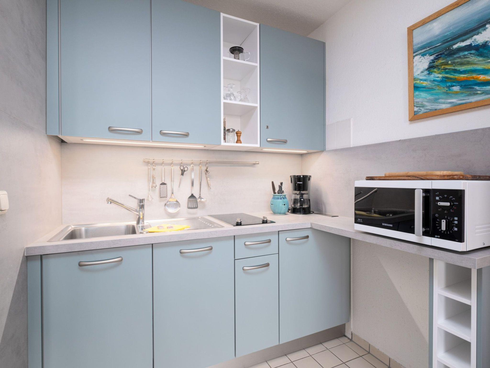 Das schöne Appartement Nr. 3 ist 30m² groß und für bis zu 2 Personen eingerichtet. Es befindet sich im Erdgeschoss und hat vom Balkon aus einen hervorragenden Meerblick. Die Ferienwohnung ist ganz praktisch eingerichtet - alles ist im Wohnzimmer vorhanden.