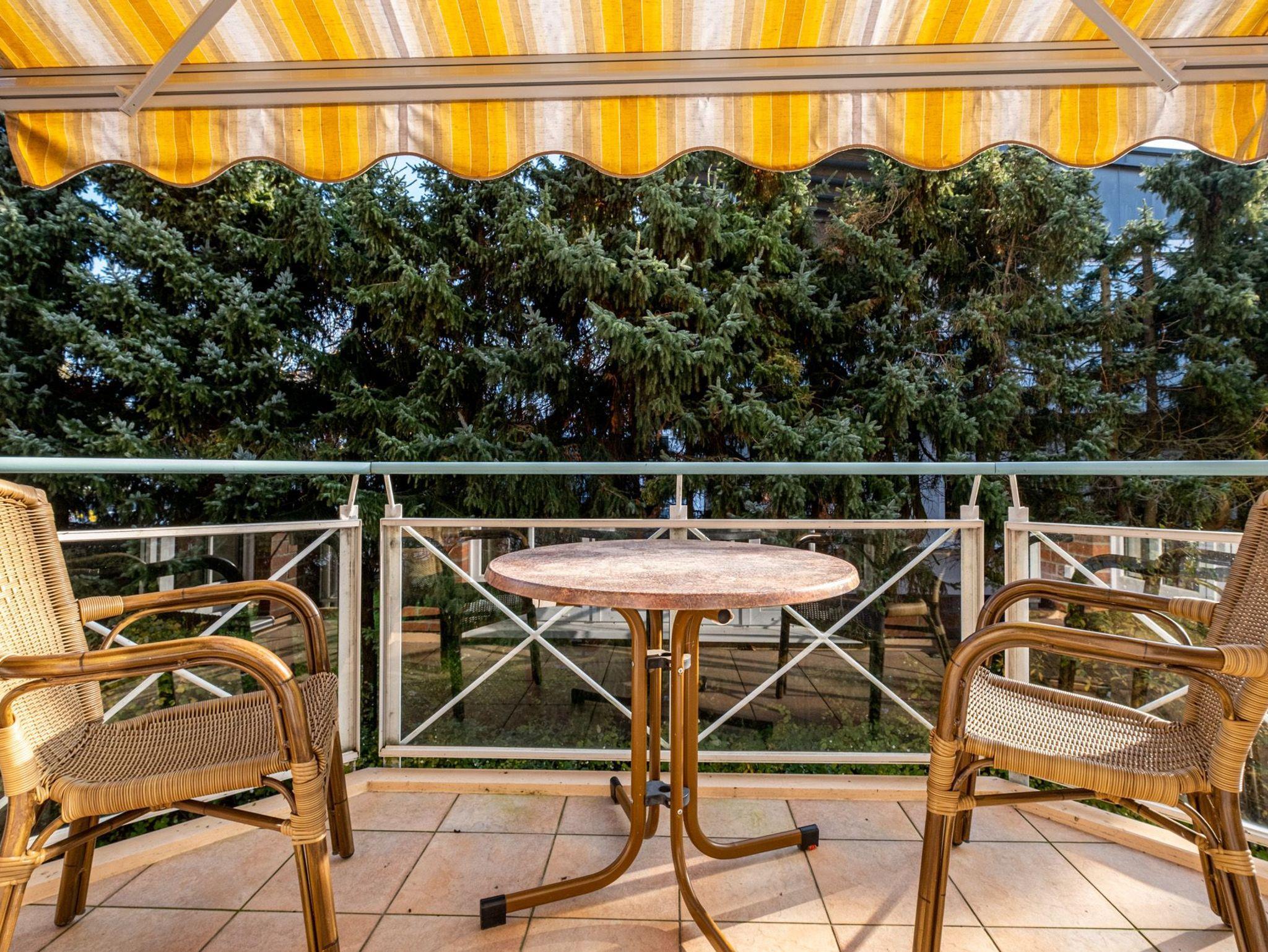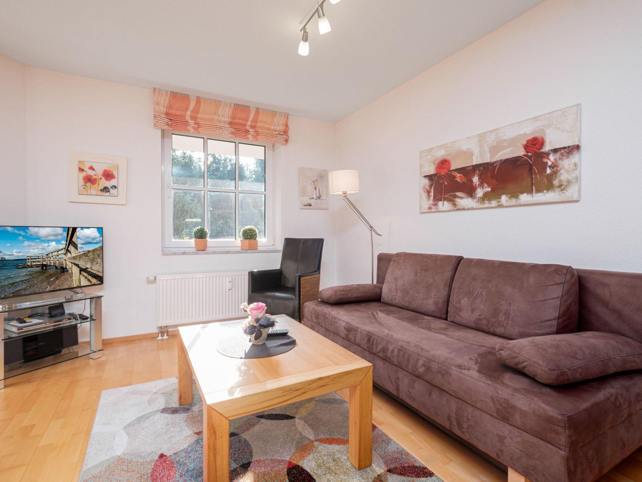 Im Wohnraum befindet sich eine bequeme Schlafcouch (140 cm x 200 cm) mit Kabel-TV, DVD-Player und HiFi-Anlage sowie eine Essecke und der Zugang zum nach Osten ausgerichteten Balkon mit Markise.