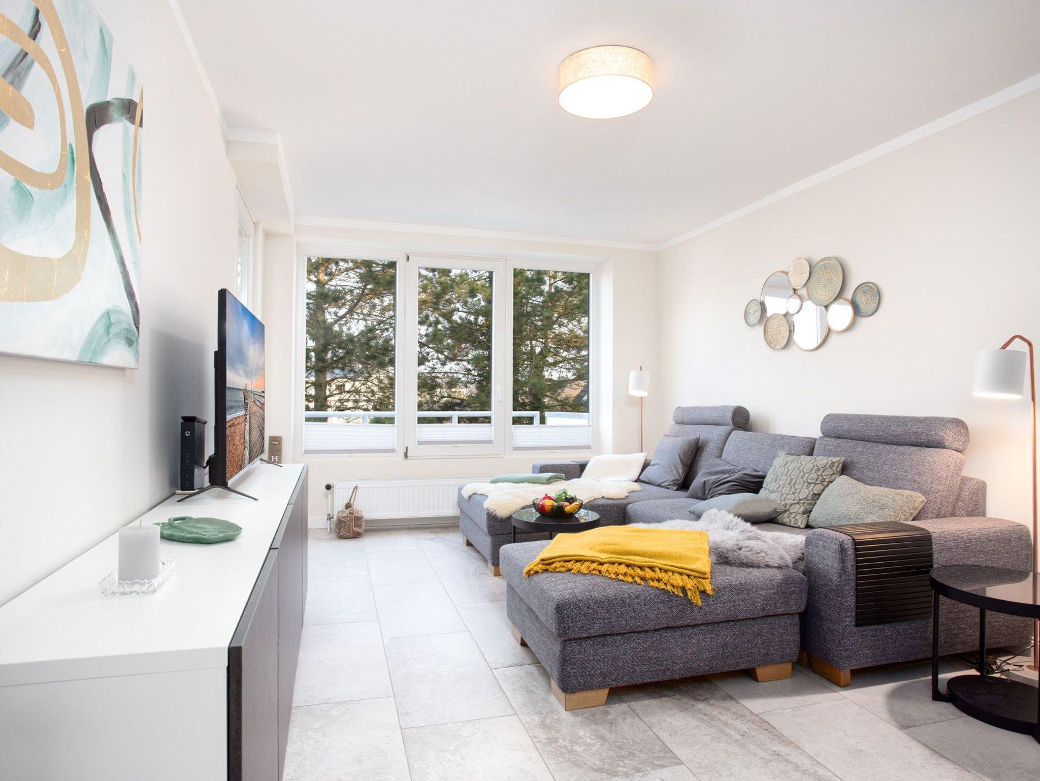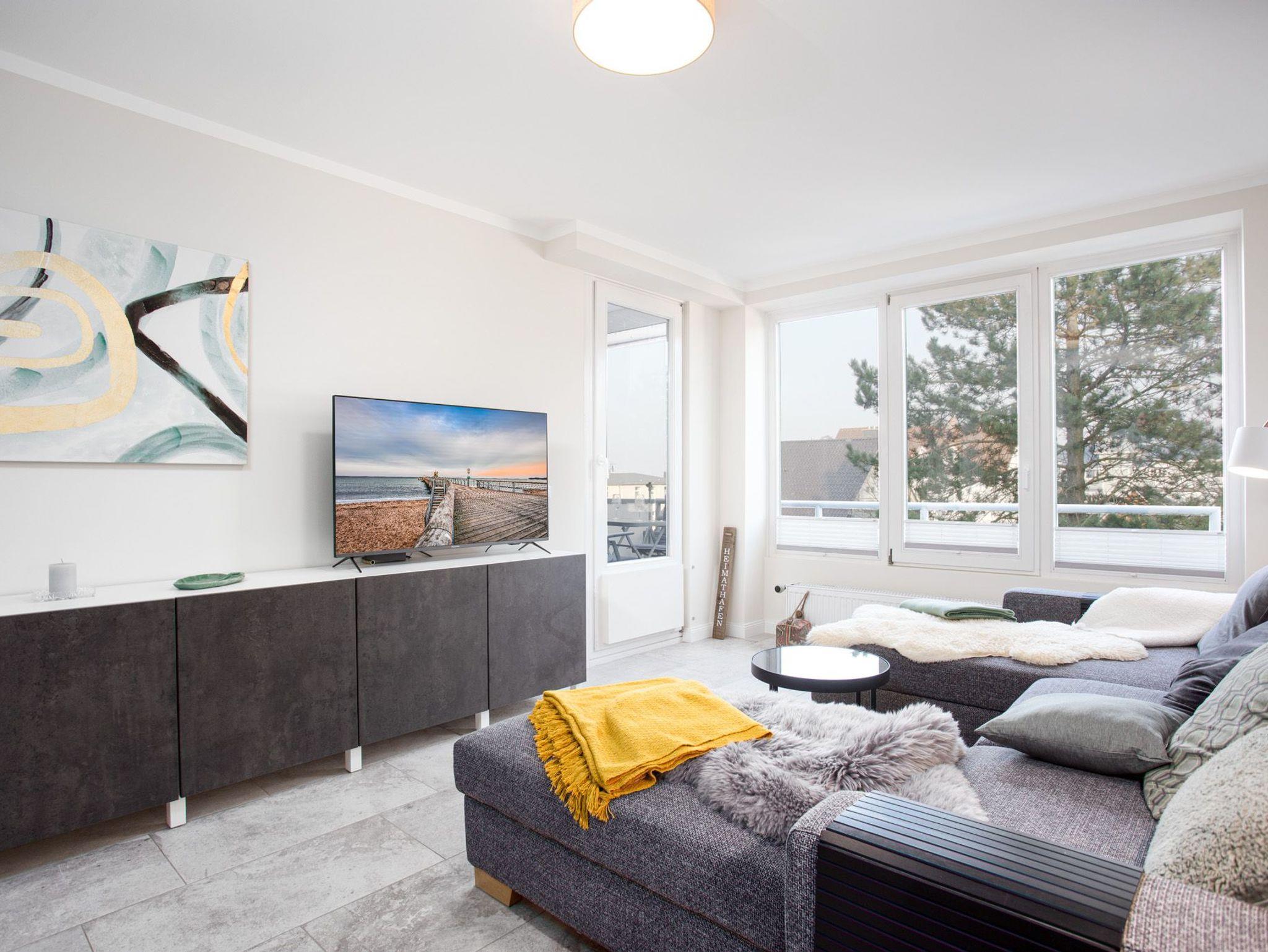 Im Wohnzimmer bietet die bequeme Schlafcouch (120 cm x 220 cm) einen Schlafplatz sowie einen Smart-TV.