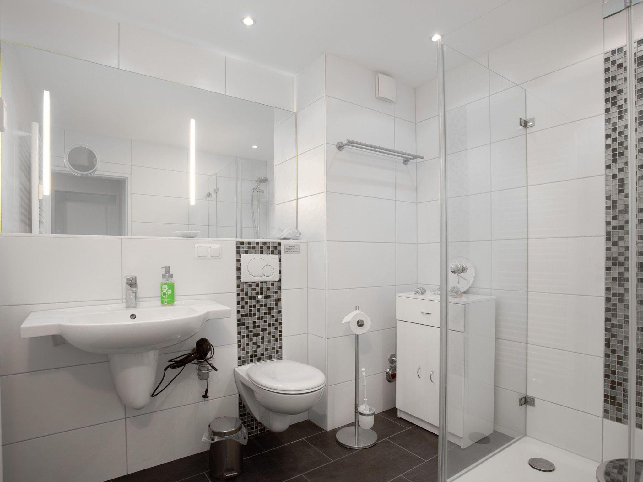 Im separaten Schlafzimmer mit Doppelbett (180 cm x 200 cm) können bis zu 2 Personen einen Schlafplatz finden. Das moderne Badezimmer verfügt über eine Dusche, WC Handtuchtrocknerheizung und einen Fön.